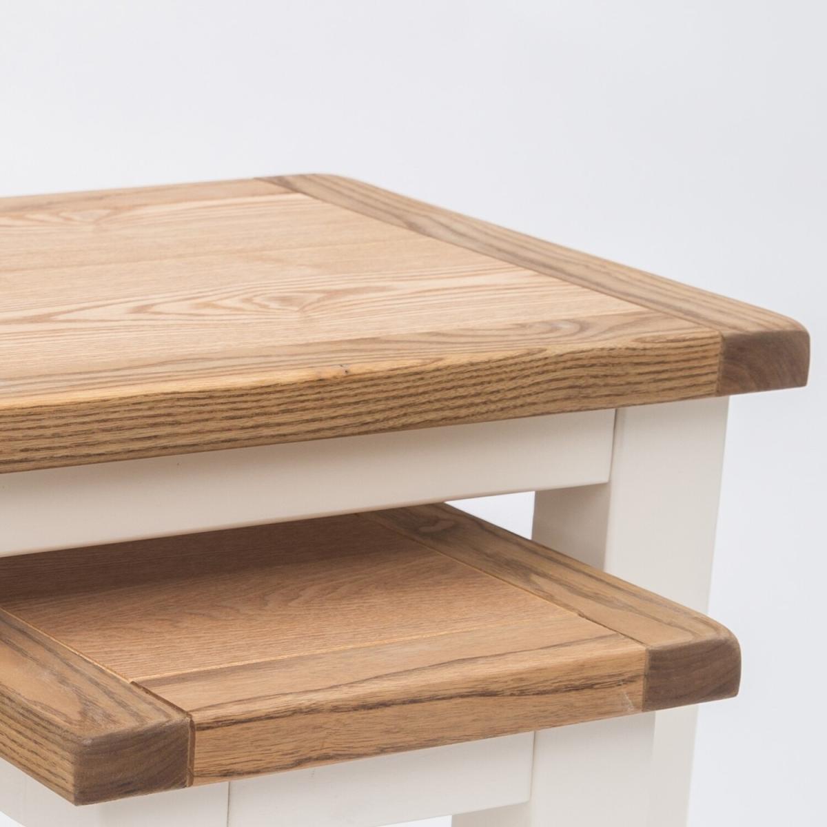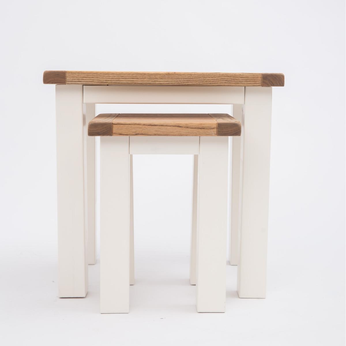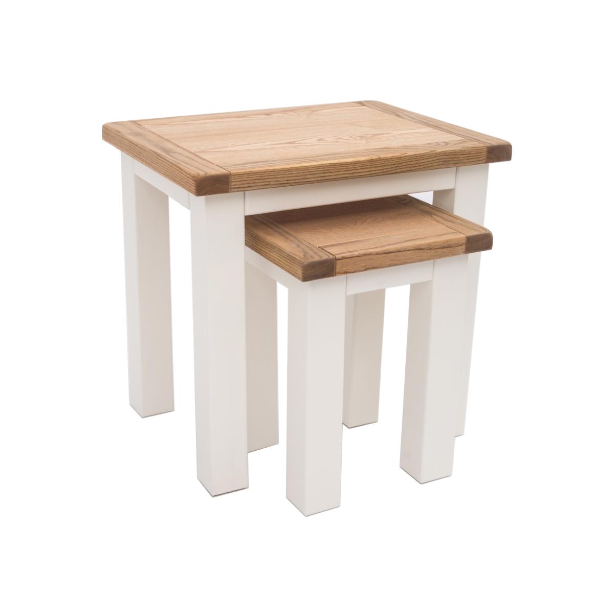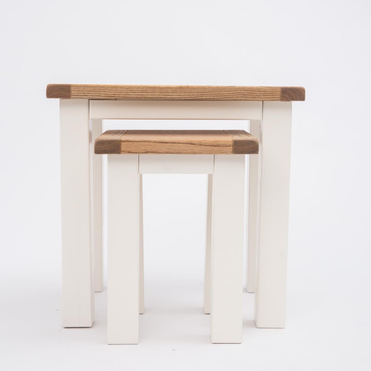 Our Lovere collection has a simple but pleasing design and is produced by our skilled craftsmen to the highest standards using responsibly sourced wood and veneers. All tops are made using a combination of hardwood and ash veneer and are carefully hand-waxed giving them a great look. The body is finished with high-quality eco-friendly water-base paint in an off-white colour. This nest of 2 tables comes in two very handy sizes that will fit and complement any space. These attributes combined with a simple construction for easy assembly make it a great value product to be taken home today.