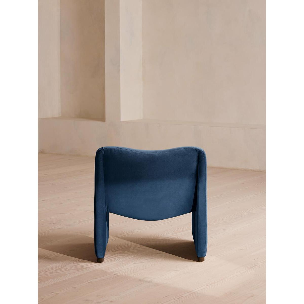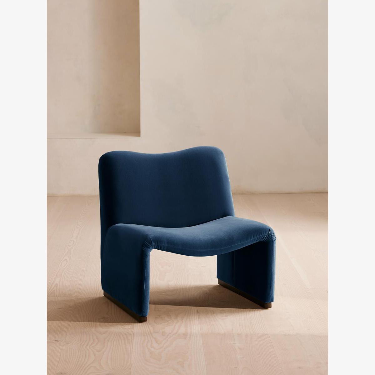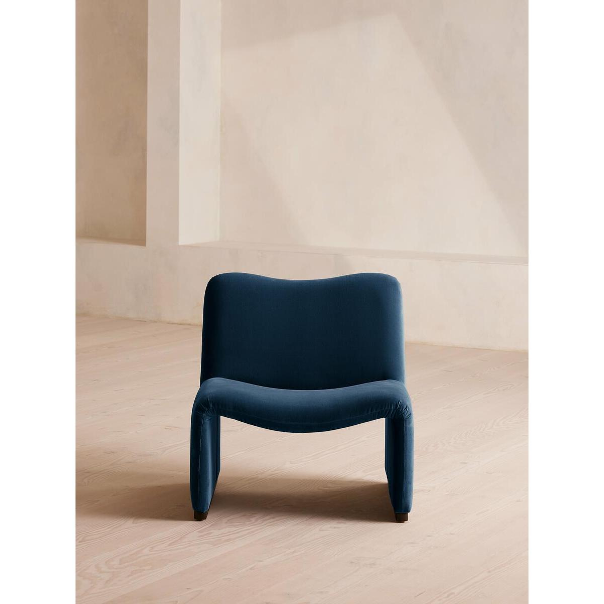 I’d call this the Lovett chair - its deep royal-blue velvet and low-slung profile make it an ideal accent in contemporary or mid-century living rooms. The colour works particularly well against neutral walls or alongside pale woods, where it instantly adds depth without overwhelming the scheme. For styling, balance its sculptural shape with a simple side table in brass or blackened metal and a chunky wool throw in a complementary tone. Keep surrounding accessories minimal - a low-profile floor lamp or a single art print will let the chair remain the focal point while still feeling inviting and practical.