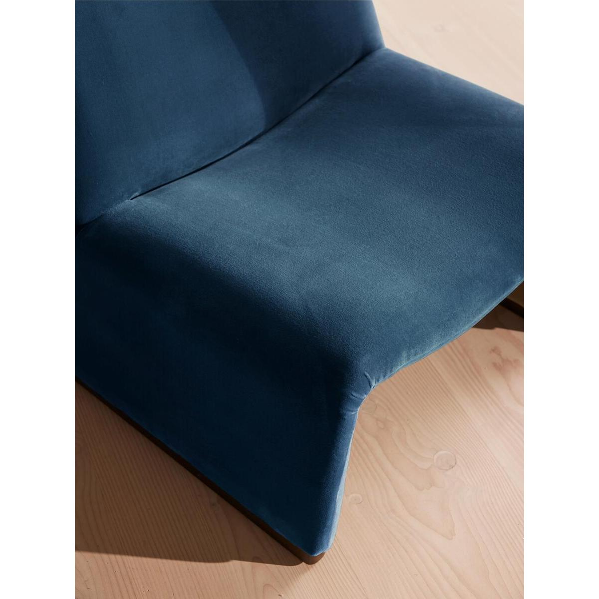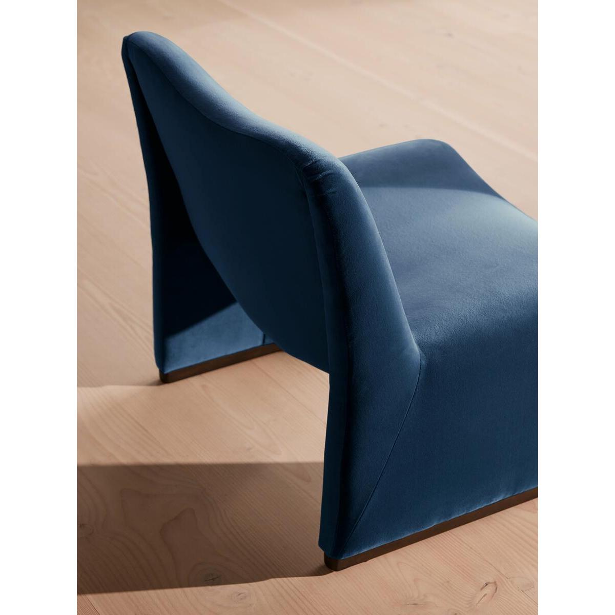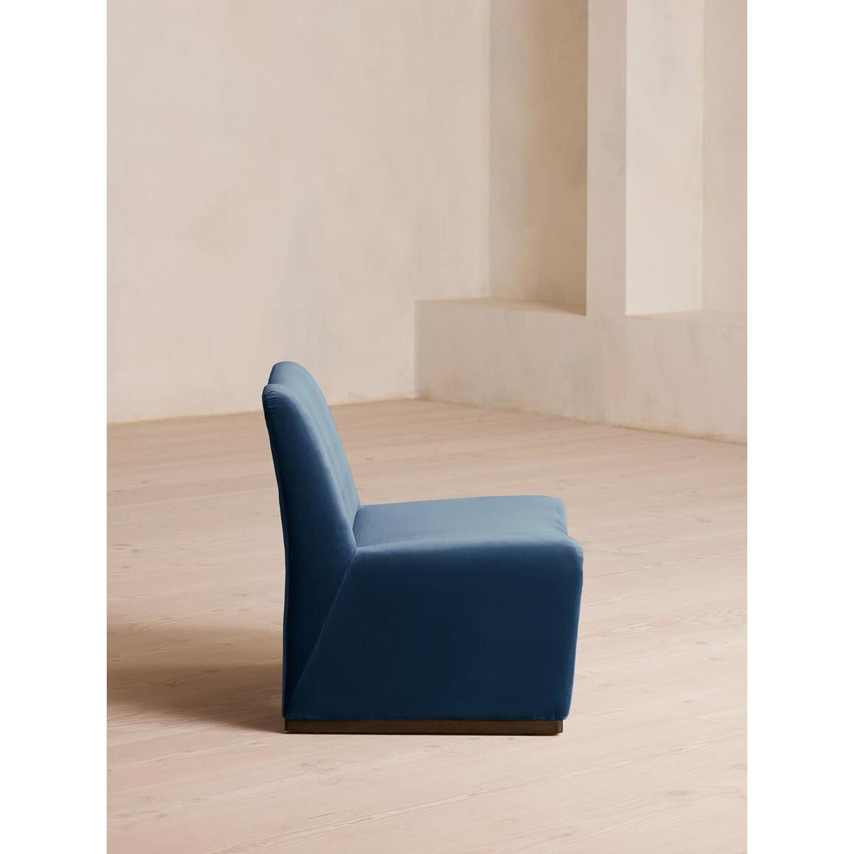 I’d call this the Lovett chair - its deep royal-blue velvet and low-slung profile make it an ideal accent in contemporary or mid-century living rooms. The colour works particularly well against neutral walls or alongside pale woods, where it instantly adds depth without overwhelming the scheme. For styling, balance its sculptural shape with a simple side table in brass or blackened metal and a chunky wool throw in a complementary tone. Keep surrounding accessories minimal - a low-profile floor lamp or a single art print will let the chair remain the focal point while still feeling inviting and practical.
