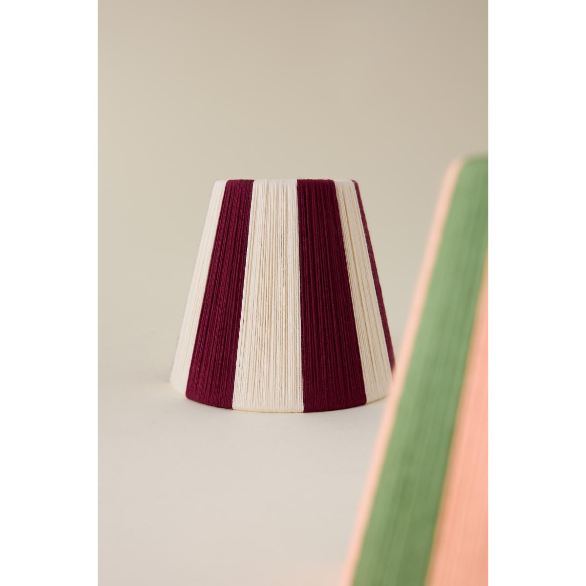 This lovely lamp shade is made entirely by hand from 100% cotton yarn, tightly wound around a powder-coated steel frame. Patterned with playful contrasting stripes in a rainbow of colours, it makes an eye-catching accent to light up your home. * By Loving String * Handwoven: 100% Cotton yarn, steel frame * Treated with a fire retardant spray * The brand recommends an LED or 40 watt max. bulb * A candle shape bulb is required * Clip-on fitting * Perfect for a petite wall light * Made in UK