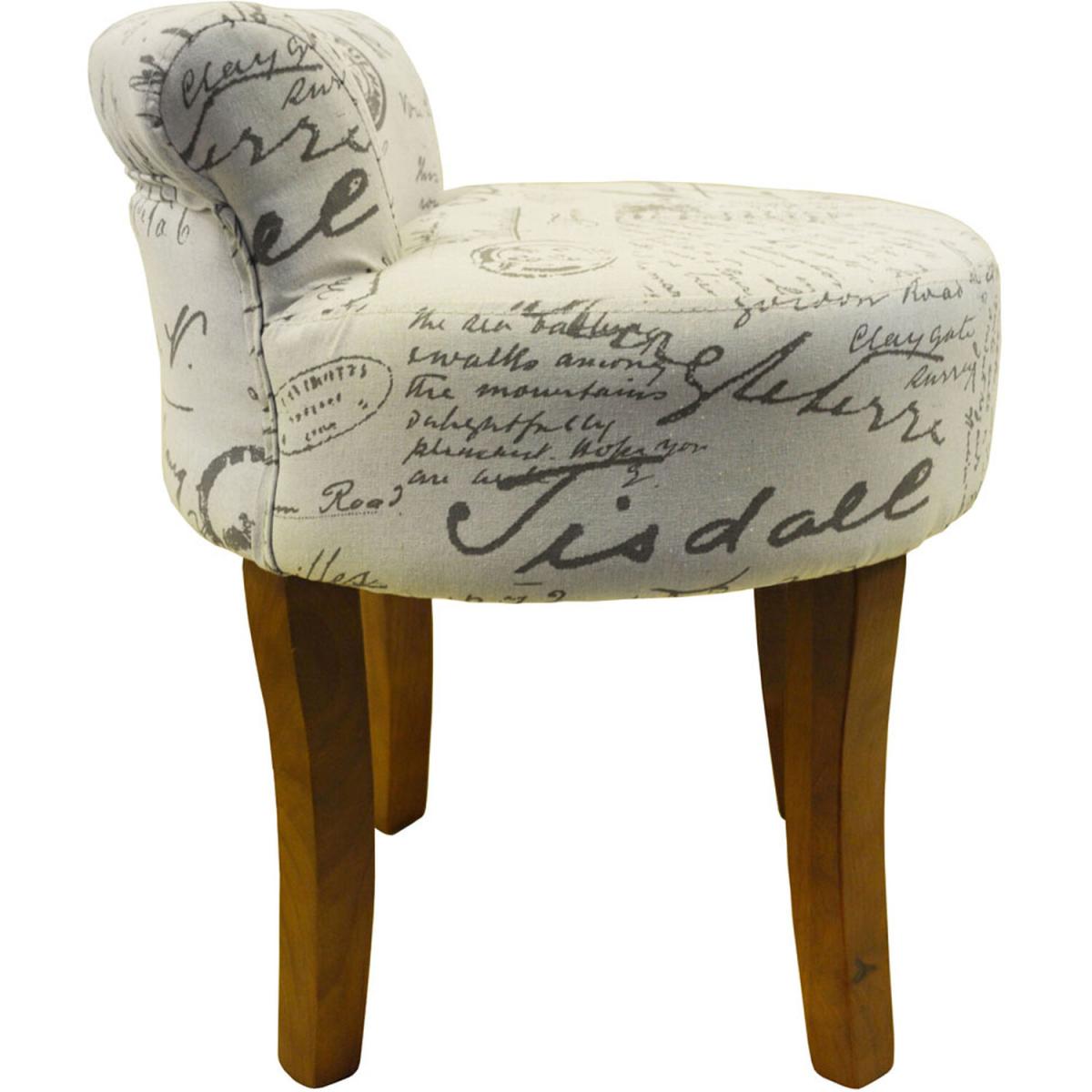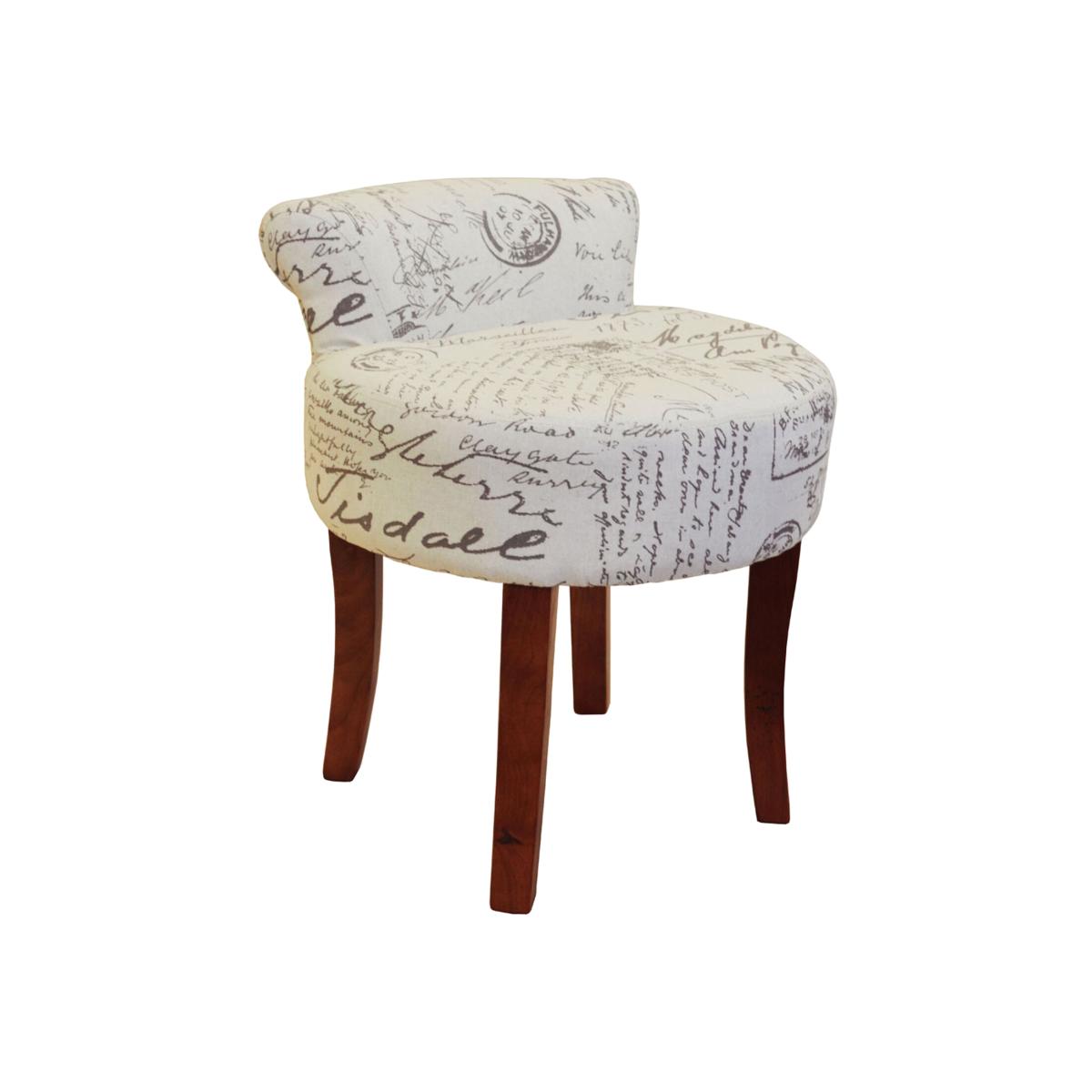 Low Back Chair Padded Stool with Retro French Print and Wood Legs - Cream / Brown / Script design