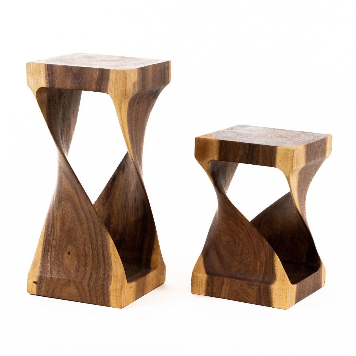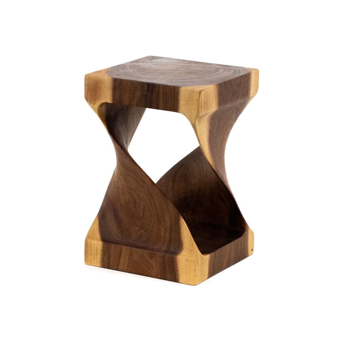 Handcrafted low timber cubic side table. Rustic in design, the low cubic side table is handcrafted from a singular piece of Suar timber. Featuring a stunning natural dual tone finish and sculptural twist design. Perfect for use in lounges, hallways and bedrooms.