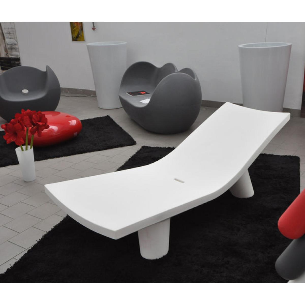 "Low Lita is the fruit of the collaboration between Slide and the famous Italian designer Paola Navone. This deckchair with a "" lounge "" spirit is ideal to create an original relaxation place on its terrace, garden or living-room. Completely realized in polyethylene, this deckchair is characterized by its original and playful legs which remind furniture for children. The round and massive feet, like wooden logs, contrast with the pure lines of the seat.