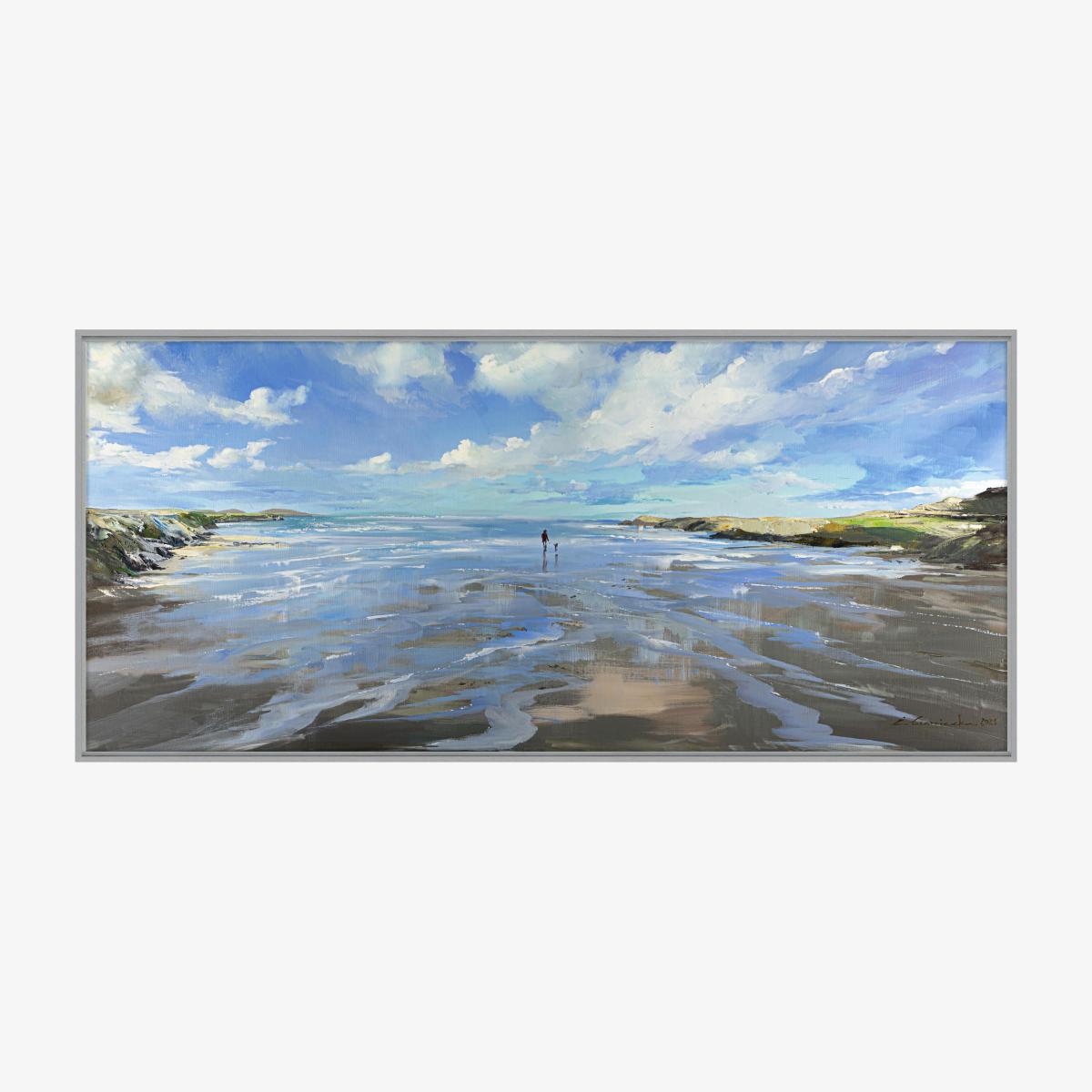 Light reflects and the blues of sea and sky abound in this atmospheric rendition of a morning walk at low tide. This framed canvas is reproduced from an original work by Ewa Czarniecka. Why you'll love it Framed canvas presents an atmospheric seascape at low tide. Reproduced from an original artwork by Ewa Czarniecka. Stretched canvas print in gallery-style floating frame. Frame has a sliver-effect finish. Made in England. Online only. This framed picture is part of the Furniture Village home accessories collection. What you need to know Supplied with a metal hanging fitting and nylon cord. Indoor use only. Dimensions Height: 64 cm (26 in). Depth: 3 cm (2 in). Width: 139 cm (55 in).