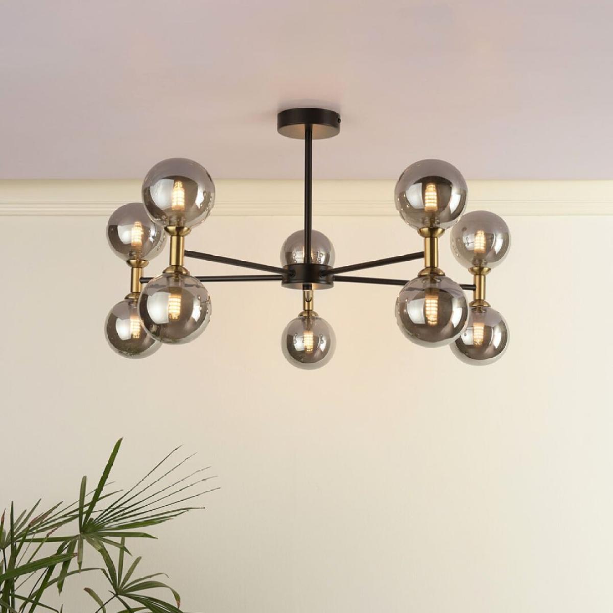 Loxley 10-light semi-flush ceiling light, featuring smoked glass globe shades and a matte black finish with gold detailing. The Loxley semi-flush ceiling light brings a bold, contemporary touch to any interior space. Designed with a sleek matte black frame and refined brushed gold detailing, it features ten elegantly crafted smoked glass globe shades that emit a soft, atmospheric glow. This striking fixture is ideal for rooms with lower ceilings, offering the impact of a statement chandelier in a more compact form. Whether placed in a living room, dining area or bedroom, the Loxley adds both style and warmth with its modern design and sculptural presence. Loxley 10-light semi-flush ceiling light, featuring smoked glass globe shades and a matte black finish with gold detailing. The Loxley semi-flush ceiling light brings a bold, contemporary touch to any interior space. Designed with a sleek matte black frame and refined brushed gold detailing, it features ten elegantly crafted smoked glass globe shades that emit a soft, atmospheric glow. This striking fixture is ideal for rooms with lower ceilings, offering the impact of a statement chandelier in a more compact form. Whether placed in a living room, dining area or bedroom, the Loxley adds both style and warmth with its modern design and sculptural presence.