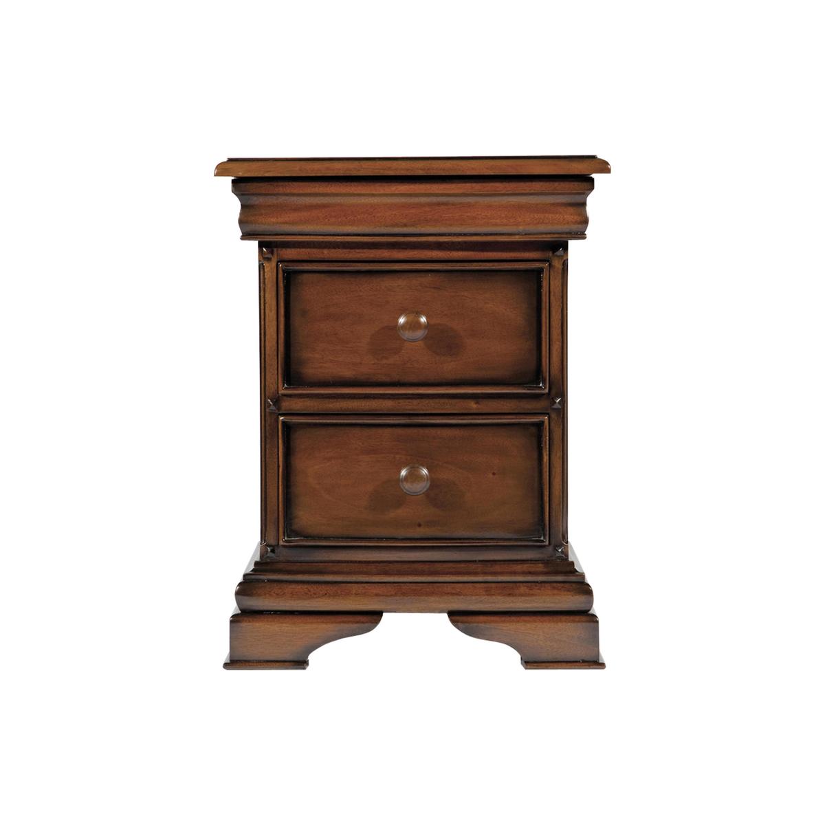 Gorgeous traditional bedroom furniture style crafted in glossy mahogany. The Loxley 3 drawer bedside cabinet has two roomy drawers and a third hidden drawer. Why you'll love it. Handcrafted bedroom furniture in solid mahogany and mahogany veneers. Classic style is elegant and sophisticated. Traditional details include gently bowed front, cornice top and bracket feet. The wood has a deep patina and a high-gloss lacquered finish. Crafted from Indonesian mahogany grown in managed forests. Real-wood craftsmanship ensures that each piece is a one of a kind. What you need to know. 2 roomy drawers with a hidden third drawer. Made with real wood so will show natural variations in grain and tone. To protect the wood, avoid placing in direct sunlight. Part of the extensive Loxley range of beautiful bedroom furniture.