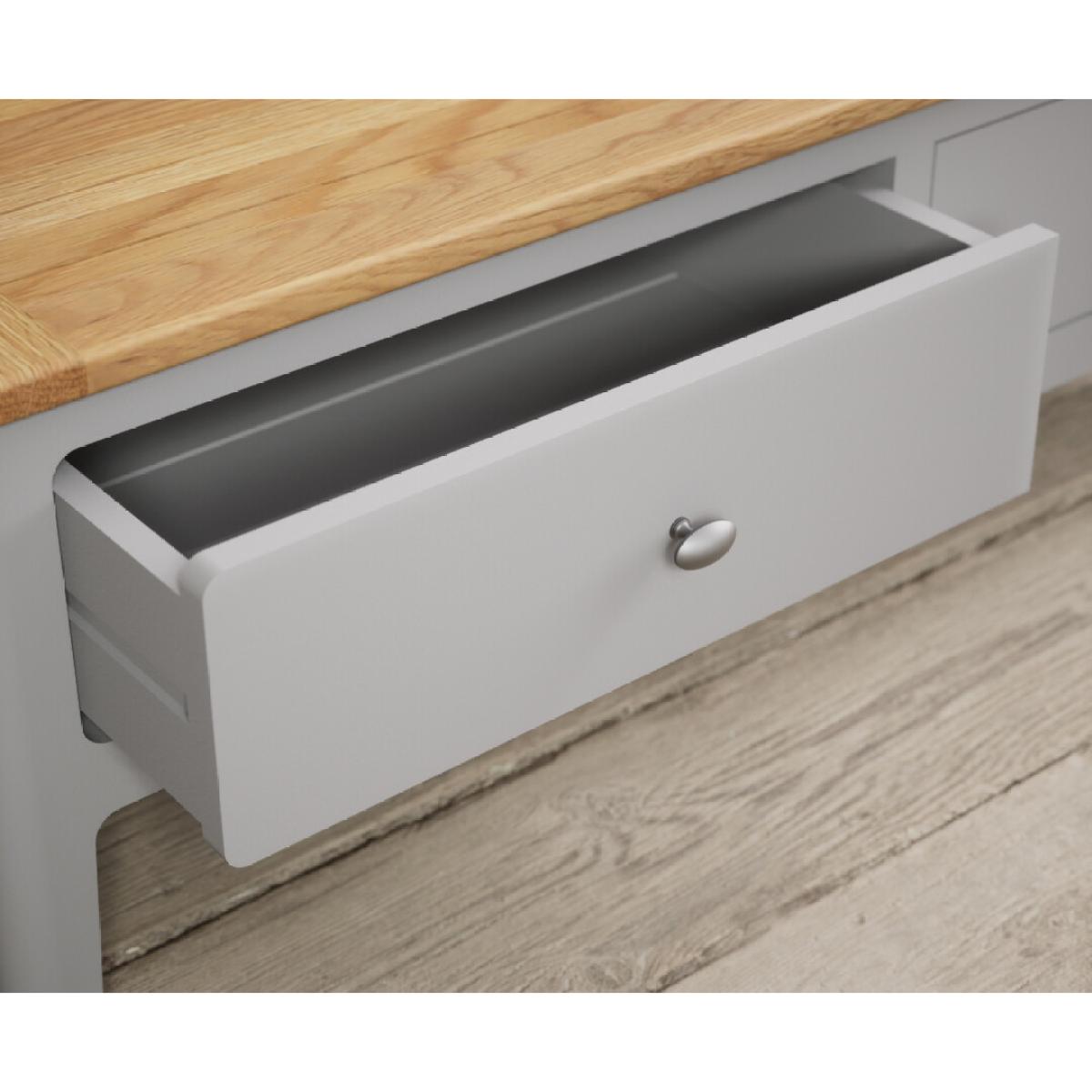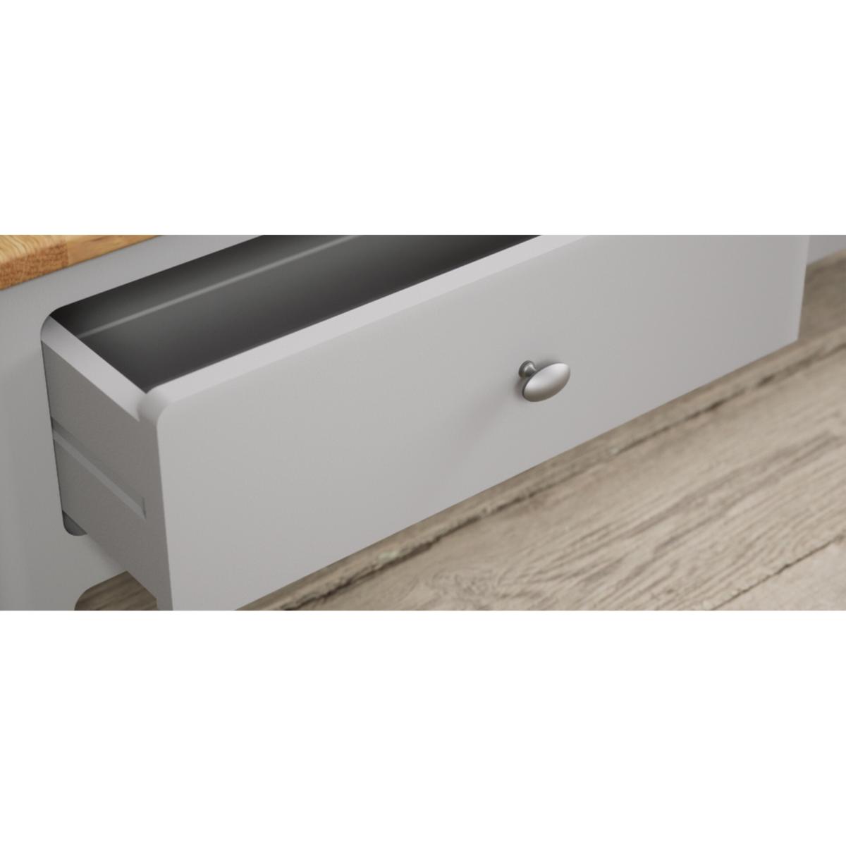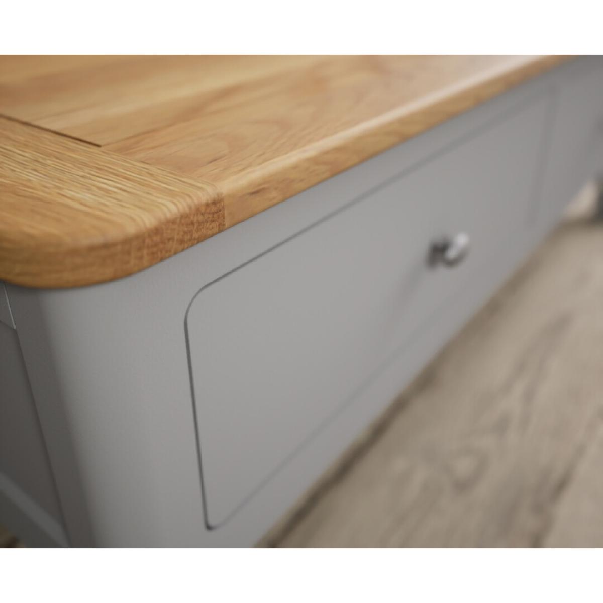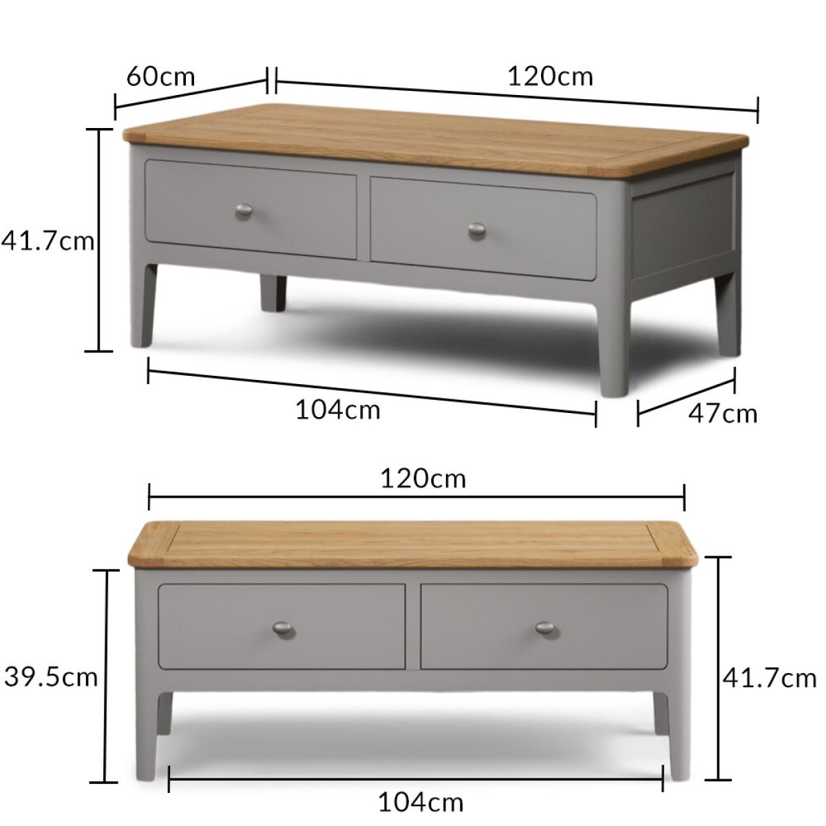The Loxton Oak and Light Grey Painted 4 Drawer Coffee Table is crafted from light grey painted solid hardwood and topped with solid oak, with Dovetail drawers with metal knob handles.