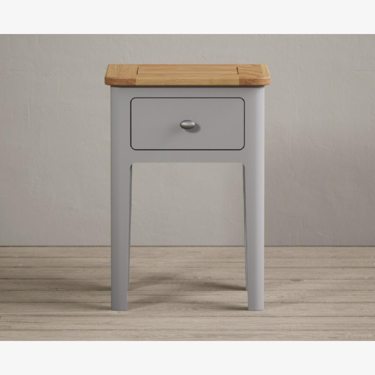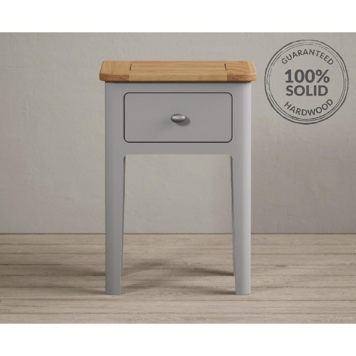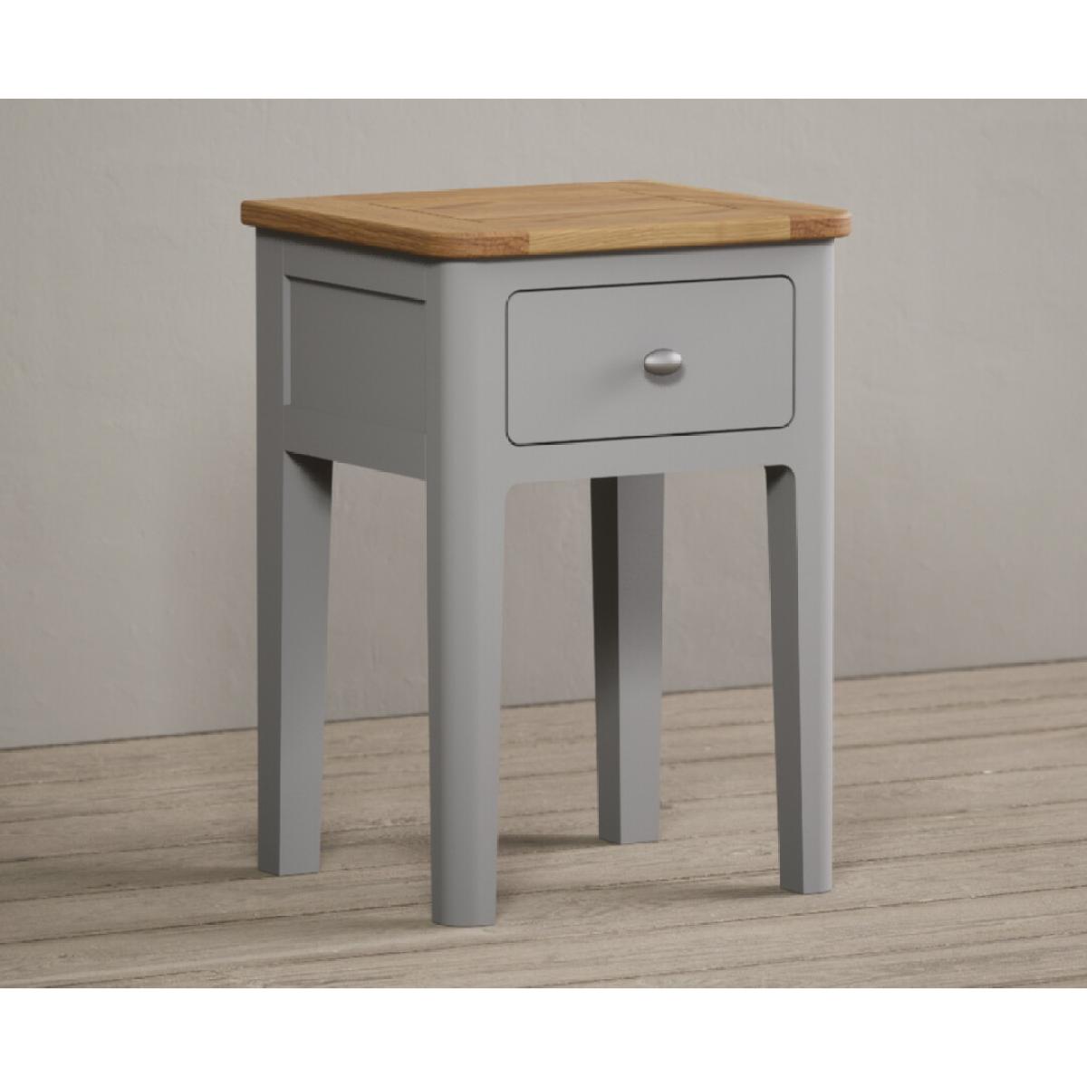The Loxton Oak and Light Grey Painted Bedside Table is crafted from solid hardwood with a light grey painted finish and solid oak top, with a Dovetail drawer with a metal knob handle.