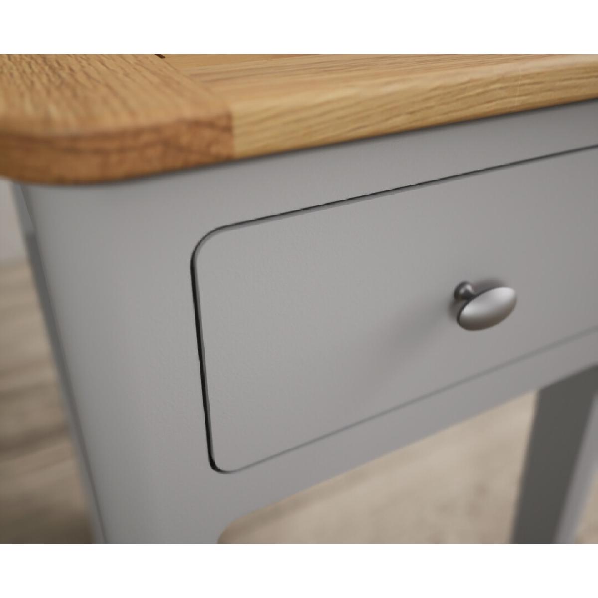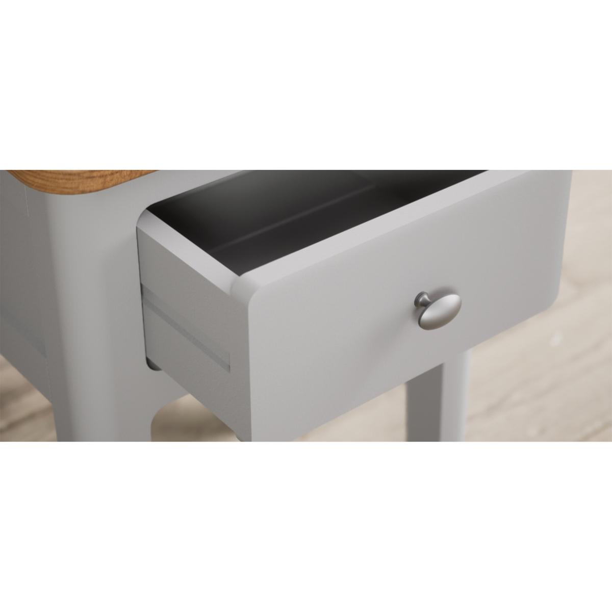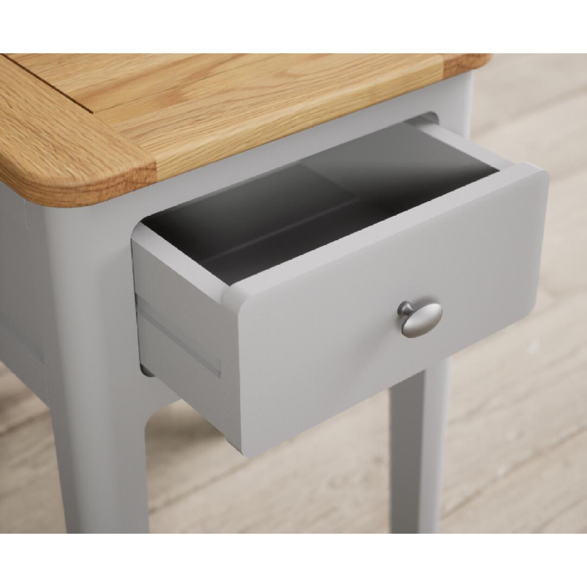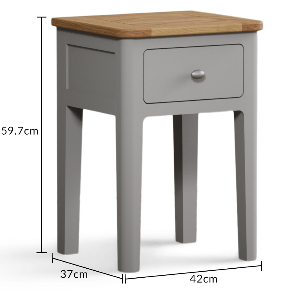 The Loxton Oak and Light Grey Painted Bedside Table is crafted from solid hardwood with a light grey painted finish and solid oak top, with a Dovetail drawer with a metal knob handle.