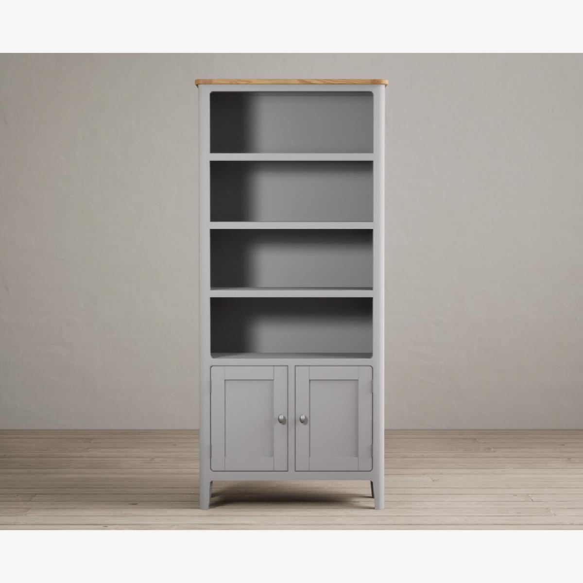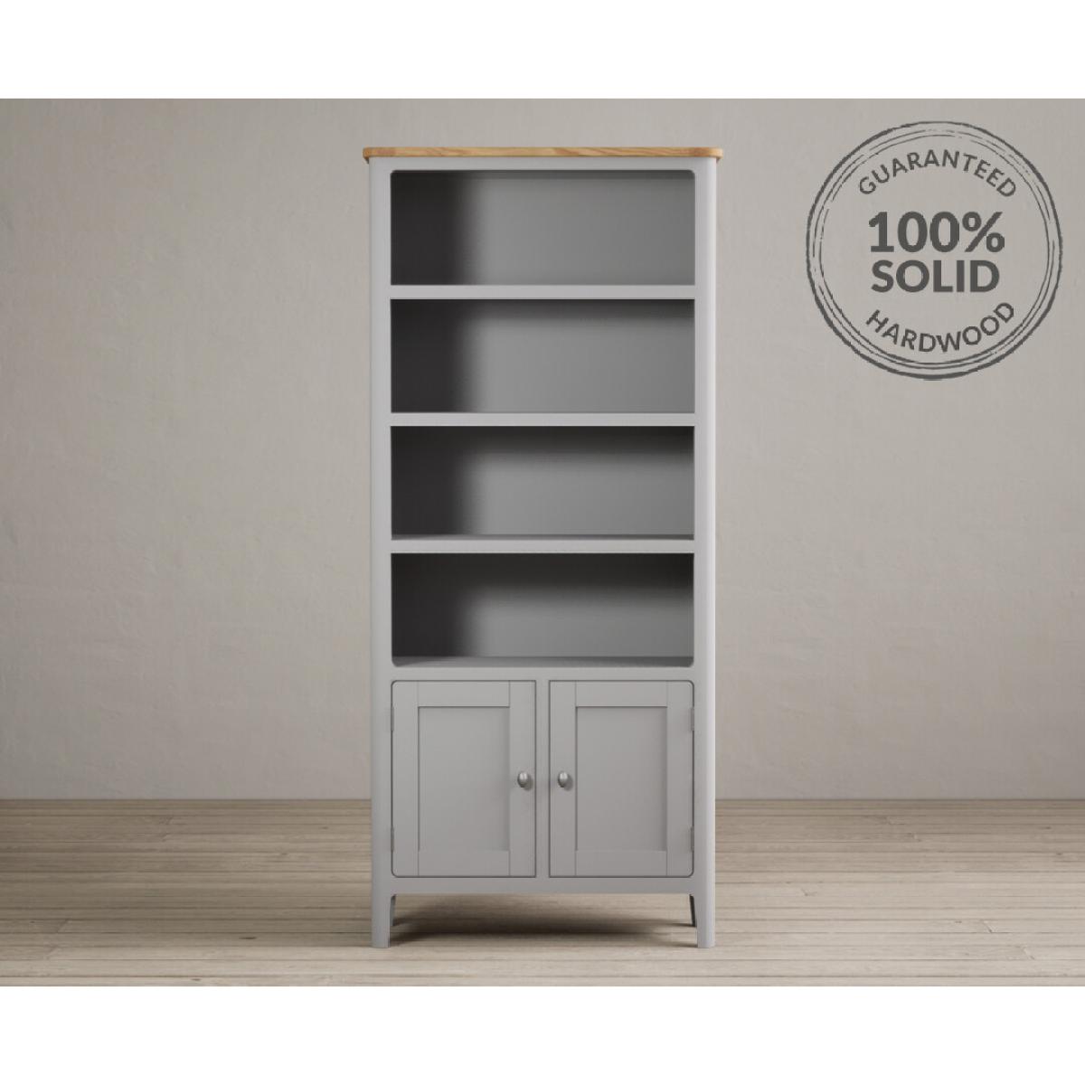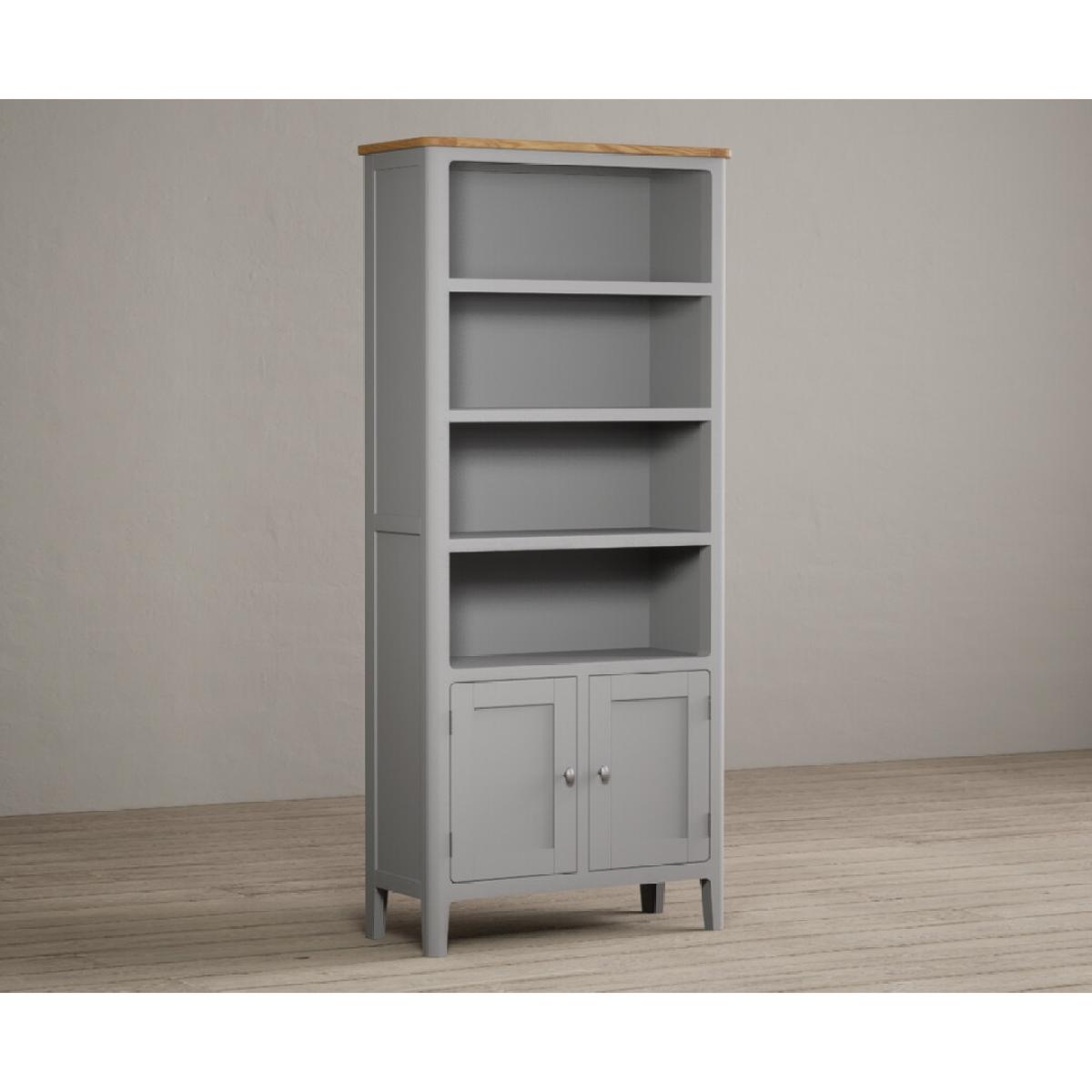 The Loxton Oak and Light Grey Painted Tall Bookcase is crafted from grey painted solid hardwood, with a solid oak top, sturdy solid shelves and a cupboard.