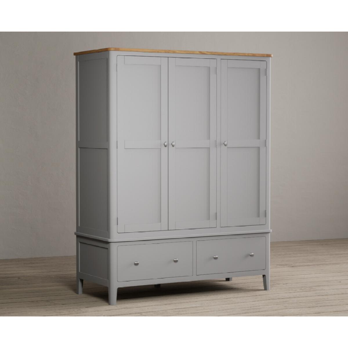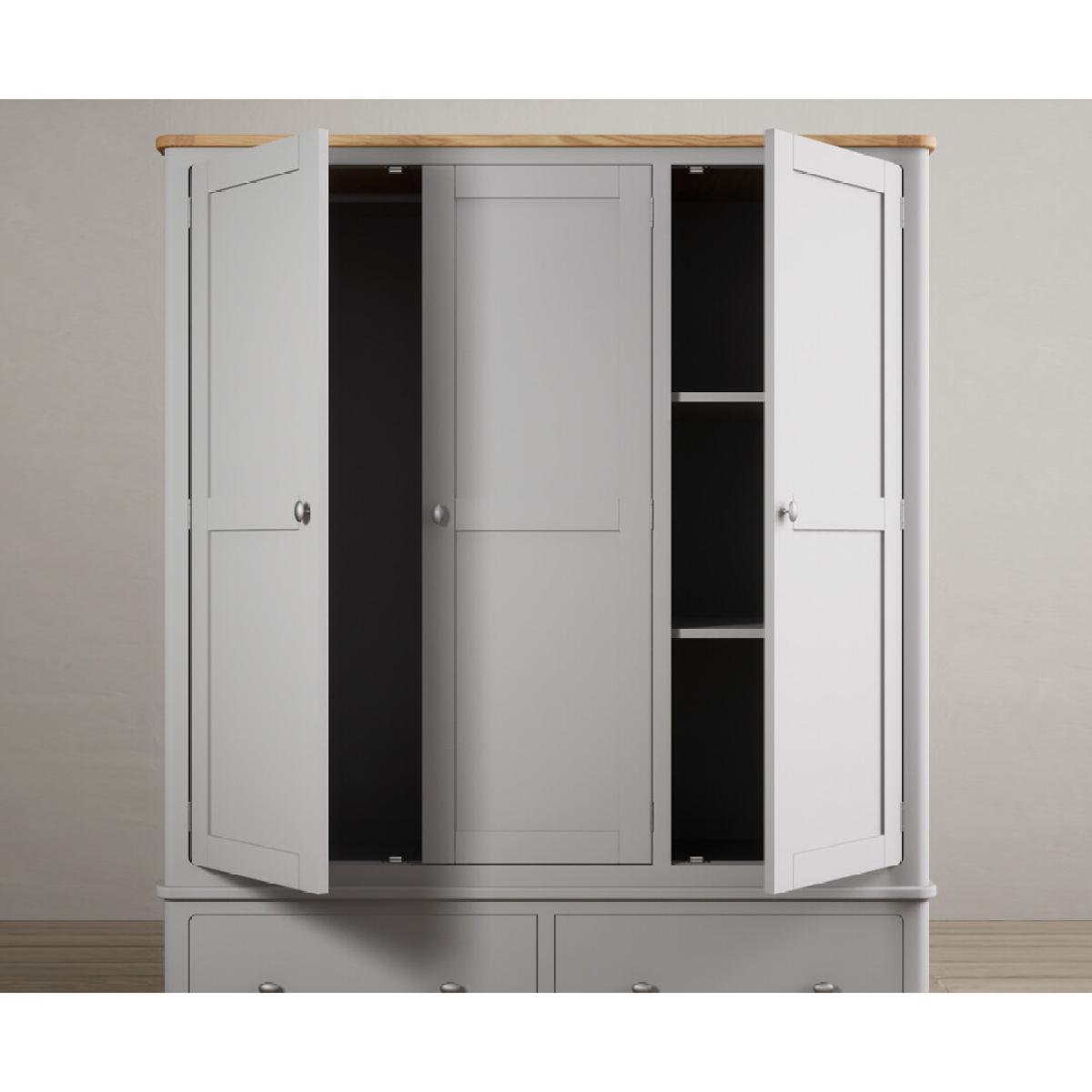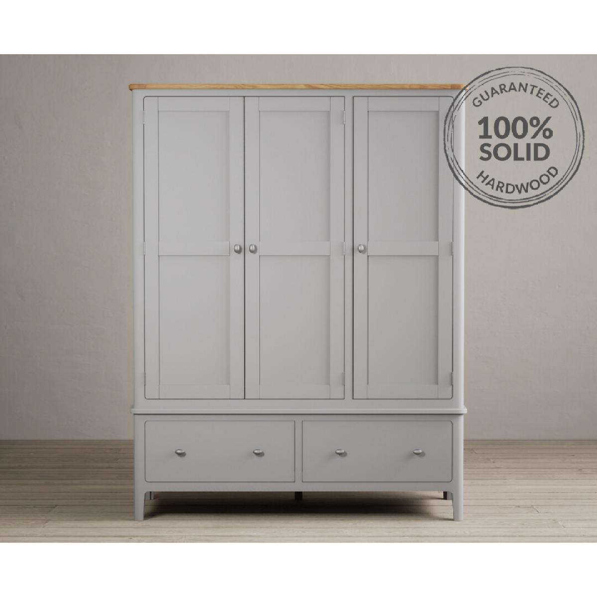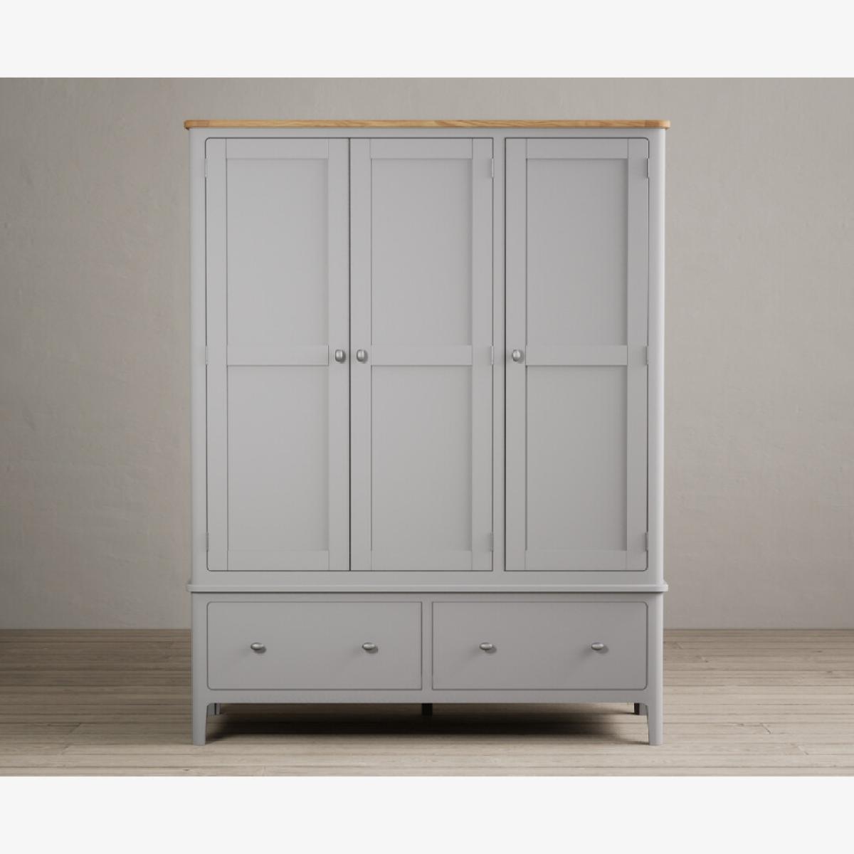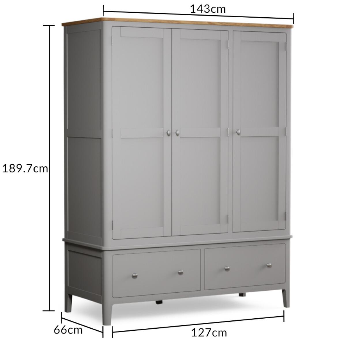 The Loxton Oak and Light Grey Painted Triple Wardrobe is crafted from grey painted solid hardwood, with a solid oak top and features hanging space, shelves and Dovetail drawers.