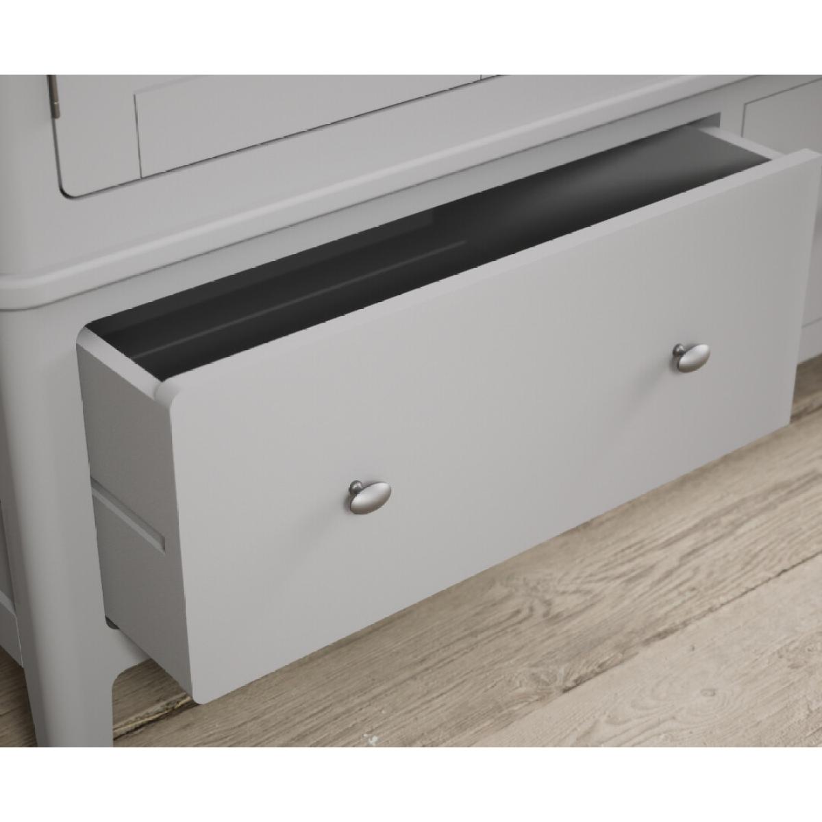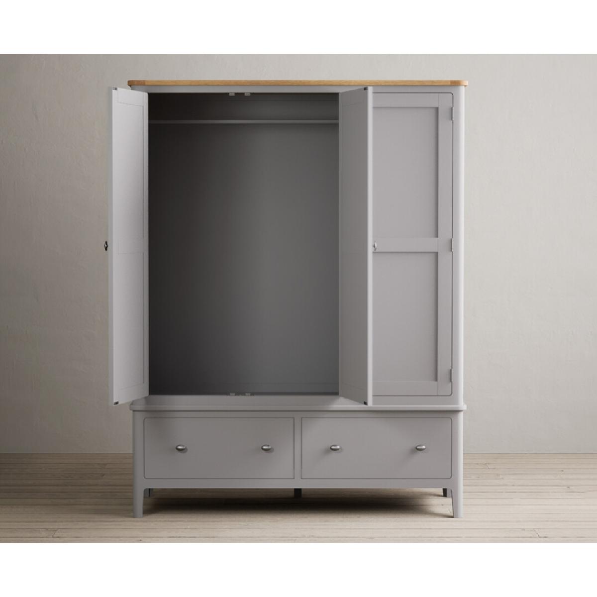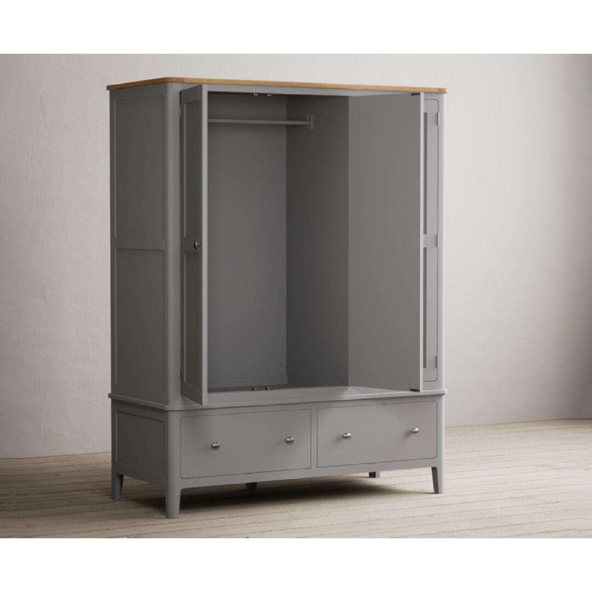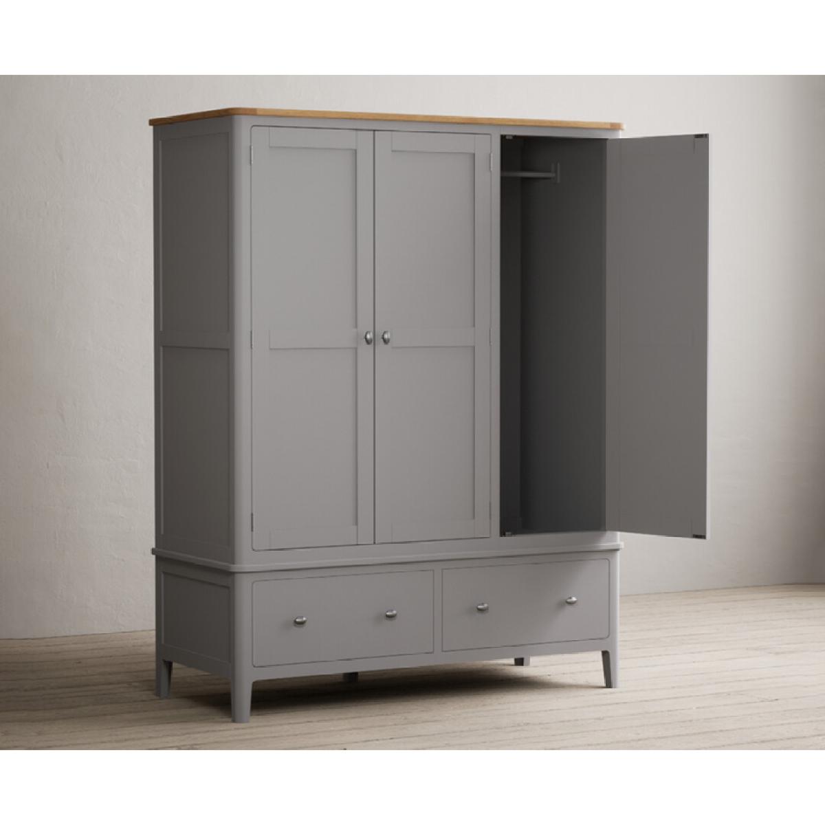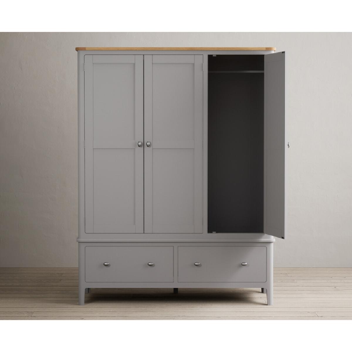 The Loxton Oak and Light Grey Painted Triple Wardrobe is crafted from grey painted solid hardwood, with a solid oak top and features hanging space, shelves and Dovetail drawers.