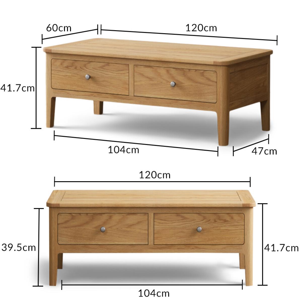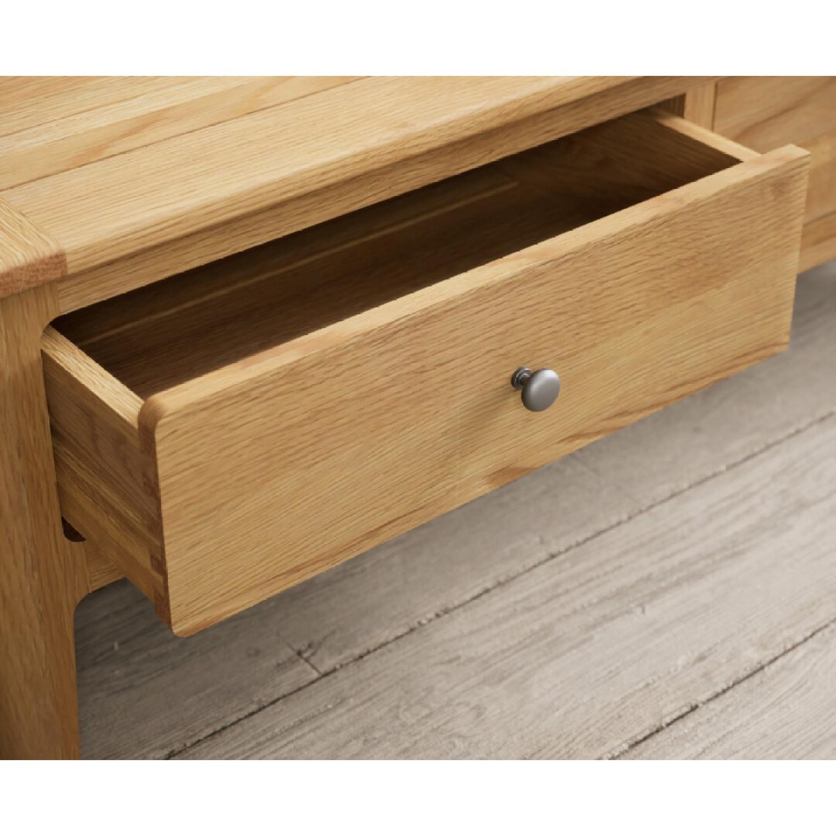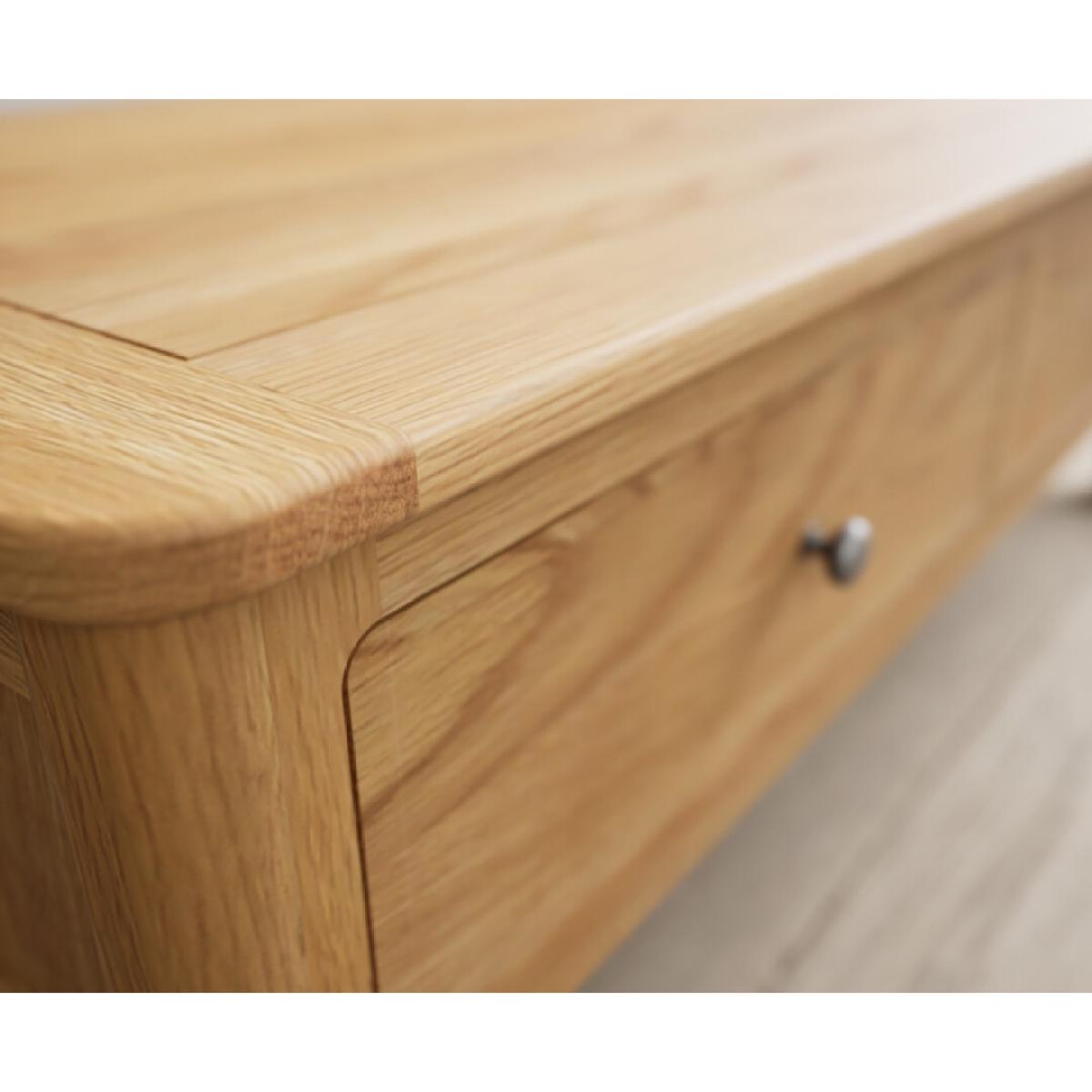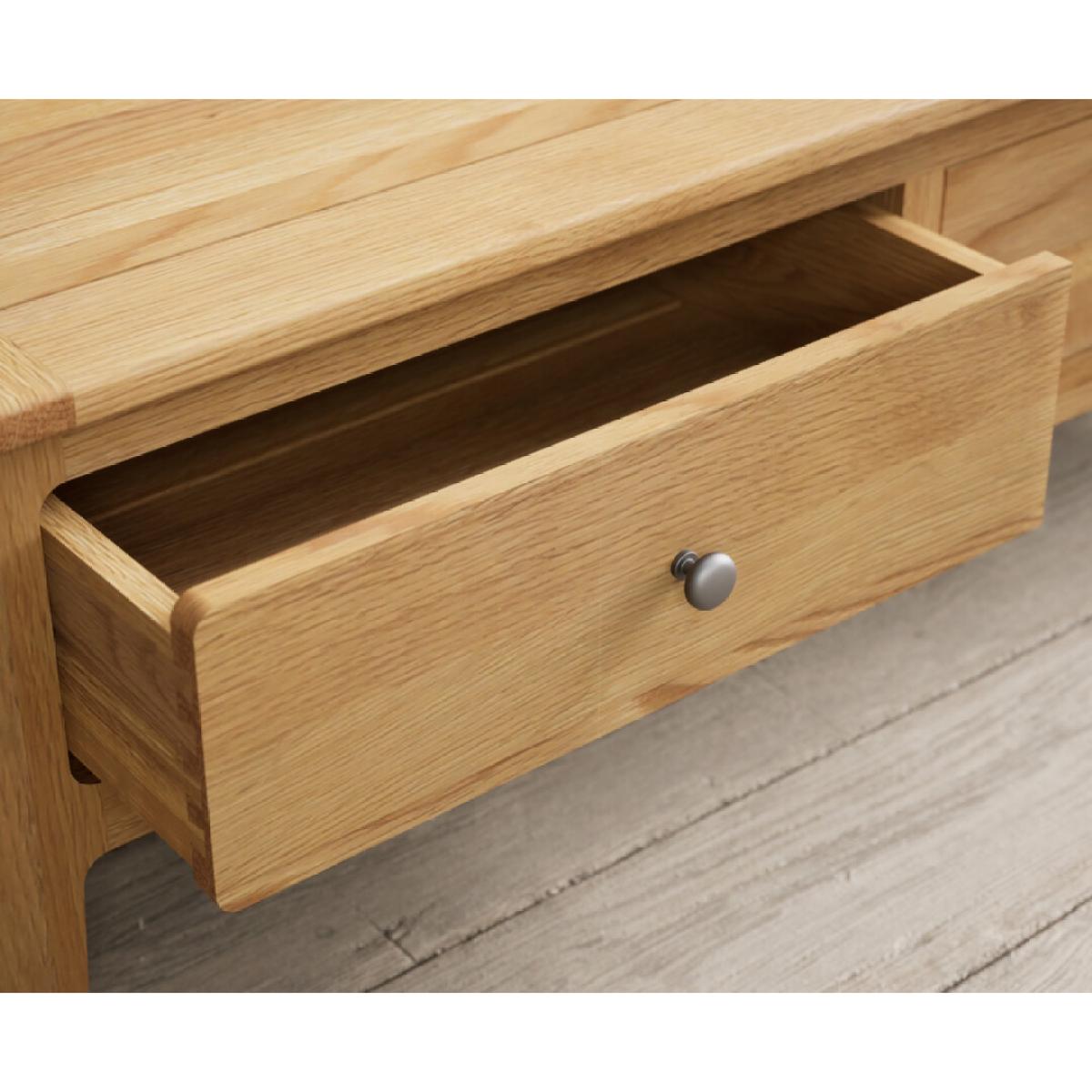 The Loxton Solid Oak 4 Drawer Coffee Table is crafted from 100% solid oak and features Dovetail drawers on wooden runners finished with metal knob handles.
