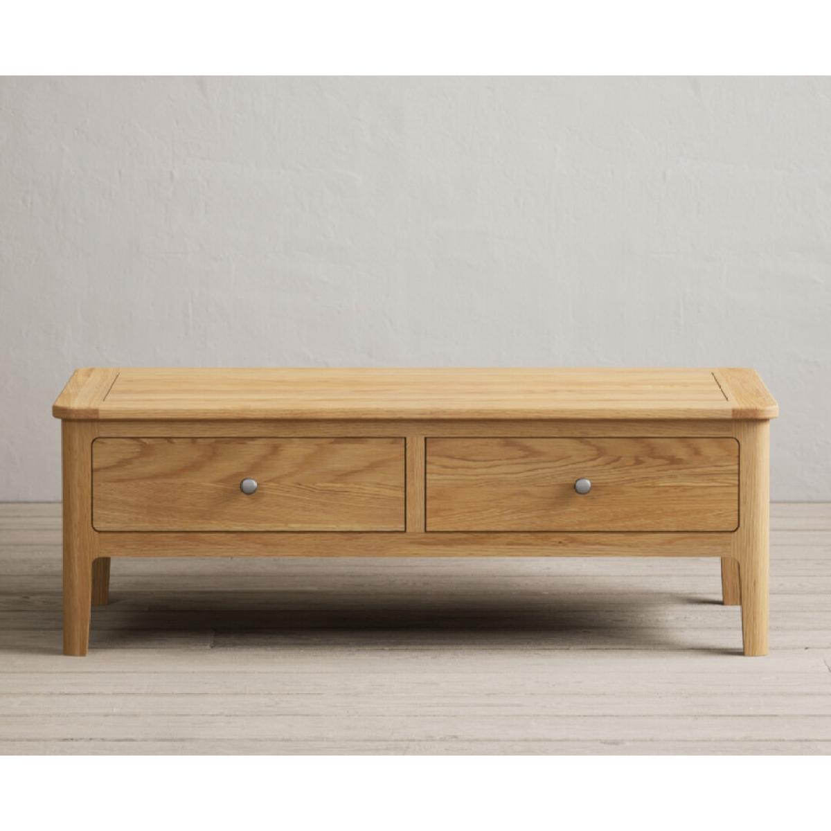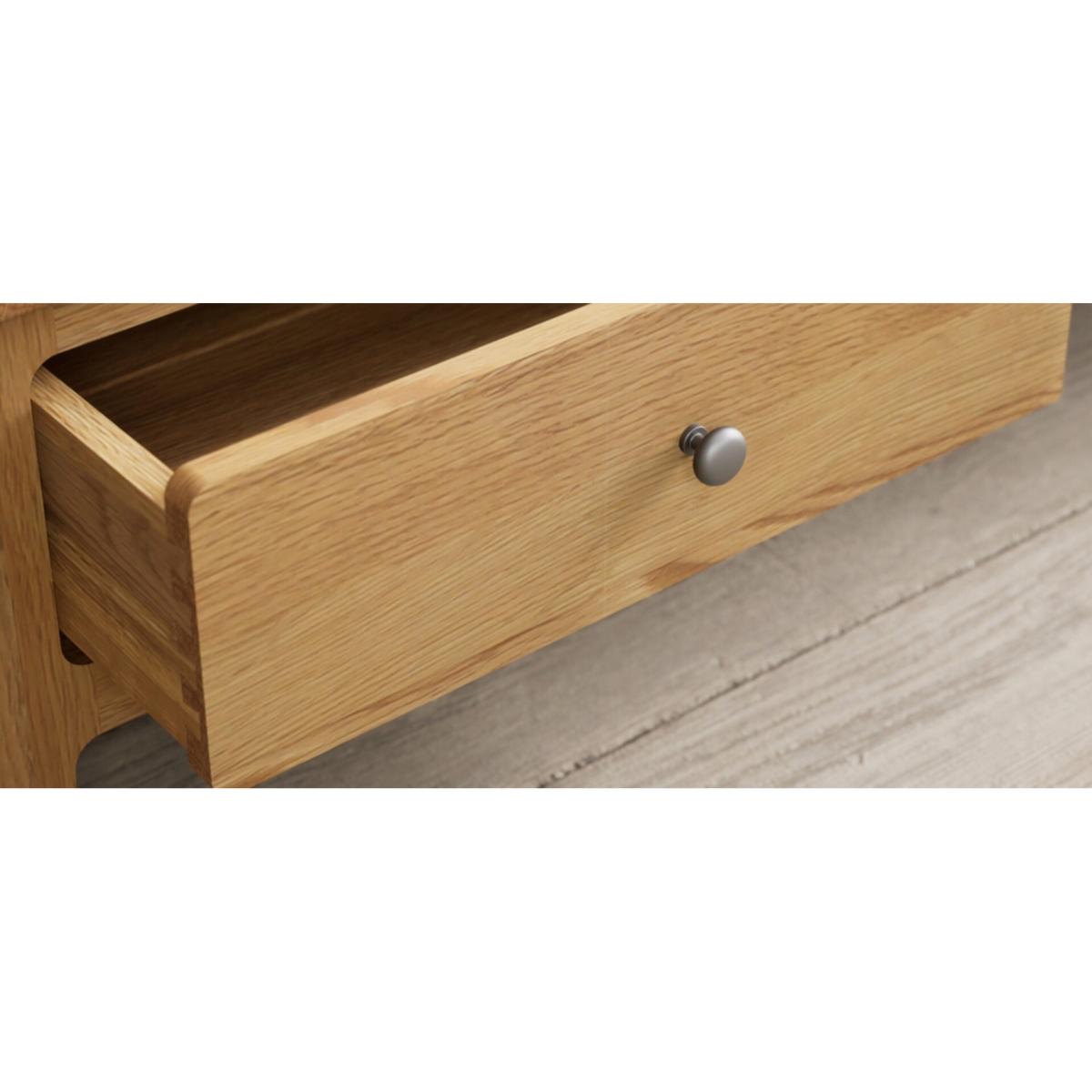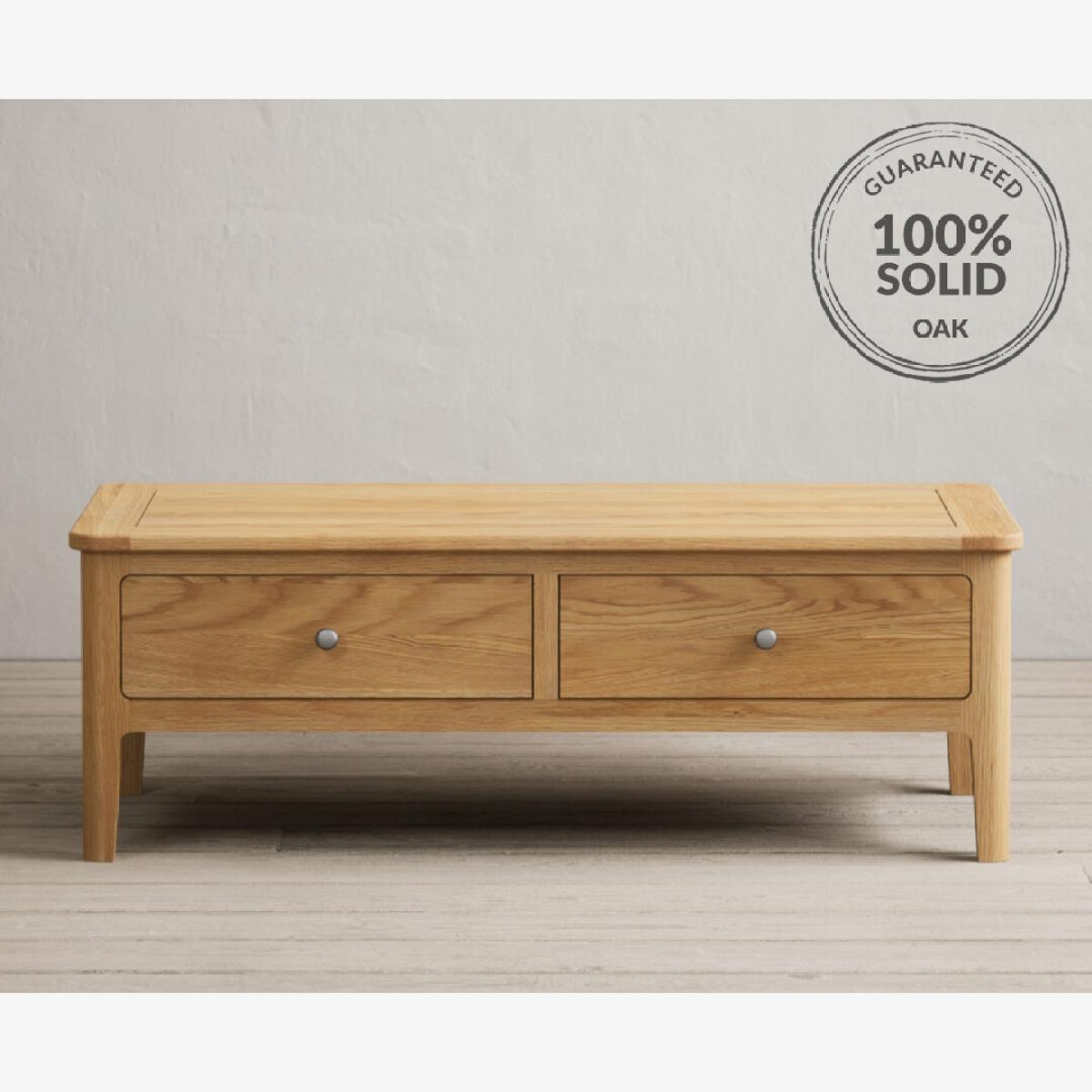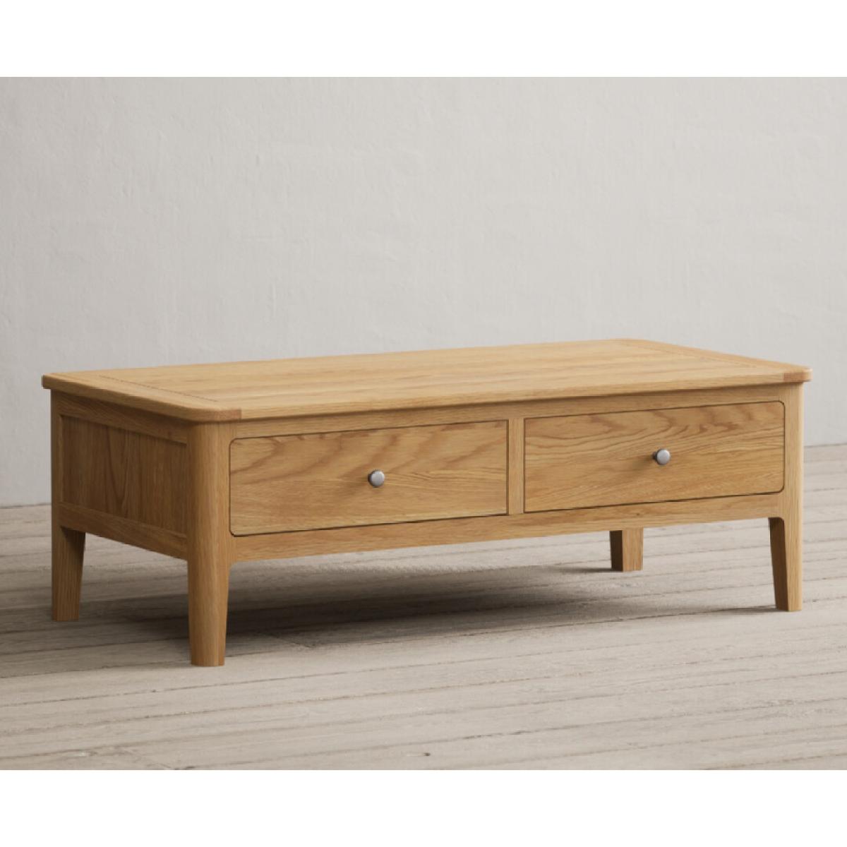 The Loxton Solid Oak 4 Drawer Coffee Table is crafted from 100% solid oak and features Dovetail drawers on wooden runners finished with metal knob handles.