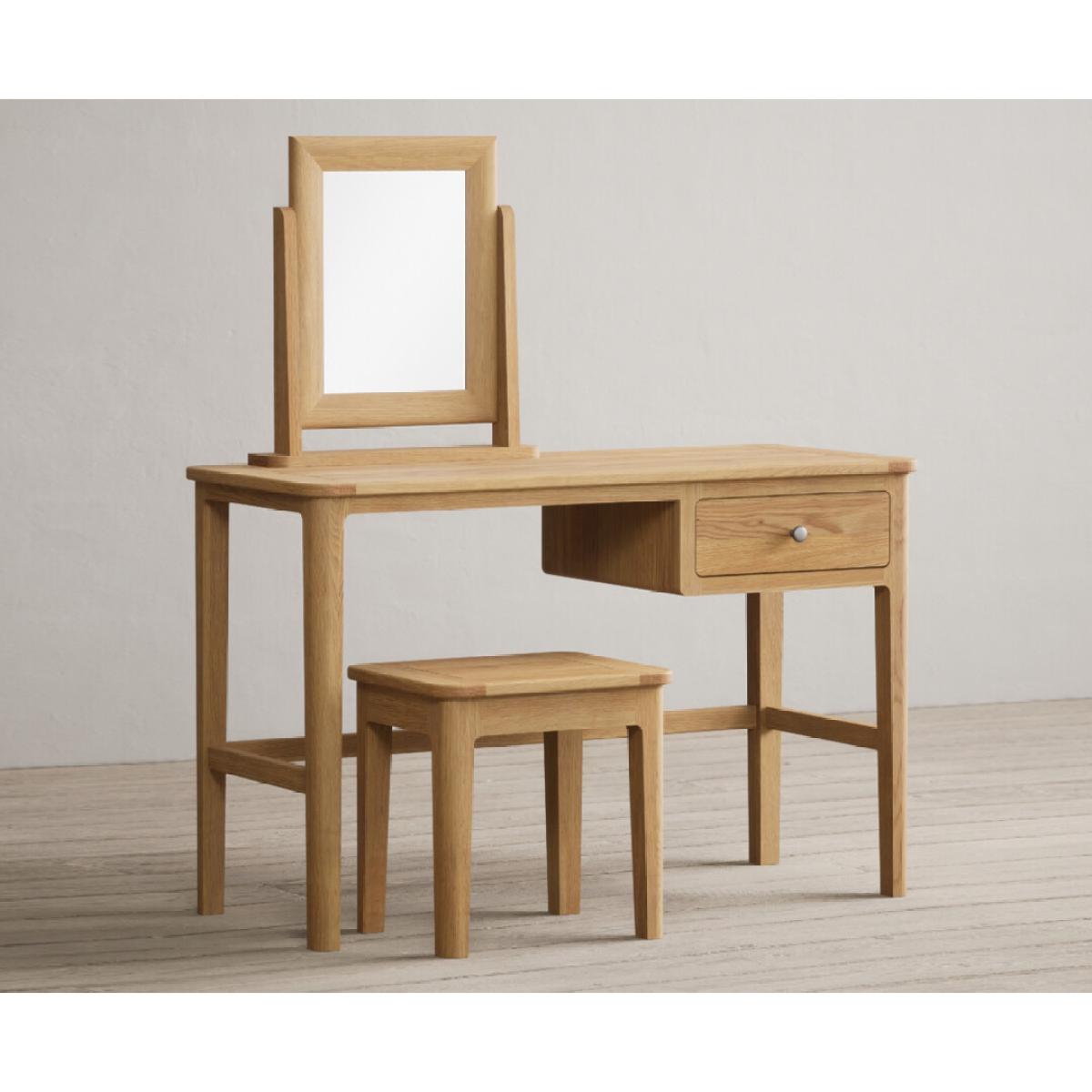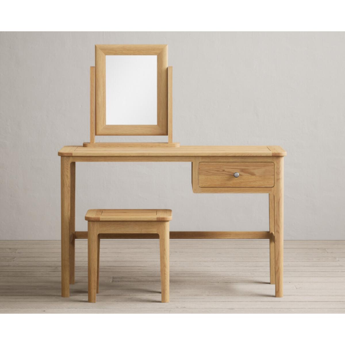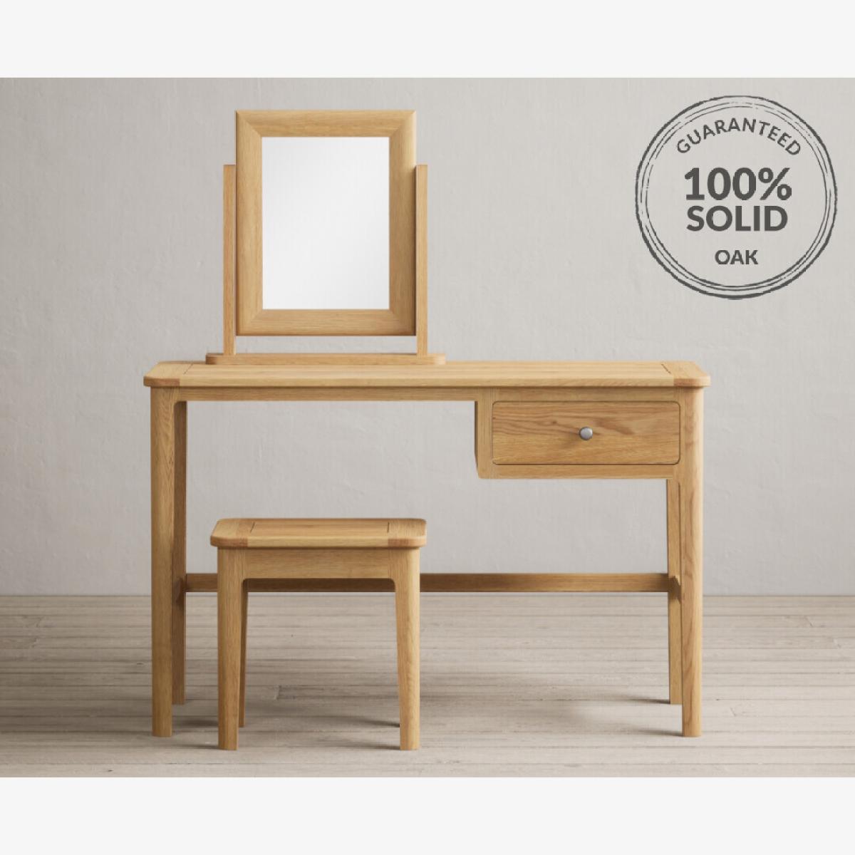 The Loxton Solid Oak Dressing Table Set is crafted from 100% solid oak with a waxed finish and features a dressing table with Dovetail drawer, oak dressing table stool and oak dressing table mirror.