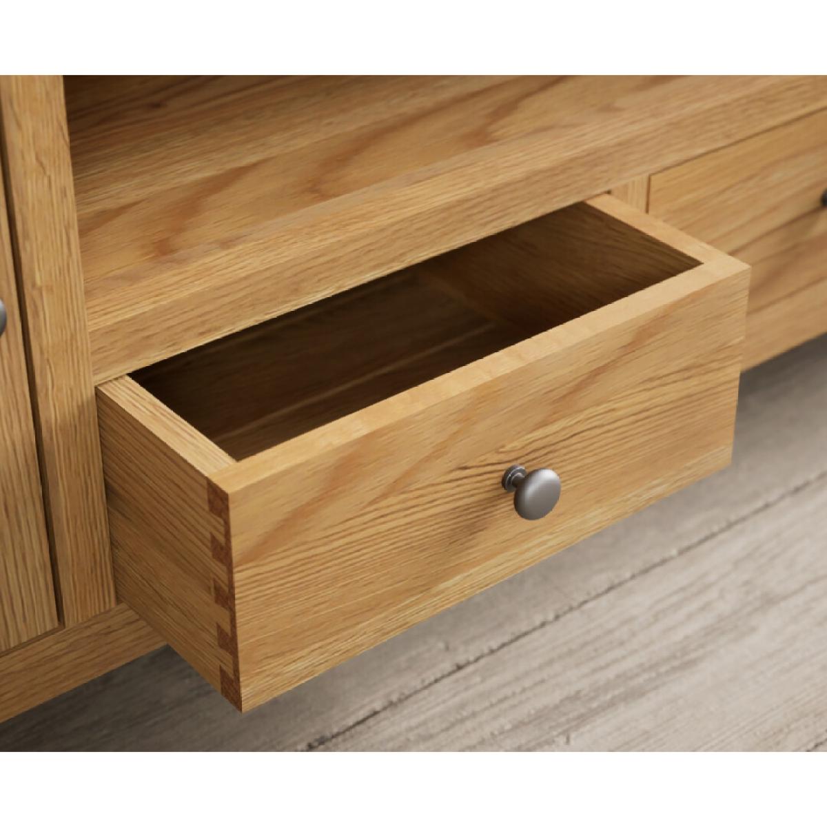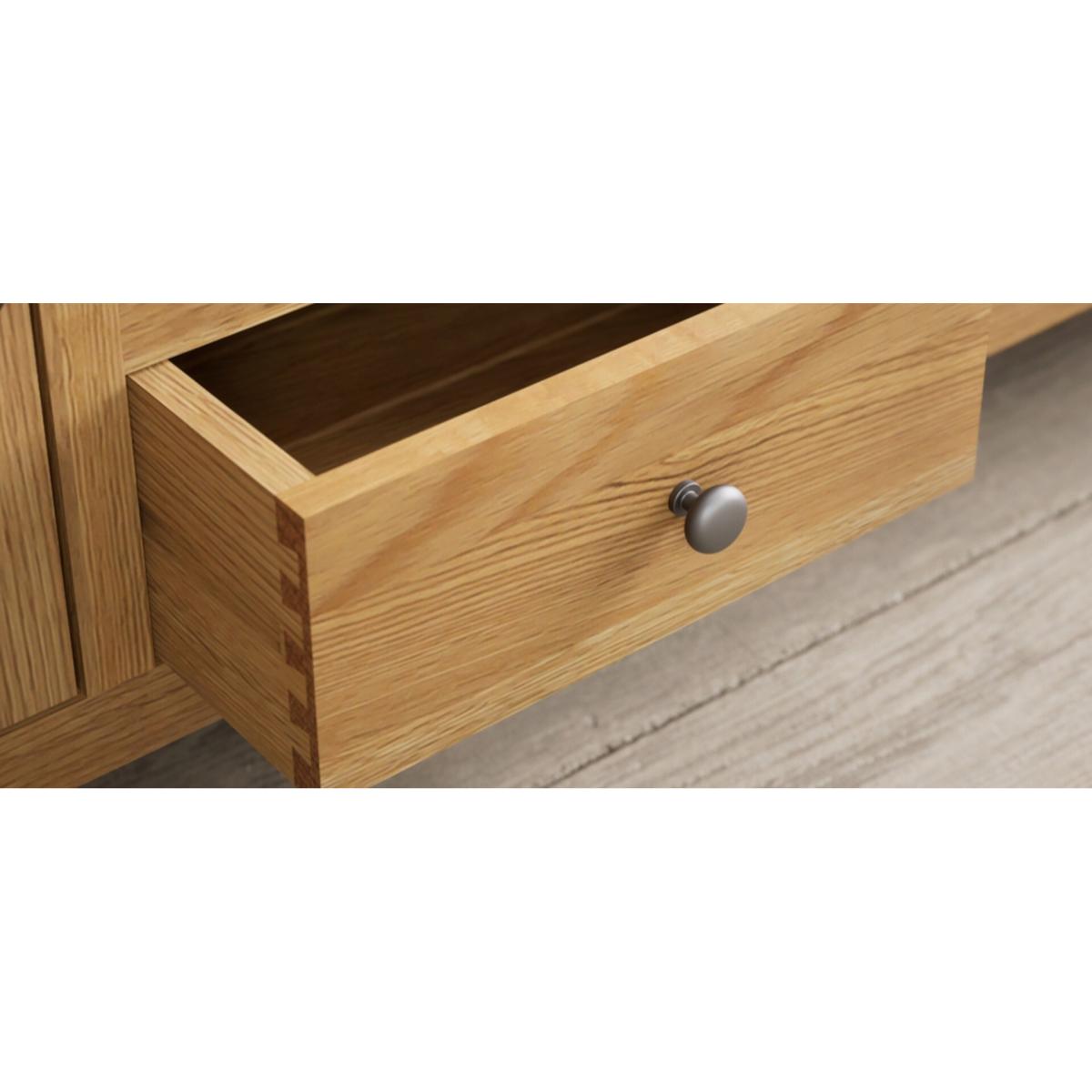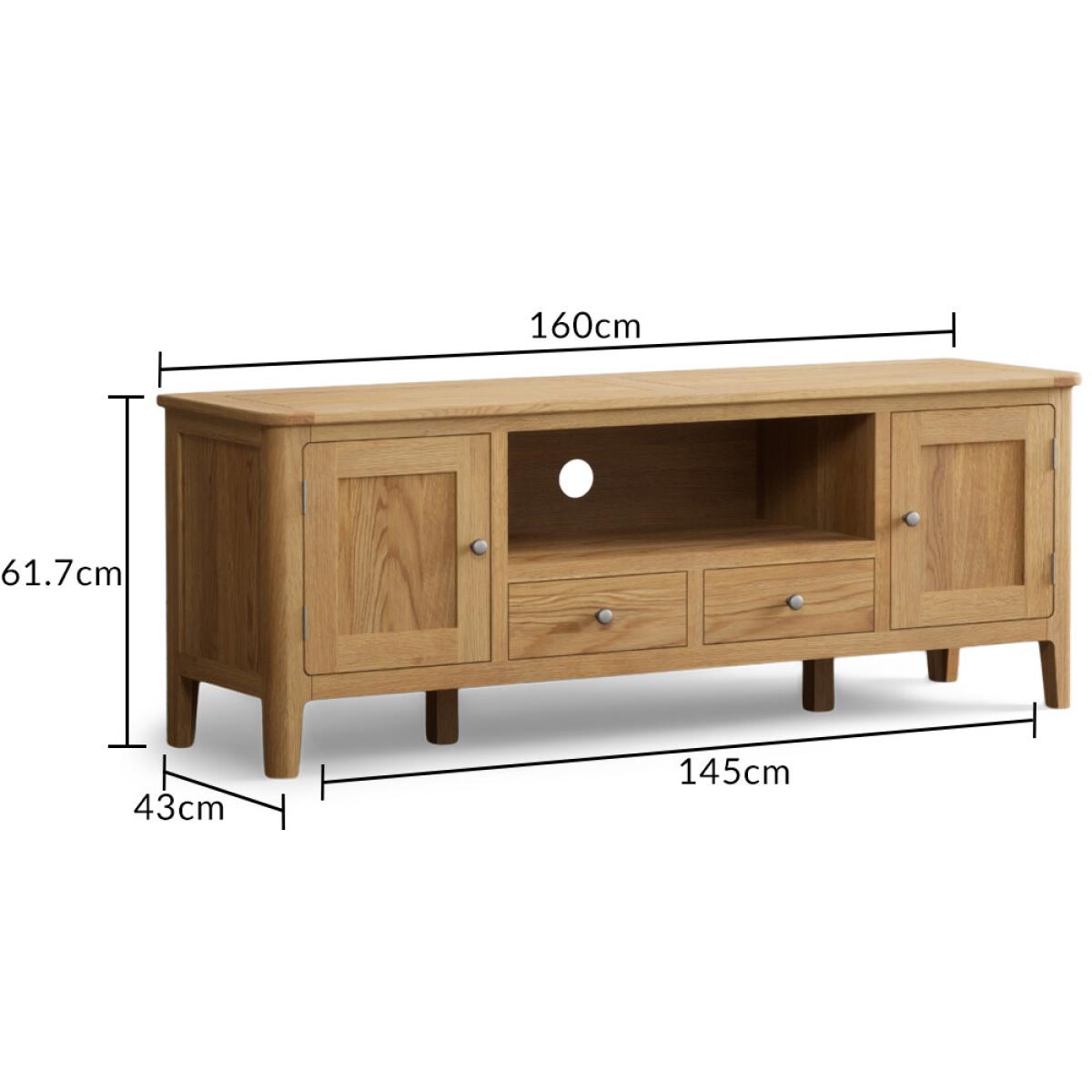 The Loxton Solid Oak Super-wide TV Cabinet is crafted from 100% solid oak with a waxed finish and features a cable management hole at the back, Dovetail drawers and two cupboards.