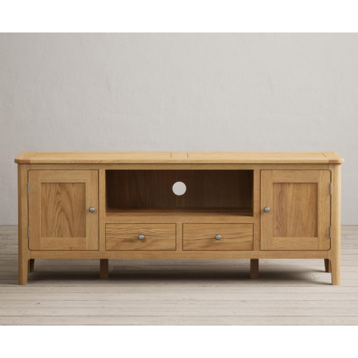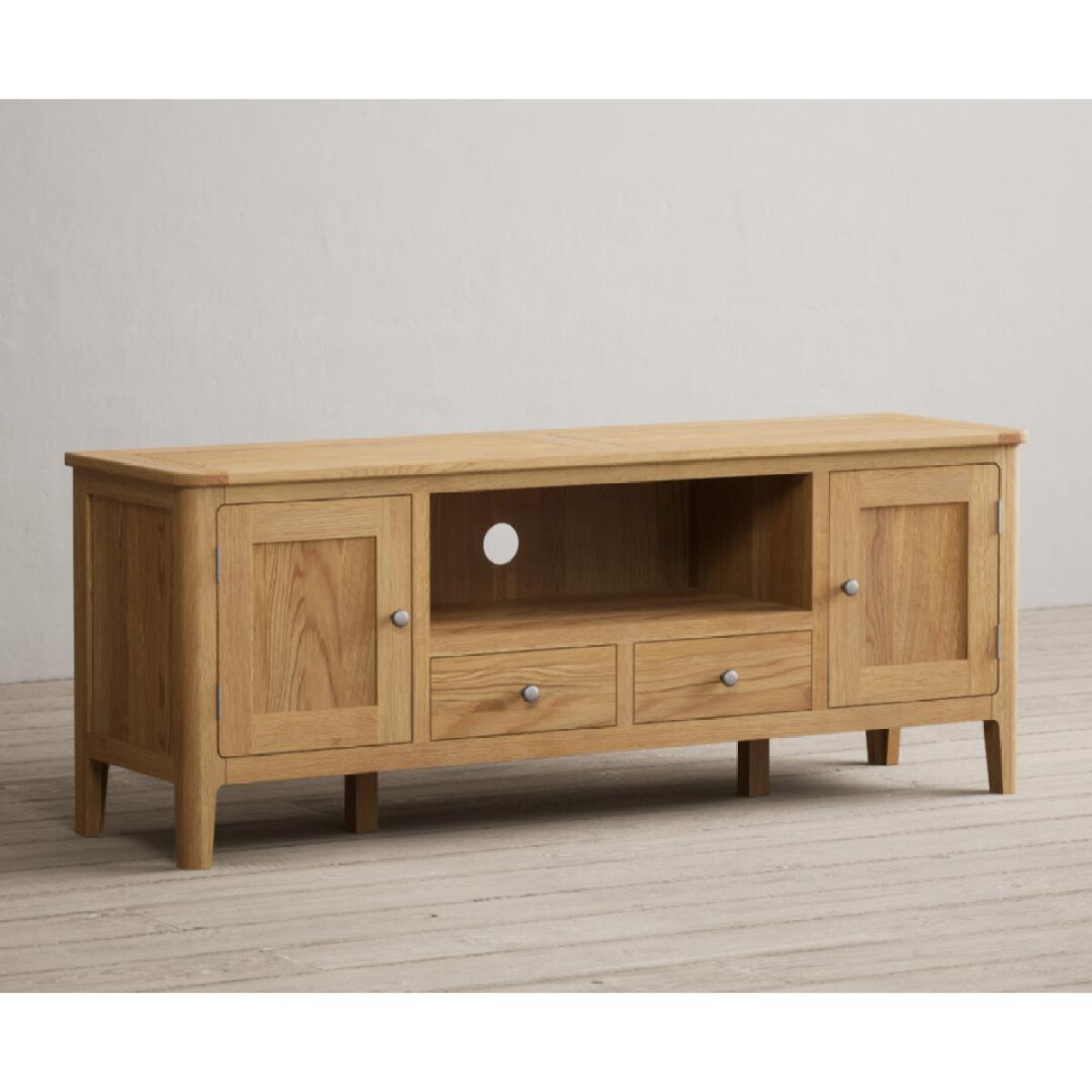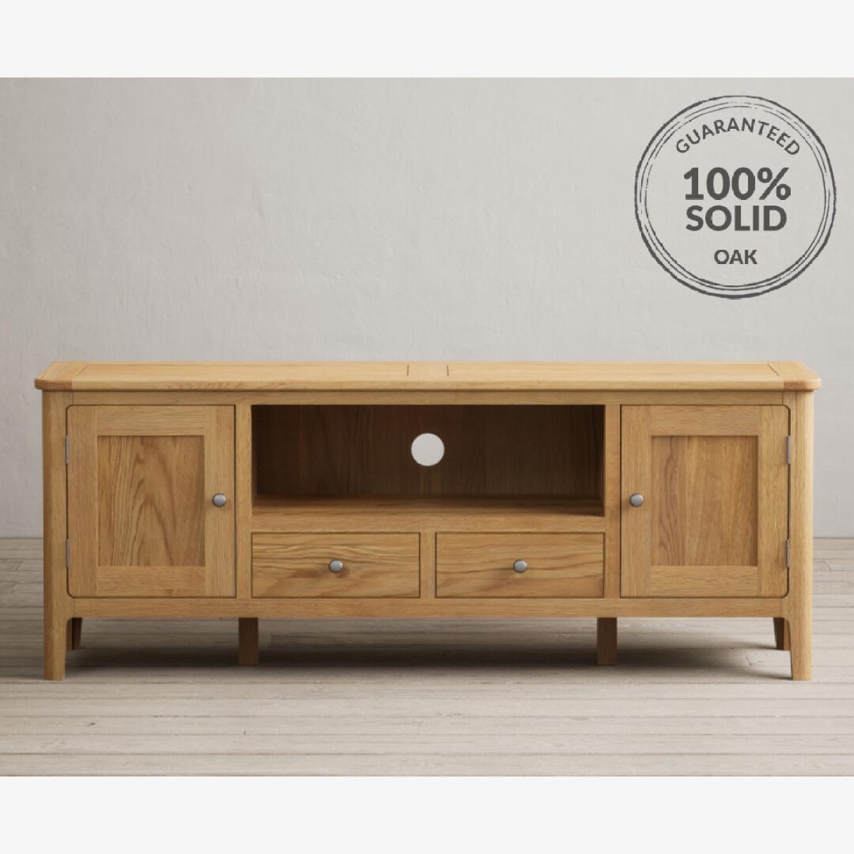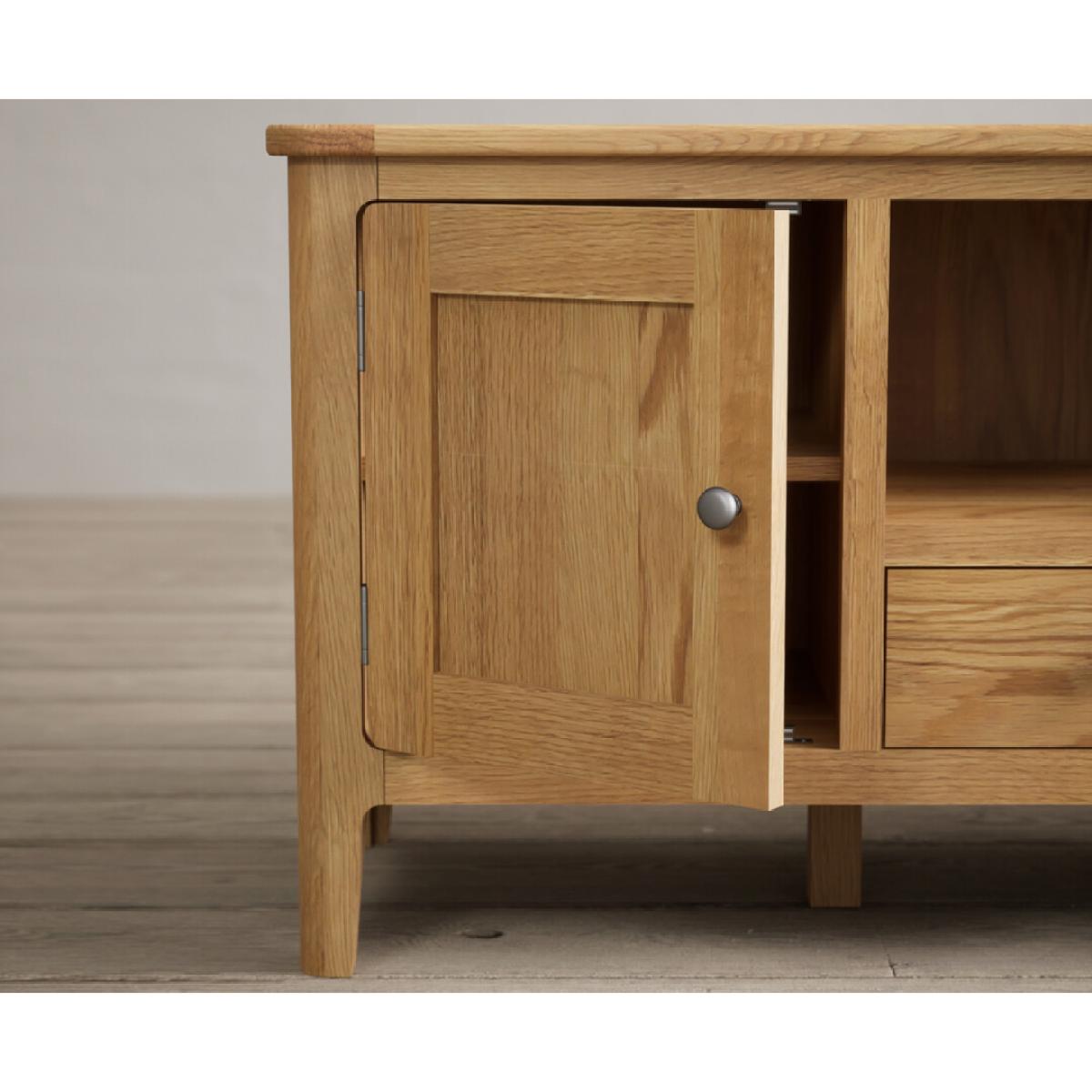 The Loxton Solid Oak Super-wide TV Cabinet is crafted from 100% solid oak with a waxed finish and features a cable management hole at the back, Dovetail drawers and two cupboards.