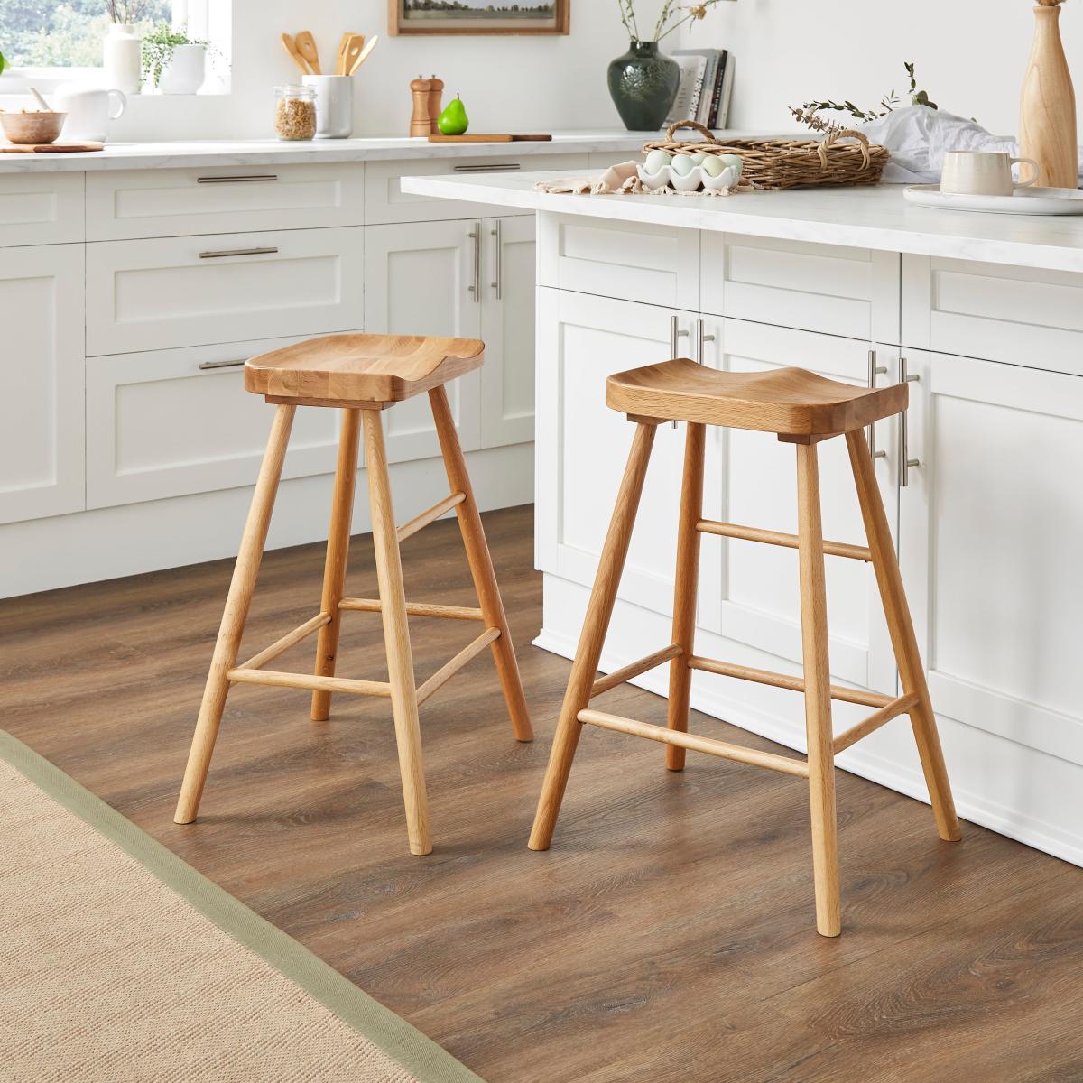 Dunelm Exclusive - Designed and Developed by Dunelm Crafted from 100% solid oak, the Loxwood bar stool offers a timeless style and would suit a variety of interior styles. Complete with a moulded seat for added comfort, this versatile, part assembly stool features a natural finish and a crossbar footrest and is the perfect height to suit standard UK countertops.