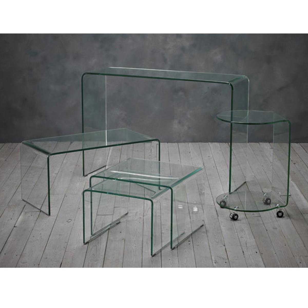I love the mix of transparency and sleek design of this glass lamp table, making it an ideal piece for contemporary or minimalist interiors. It works particularly well in spaces where you want to add a touch of elegance without cluttering the visual flow, such as in modern living rooms or as a bedside table in a streamlined bedroom. For styling tips, consider pairing it with soft textiles and metallic accents to enhance its modern vibe or using it as a display surface for decorative objects, candles, or plants to add visual interest. Its versatile shape and clear finish make it easy to integrate into various colour schemes and schemes, acting as a subtle but stylish addition to any room.