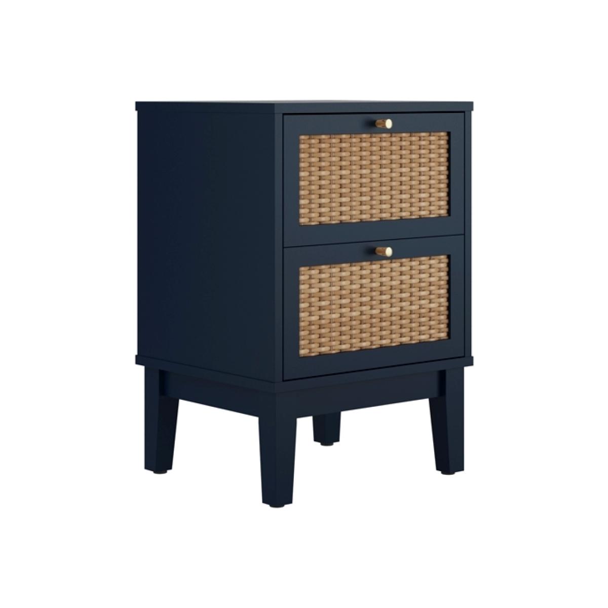 I love this bedside table for its bold colour and tactile woven drawer fronts, which add texture and visual interest. It works particularly well in eclectic, coastal, or bohemian interiors where a pop of colour and a mix of materials can really make a space feel lively. For styling, keep the top clear with a simple lamp and a few personal items, or add a small plant for freshness. Its compact size makes it versatile for various bedroom sizes and layouts, and pairing it with other navy or rattan accents can create a cohesive look. Practical tip: use the drawers for essentials but leave the top surface relatively clutter-free to maintain a tidy, styled aesthetic.