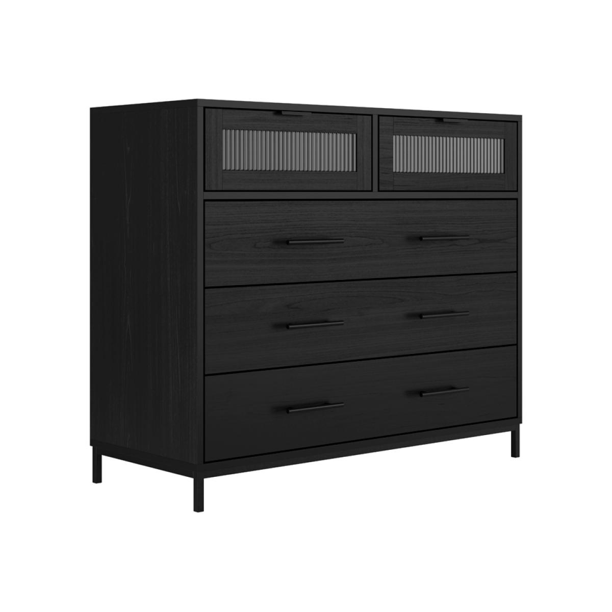 I love the dark, matte finish of this chest-its sleek black tone makes it a versatile piece that can anchor both modern and industrial interiors. The reed detail on the upper drawers adds subtle visual texture without overwhelming, making it an excellent choice for spaces that benefit from understated sophistication. It works particularly well in living rooms or bedroom corners, where it can double as stylish storage while complementing existing colour schemes. For styling tips, consider pairing it with brass or matte metals, or soften the look with textured textiles nearby. It's practical too, with generous drawers perfect for organising everything from clothes to accessories, ensuring your space remains tidy yet stylish.
