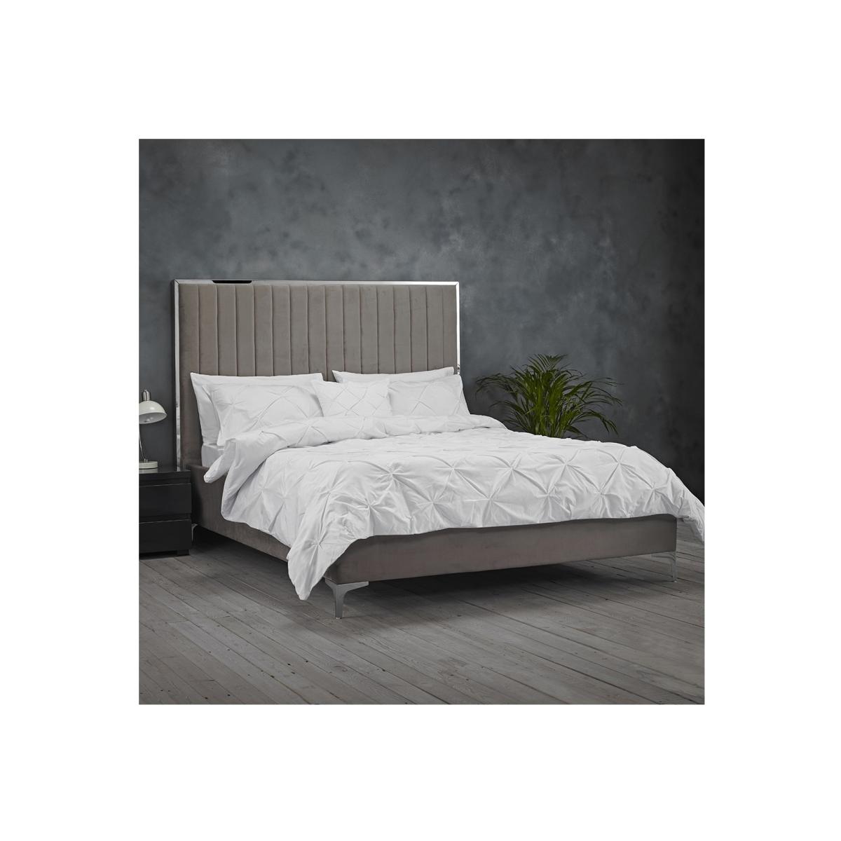 Dimensions H142.5 x W153 x D207 cm Features. You spend a third of your life sleeping so why not do it in style? Our Berkeley bed frame comes in a soft mink-grey velvet vertical stitched detail and a silver trim to add a luxurious feel. This bed is sure to add a touch of glamour to any bedroomSoft mink-grey velvet. Vertical stitched detail. Silver trim to add a luxurious feel. Assembly required..