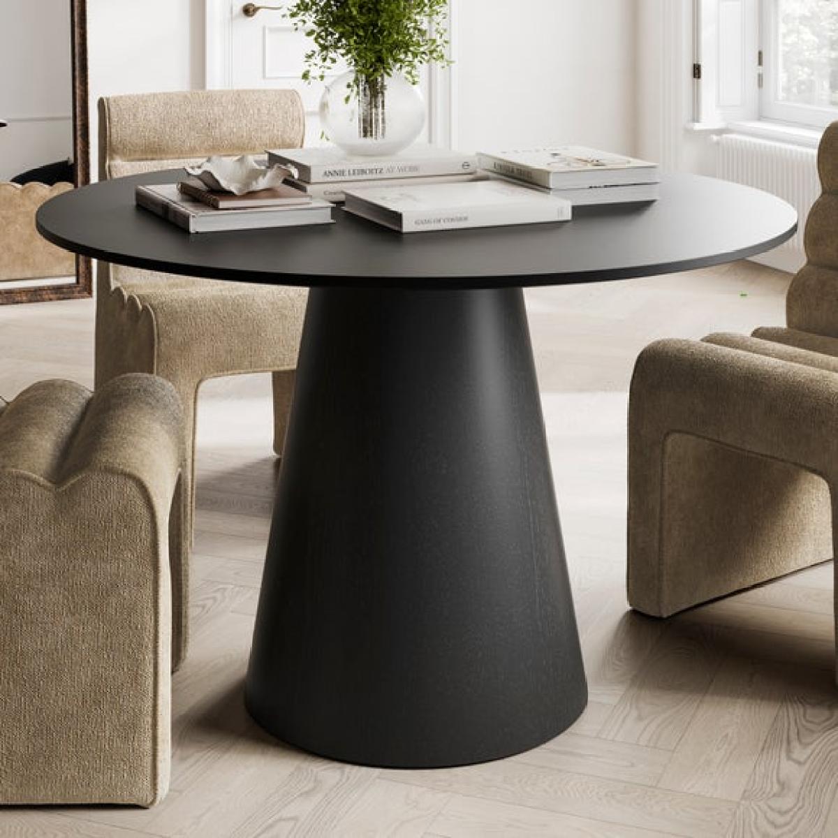 * Matt black finish * Made from wood varient * Stylish modern design * Sits 4-6 comfortably Make a bold style statement with the LPD Juno Black Dining Table. Featuring a striking conical base, circular wood grain-effect top, and a matte black finish, it’s designed to seat 4–6 guests with ease. A blend of dramatic design and everyday function for contemporary dining areas.