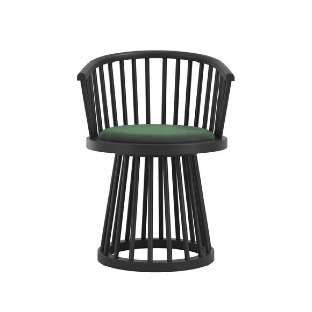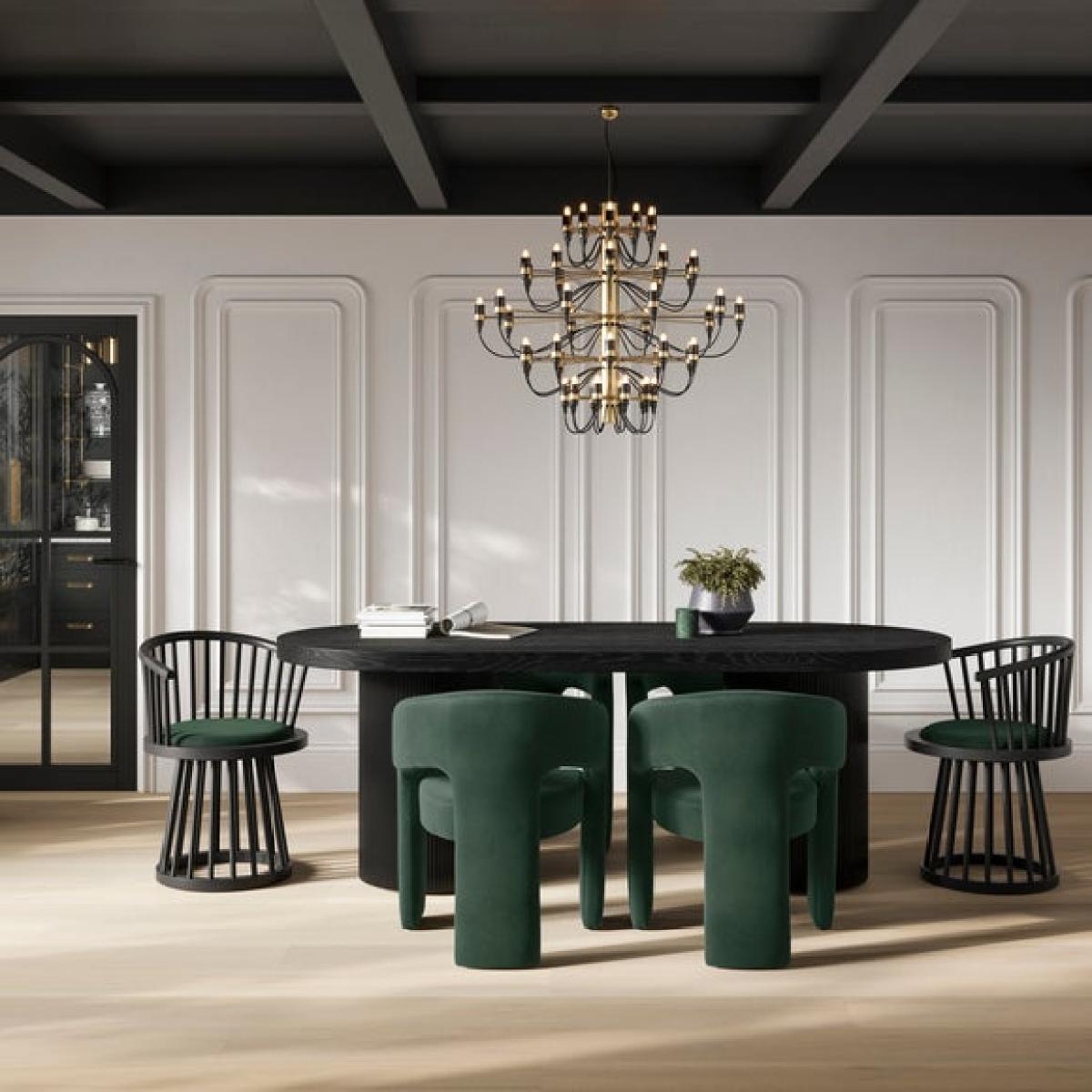 * Made from wood * Velvet material * Modern style Style meets structure in the LPD Lina Velvet Dining Chair. With a soft velvet seat and a sleek black satin wood frame, its curved spindle back and cylindrical base offer a visually striking yet supportive design. Perfect for modern dining rooms or artistic interiors.