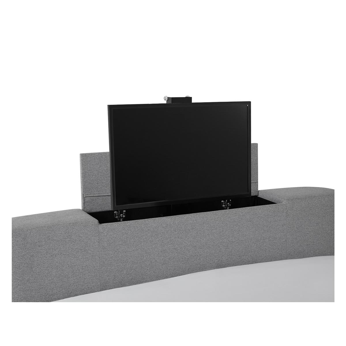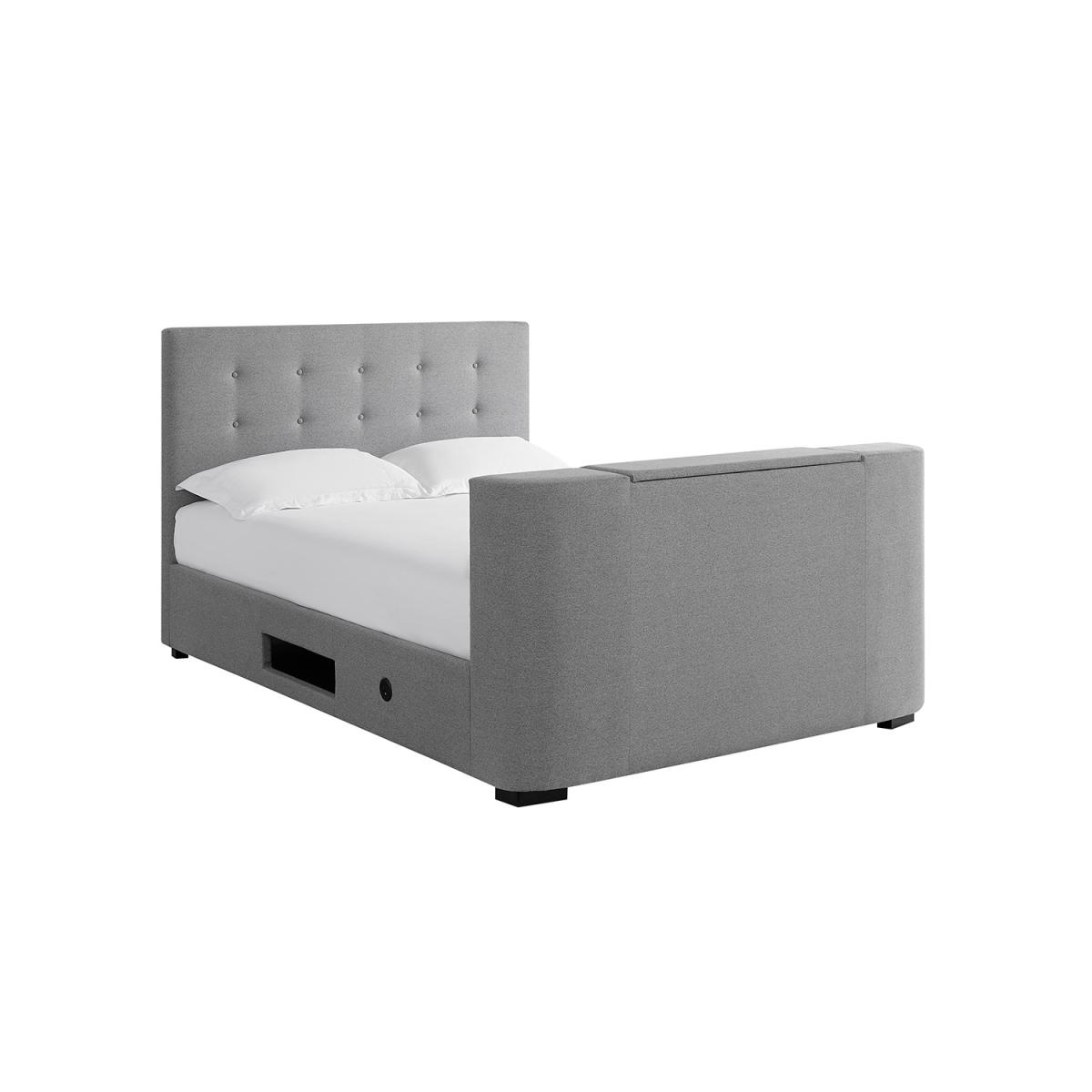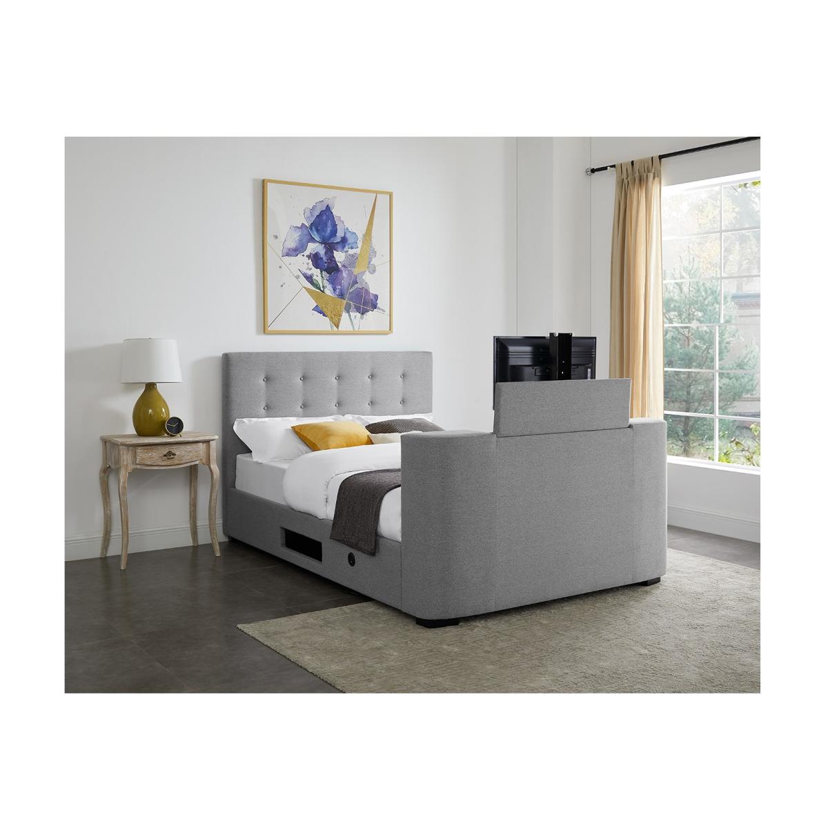 Dimensions H121.5 x W146 x D226 cm. Watch your favourite TV shows and films from the comfort of your own bedroom when installing the cosy Mayfair Double Bed. Coming in a neutral simple yet stylish grey colour this bed will make your bedroom feel like luxury as the TV is held in the integrated foot end. The Mayfair is a classic traditional looking bed with a modern twist. So much so you'll begin to feel like you're in your very own private cinema! Features. The Mayfair features an electric lift mechanism for the screen and supports a maximum size of 32TV is held in the integrated foot end. Button detail on the headboard. Available in double or kingsize. Easy assembly..