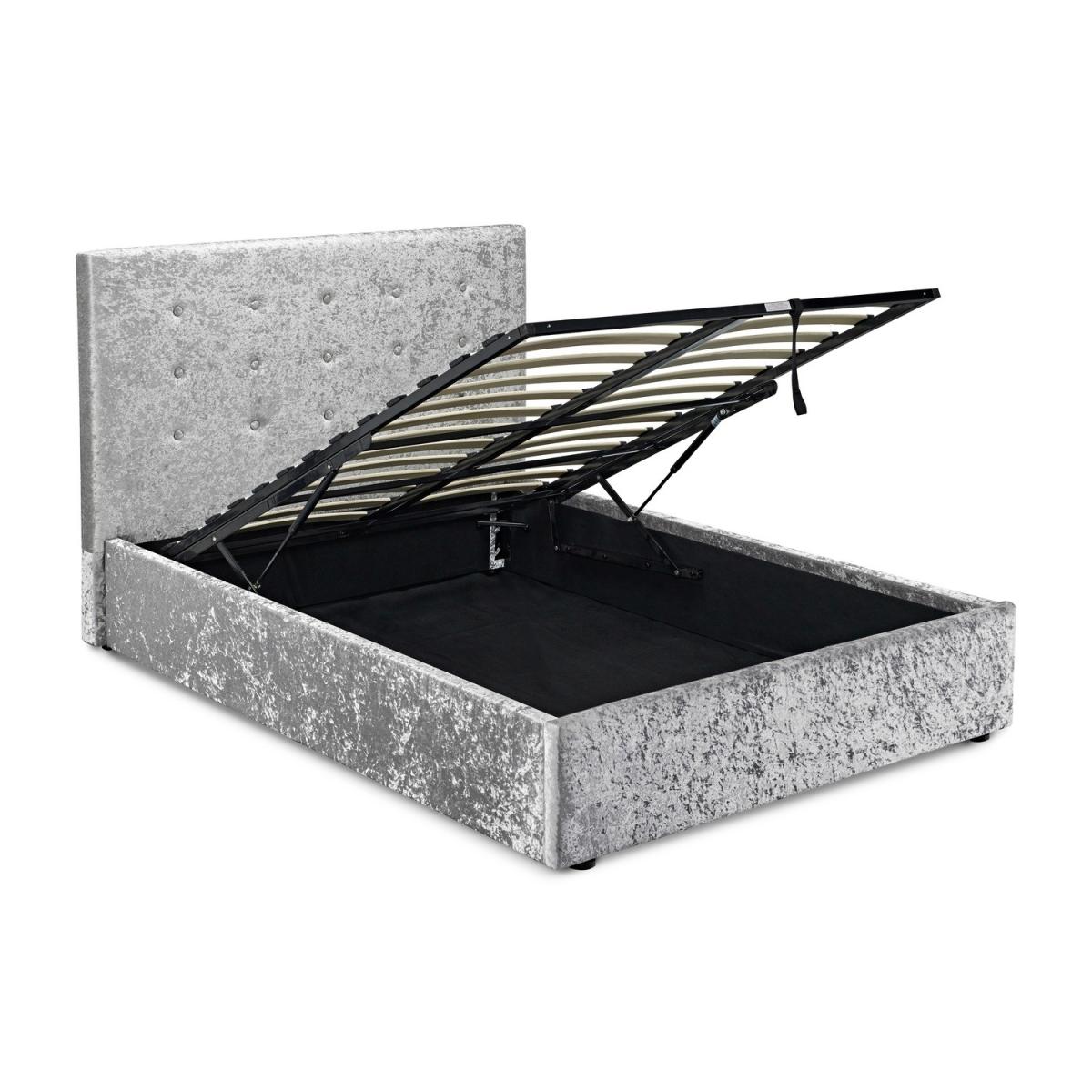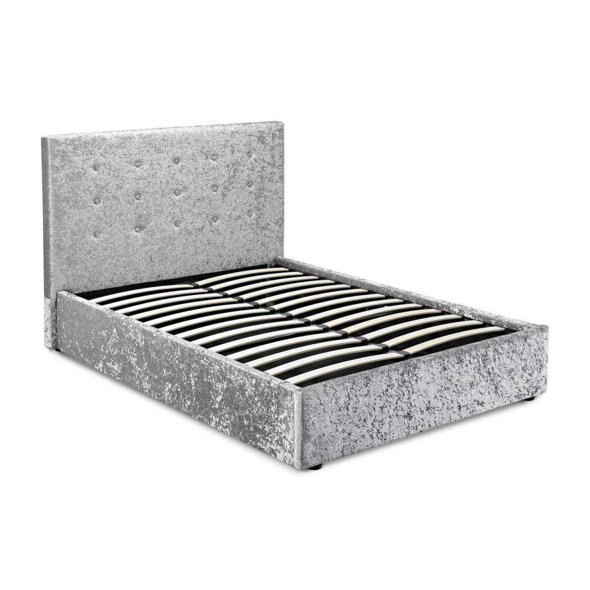 Dimensions W167.5cm x D216cm x H112cm Features. Finished in luxuirous crushed velvet. Upholstered with coordinating button detailing. Generous hidden storage space included. Hydraulic assisted mattress base Assembly required..