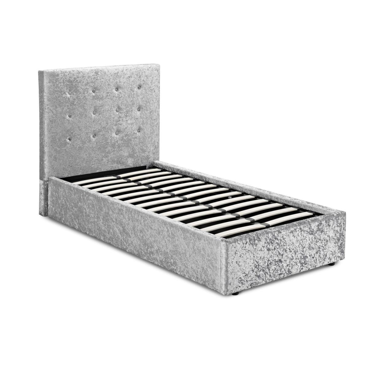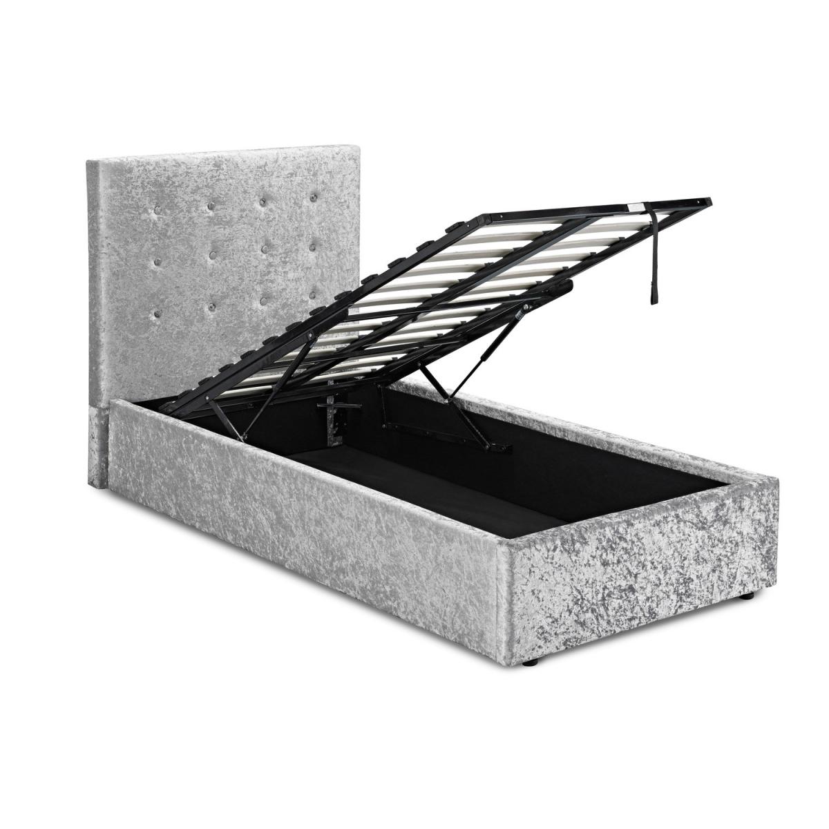 Dimensions W107.5cm x D206cm x H112cm Features. Finished in luxuirous crushed velvet. Upholstered with coordinating button detailing. Generous hidden storage space included. Hydraulic assisted mattress base Assembly required..