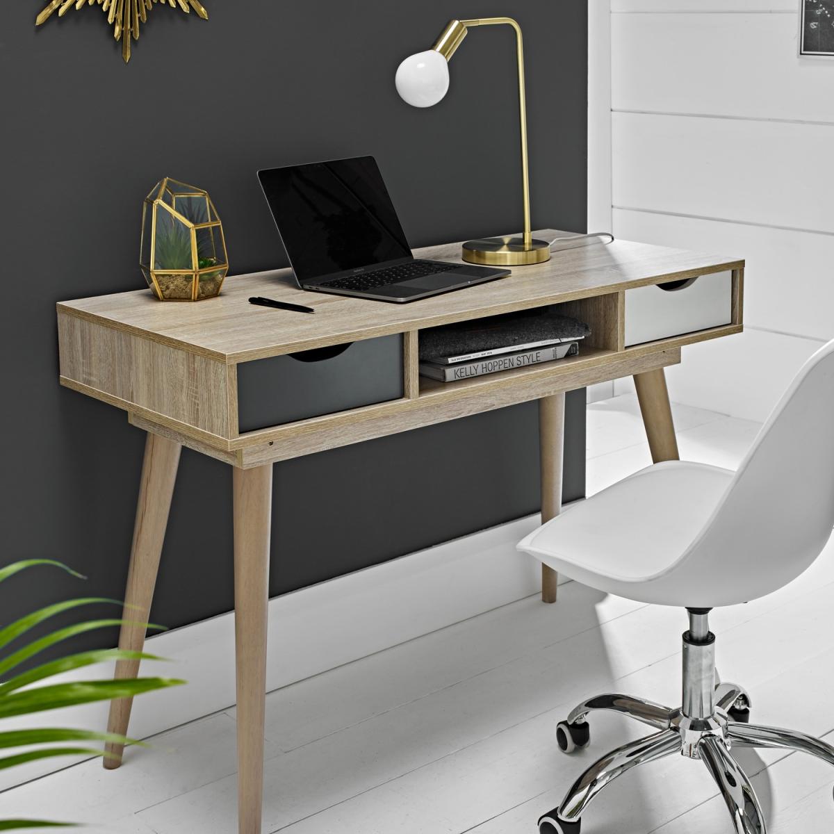 Dimensions W110cm x D50cm x H78.6cm Features. 2 Drawer Office/Writing Desk Oak affect with white and grey drawers. Scandinavian style Modern retro affordable furniture. Angled Scandi style legs. Simple assembly required..