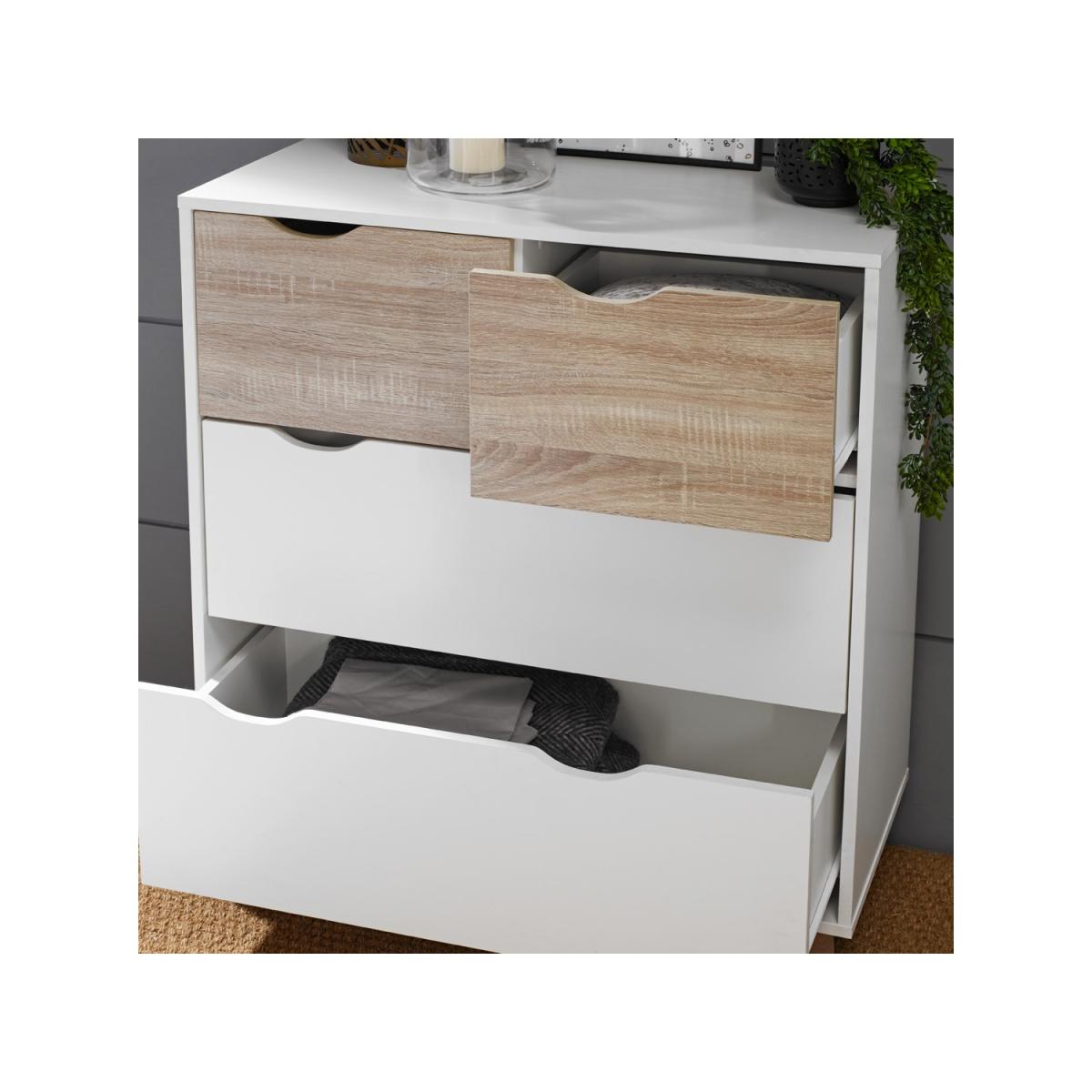 Dimensions W82cm x D39cm x H90cm Features. Contemporary scandi design4 drawers to store folded items. Matte oak and white finish. Sleek cut-out handles. Part of the Stockholm bedroom range..