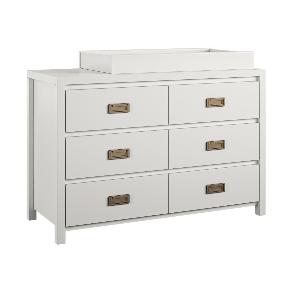 Enter the Little Seeds Monarch Hill Haven changing dresser. With its crisp white finish and fashionable gold drawer pulls, this campaign-style dresser, with a change table topper, will be the perfect storage solution for your baby's nappy-changing necessities. It features durable metal drawer slides with built-in stops for safety, and the change table topper fits a standard-size changing pad (not included). Once your little one outgrows the changing table, simply remove the topper to convert to a dresser.
