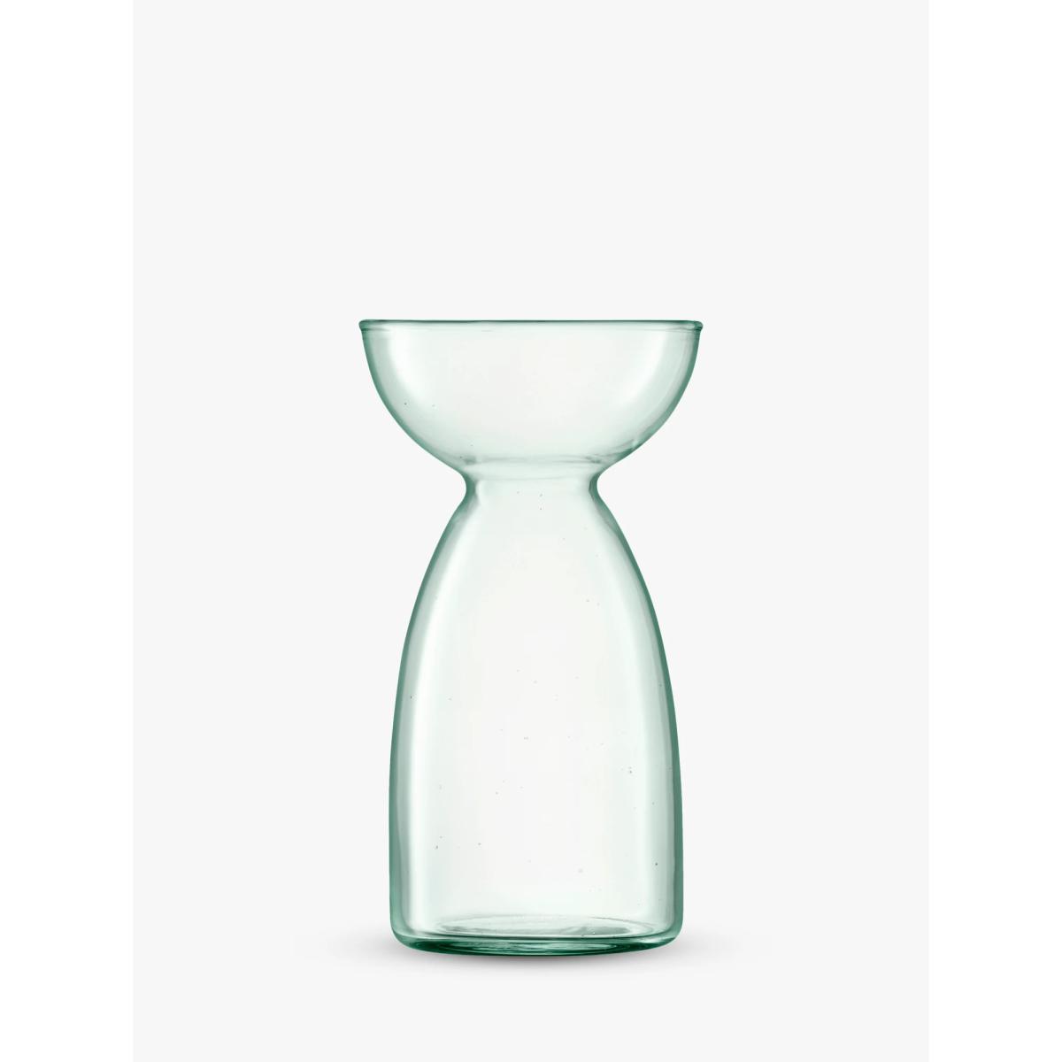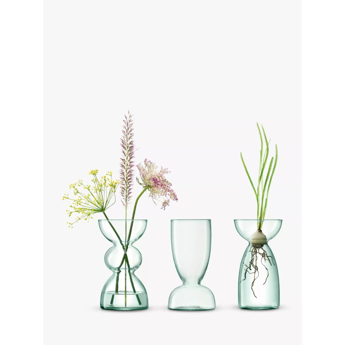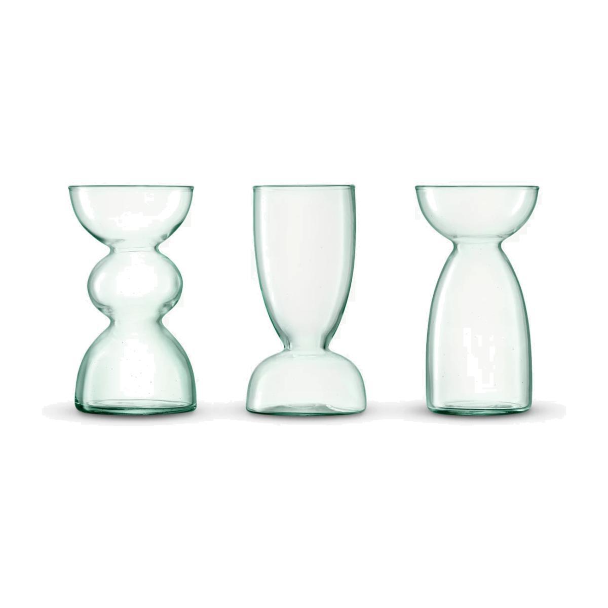 A trio of miniature vases handmade from recycled glass. Each vase has a distinctive shape suiting a single stem or a small posy of grasses or wildflowers. Alternatively, sit a single bulb in its narrowest part to encourage the development of roots in the water below. LSA International's Canopy range of glassware has been developed with Cornwall attraction the Eden Project. Made of sustainably produced glass, the vases are presented in packaging made of recycled, recyclable materials and printed with organic vegetable inks.