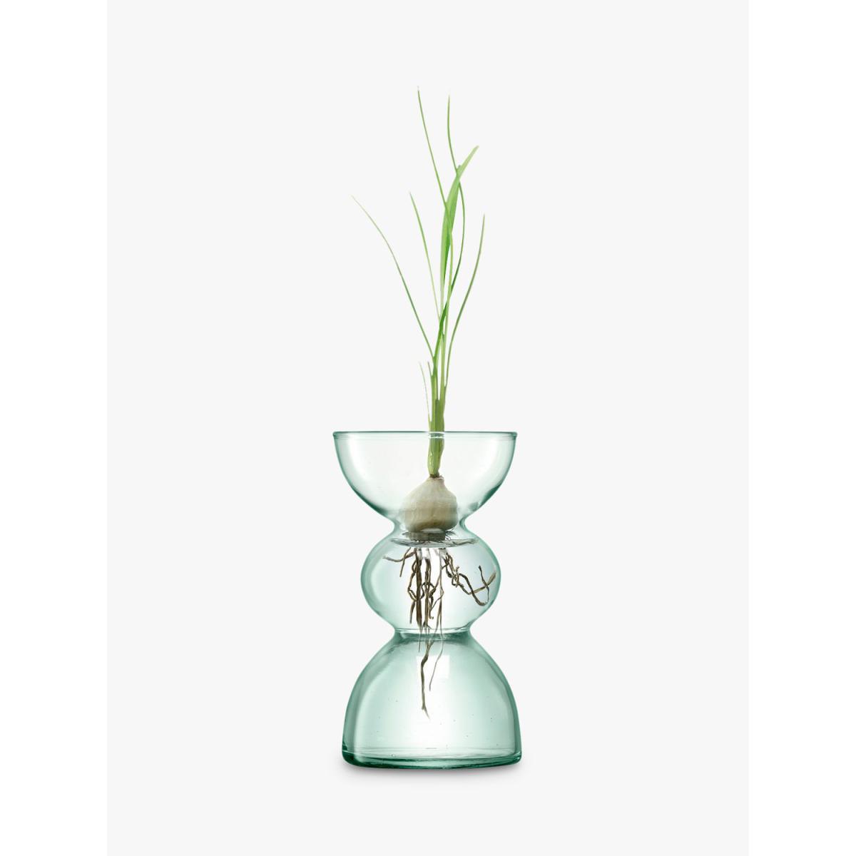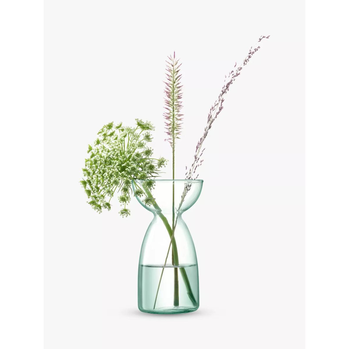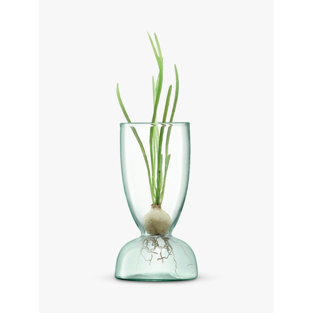 A trio of miniature vases handmade from recycled glass. Each vase has a distinctive shape suiting a single stem or a small posy of grasses or wildflowers. Alternatively, sit a single bulb in its narrowest part to encourage the development of roots in the water below. LSA International's Canopy range of glassware has been developed with Cornwall attraction the Eden Project. Made of sustainably produced glass, the vases are presented in packaging made of recycled, recyclable materials and printed with organic vegetable inks.