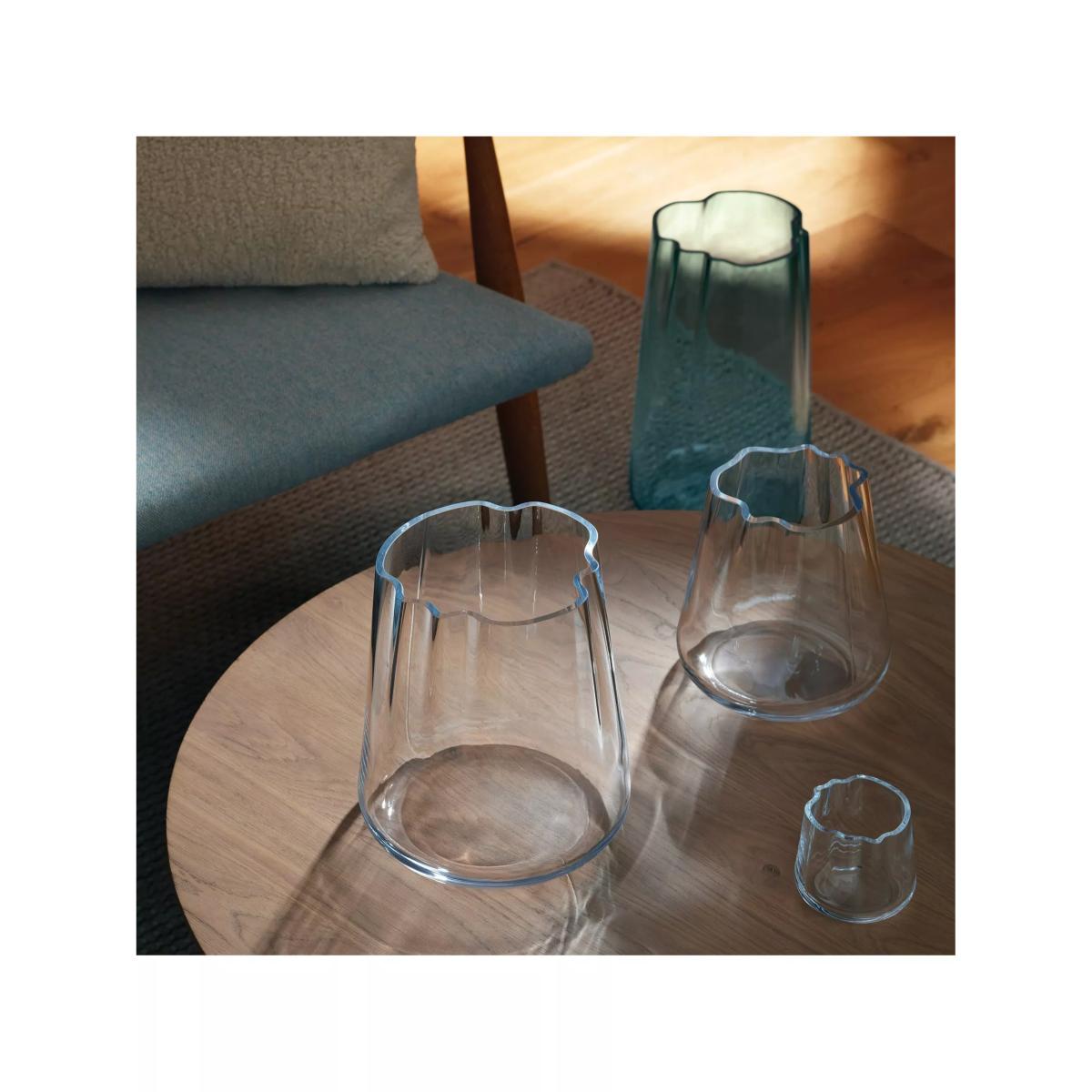A low mouth-blown glass vase/lantern with a curved shape evocative of a lagoon. Use as a mini lantern with a burning candle within, or as a vase for naturally arranging flowers in the undulating curves of the glass.