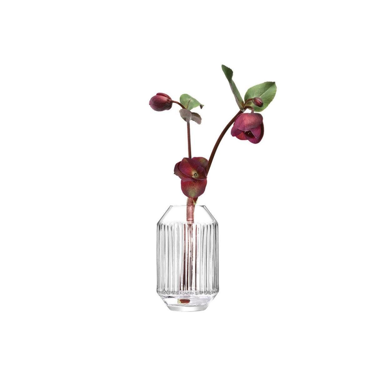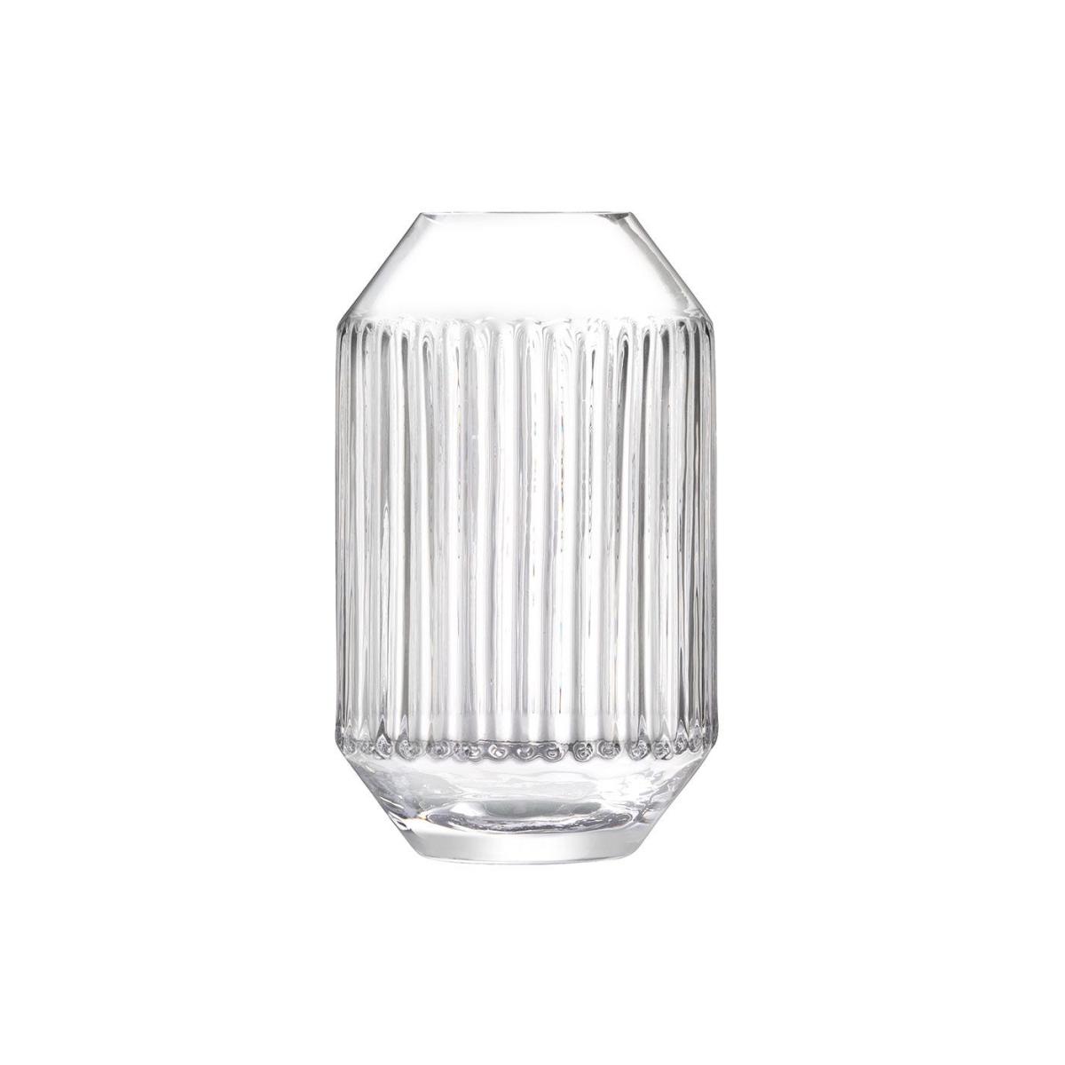 A small mouth-blown glass vase with angled walls and a band of corrugated texture inspired by architectural detail. For a few sprigs of flowers or foliage.