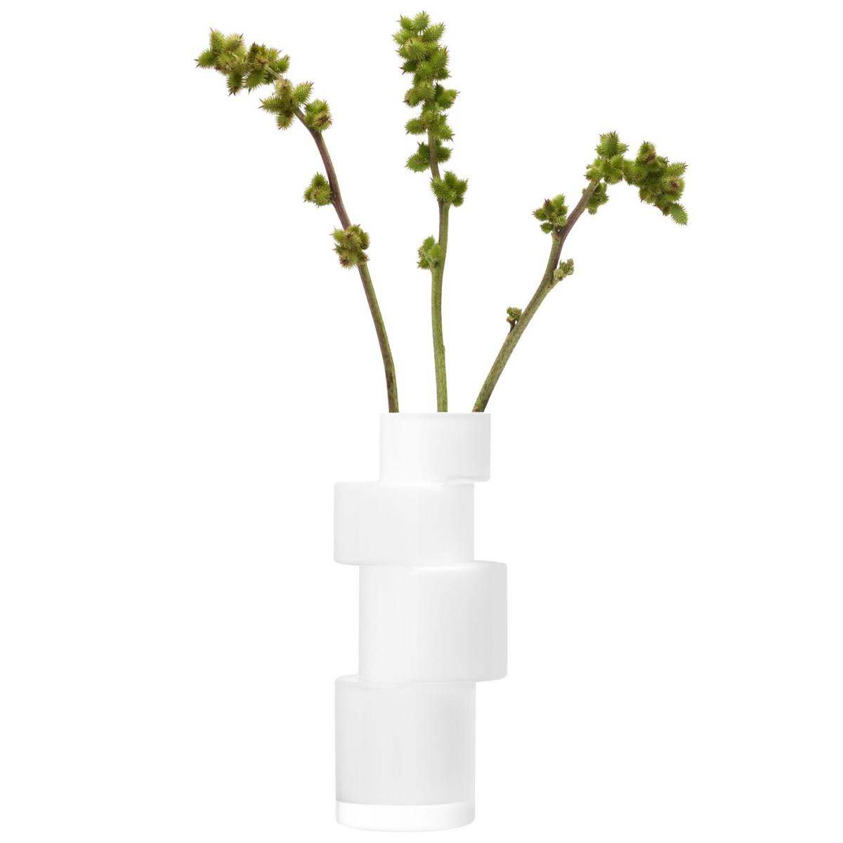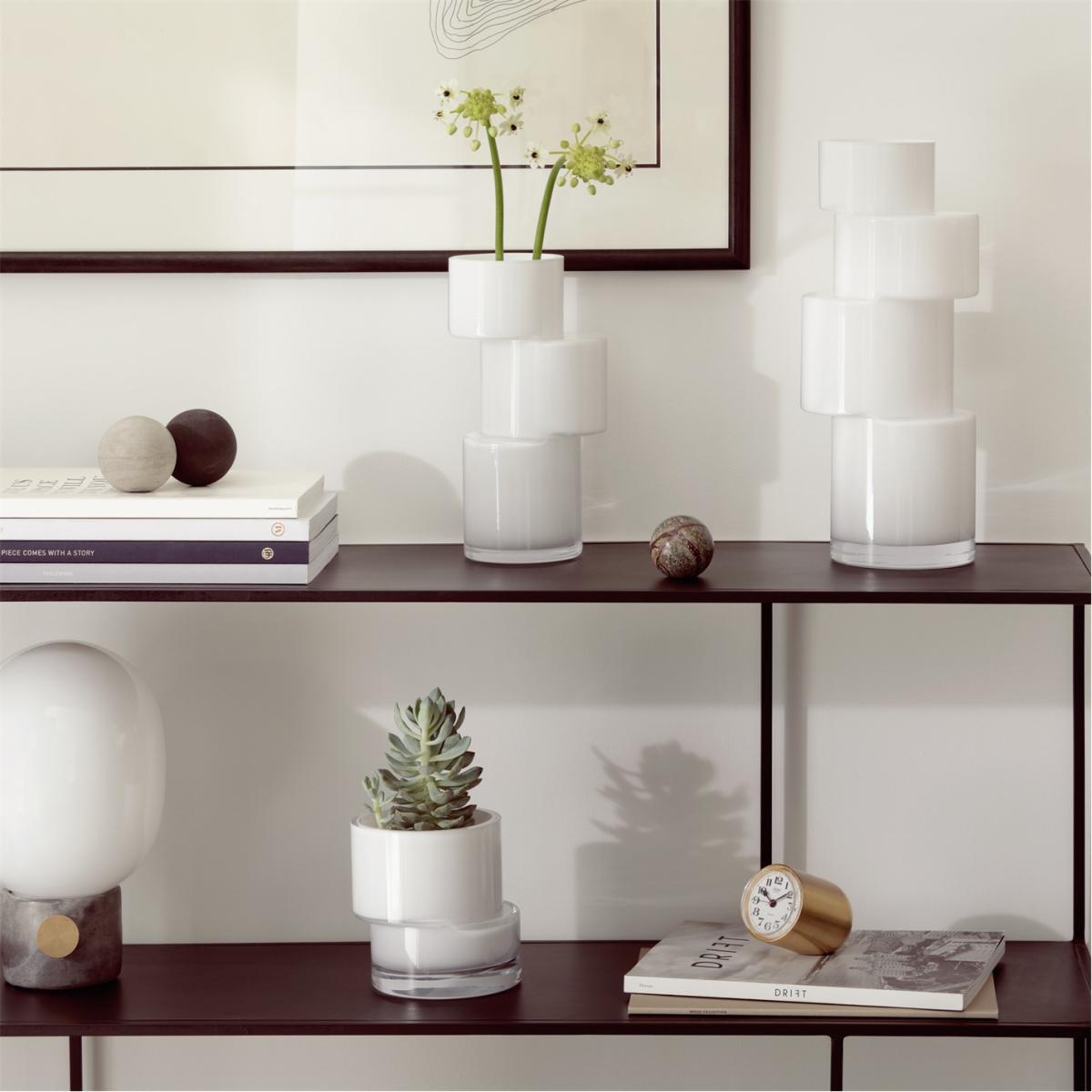 I’m a fan of this Tier vase for its clean, stacked silhouette and soft, frosted glass finish - it instantly adds architectural interest without overwhelming a space. It works particularly well in minimalist, Scandi-style or contemporary interiors where its subtle curves can stand out against a pared-back backdrop. For styling, try a single stem or two of dried grasses for a relaxed look, or go bold with a spray of deep-coloured blooms to contrast its white tones. Place it on a low shelf or console alongside metal or wood accents to balance its lightness.