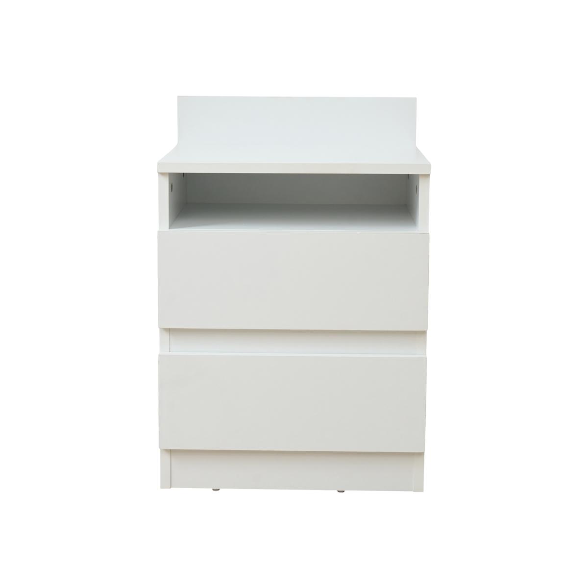 Elevate your bedroom aesthetics with the Luca Bedside Table. Crafted from durable particle board and finished with a sleek paper overlay, this elegant piece comes in a refreshing white hue that effortlessly complements any bedroom decor. With two spacious drawers and a handy shelf, the table provides ample storage space for keeping your essentials organised and within easy reach. The drawers are ideal for stowing away bedtime necessities like books, glasses, or personal items, while the shelf offers a perfect spot for displaying decorative pieces or keeping your nighttime reading materials handy. This bedside table not only enhances your room but also promotes a clutter-free environment, ensuring that your bedroom remains serene and inviting.