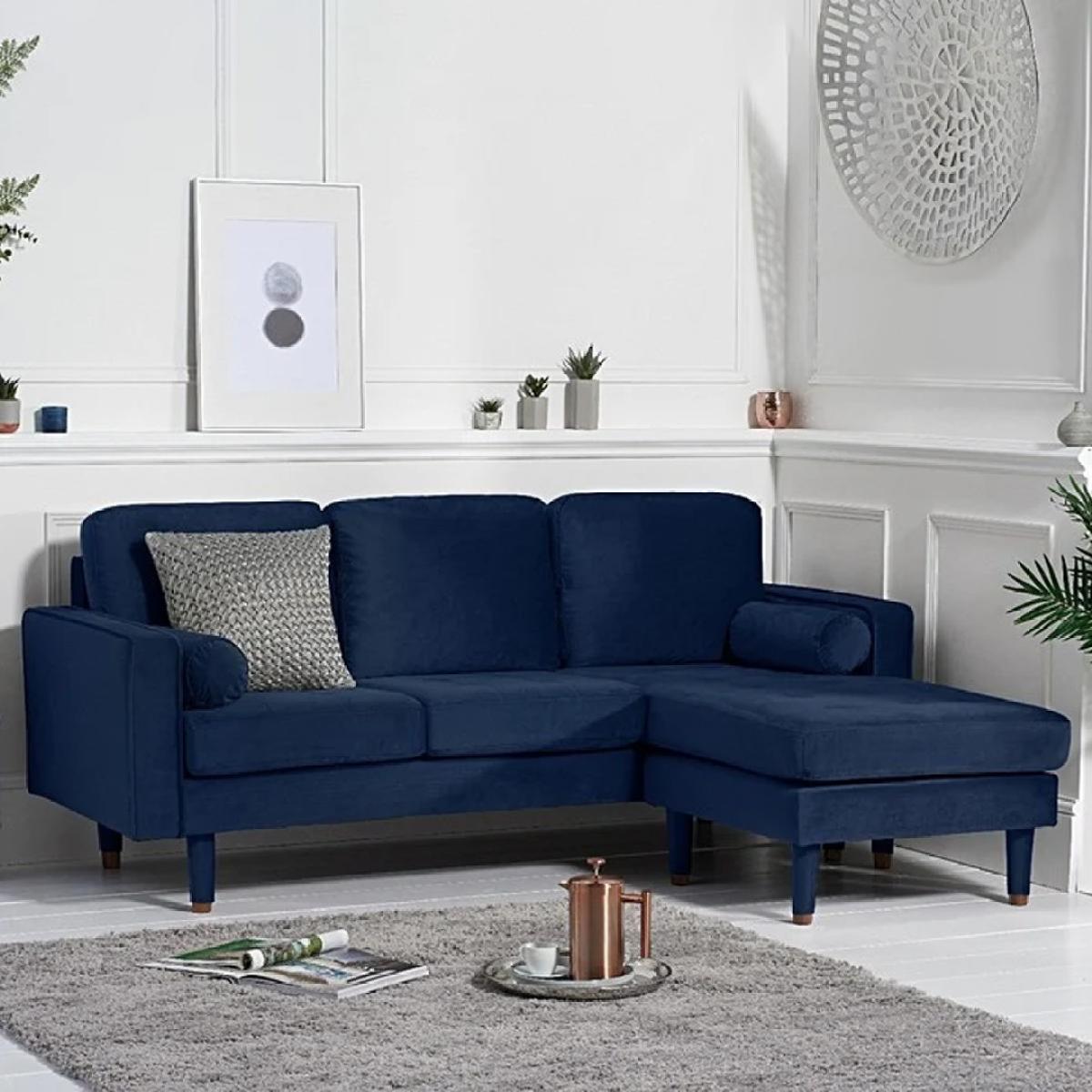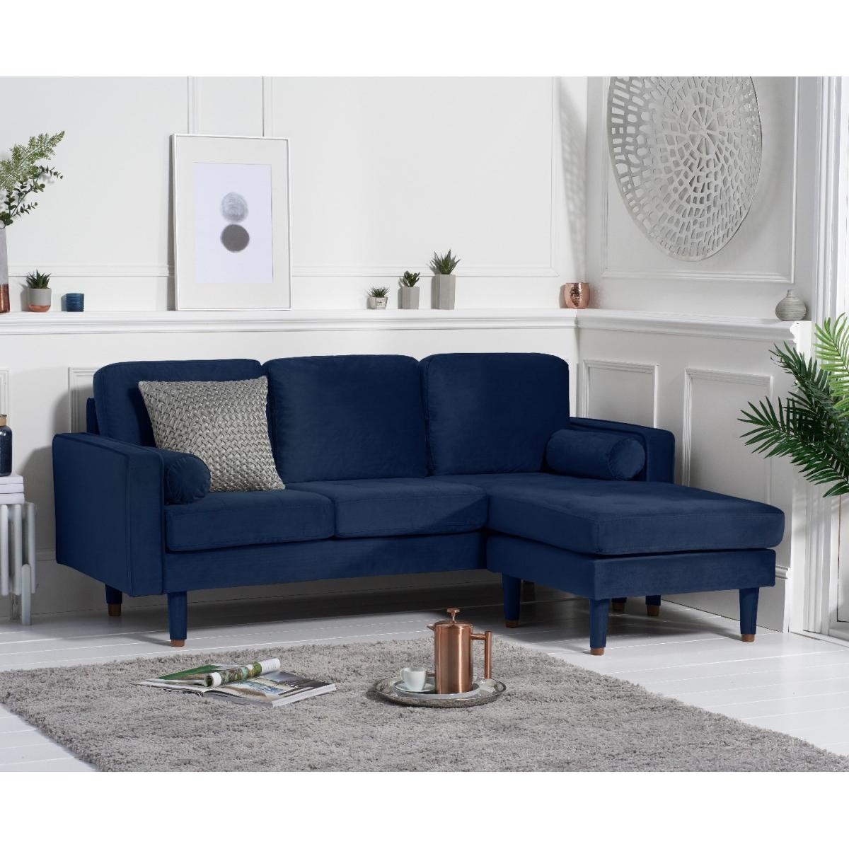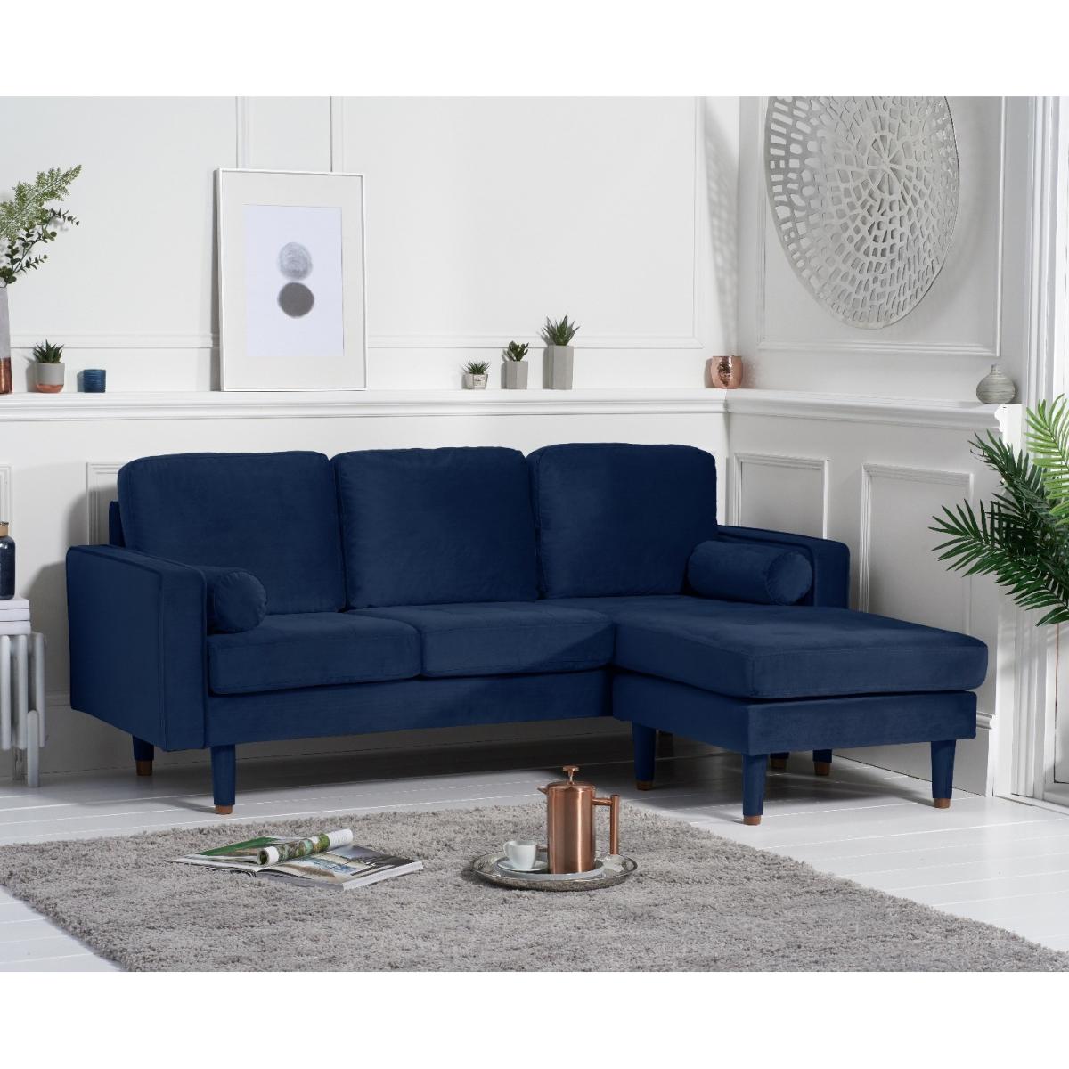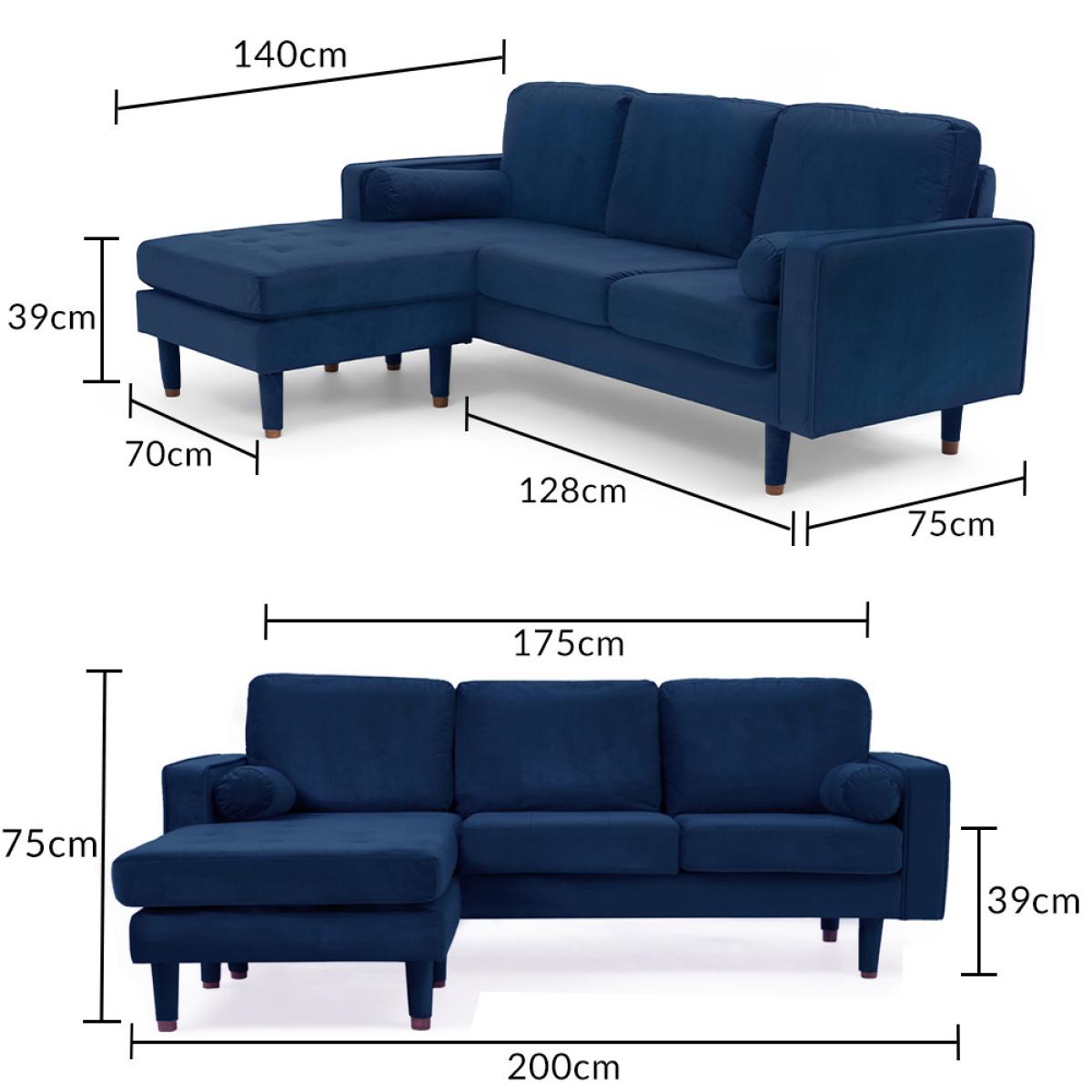 The Luca Blue Velvet 3 Seater Reversible Sofa features a simple, modern shape and luxe blue velvet. With a practical chaise section that can be swapped from left to right, the Luca features removable seat covers and velvet covered legs with dark wood tips. A comfortable addition to any home. Stylish and spacious reversible sofa. Luxurious blue velvet upholstery. Densely padded seat and back cushions for maximum comfort Removable seat covers for easy cleaning. Velvet covered legs with dark wood tips. Reversible chaise design. Change sofa from left to right facing with ease. Additional Measurements:Chaise Length: 106cm. Armrest Height: 54cm. Seat Depth:50cm Seat Width:177cm Armrest Width:12cm. Backrest Height:44cm Floor to Seat Height:39cm Leg Thickness:5cm Underside Clearance: 12cm