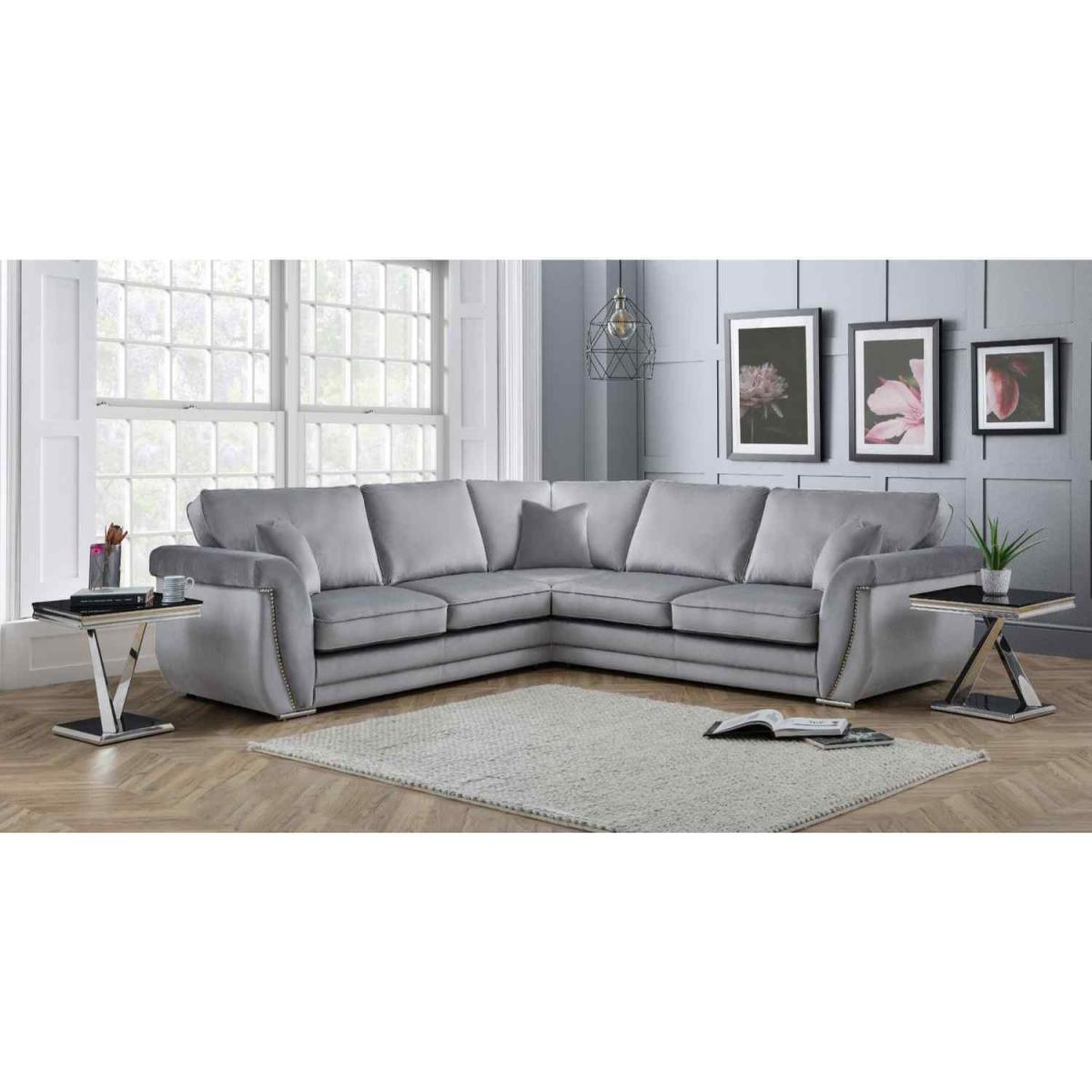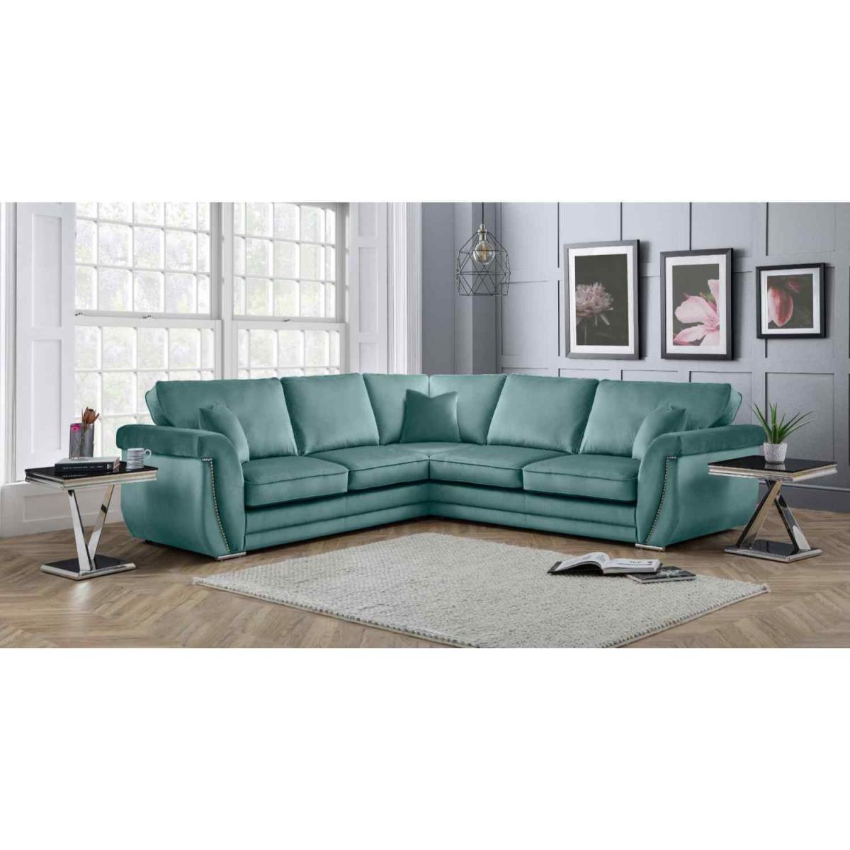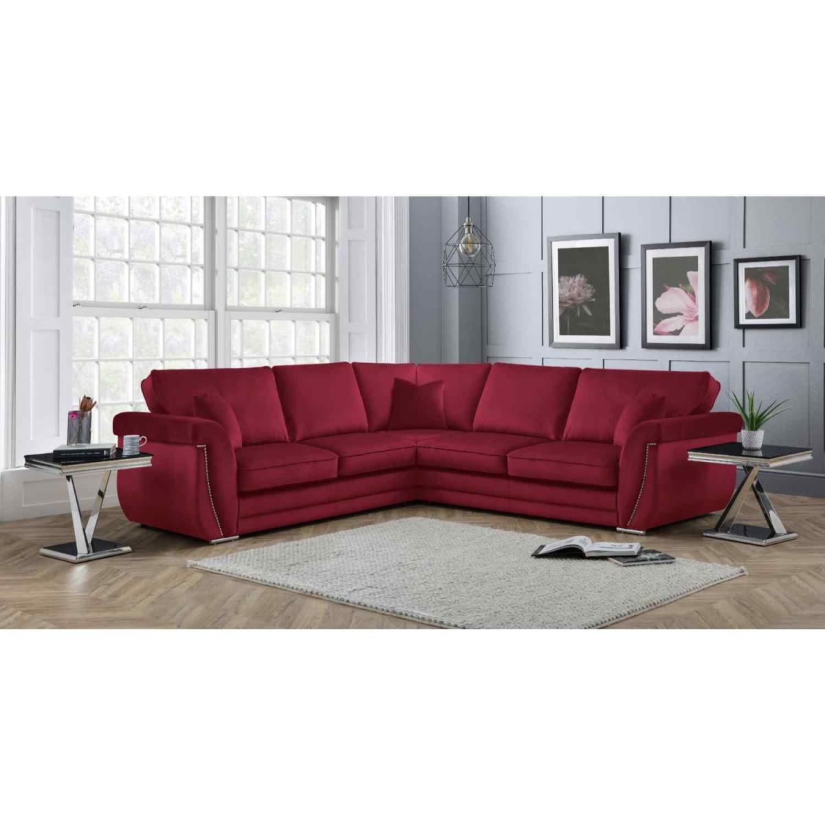 UK Made Corner Sofa, Premium plush velour fabric, this beautiful corner sofa includes a solid hardwood frame used and expert upholstery, this sofa is sure to be a crowd pleaser! 3 Scatter cushions included and finished off with stunning beading around the sofa.