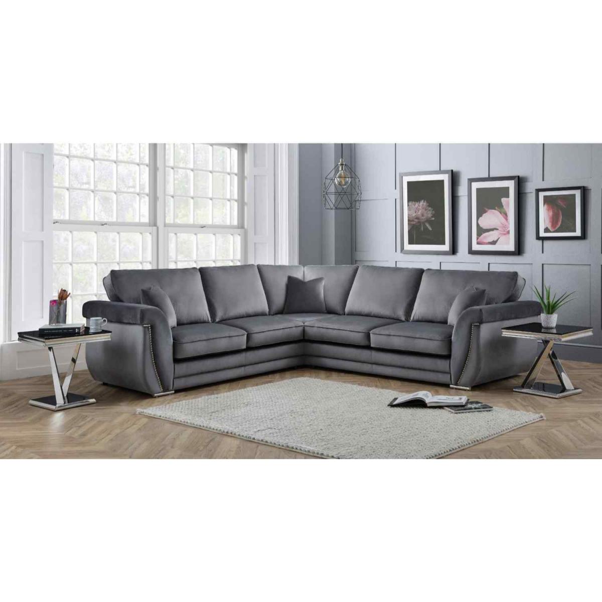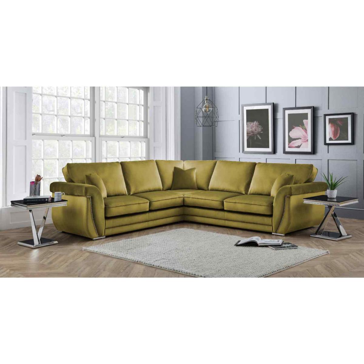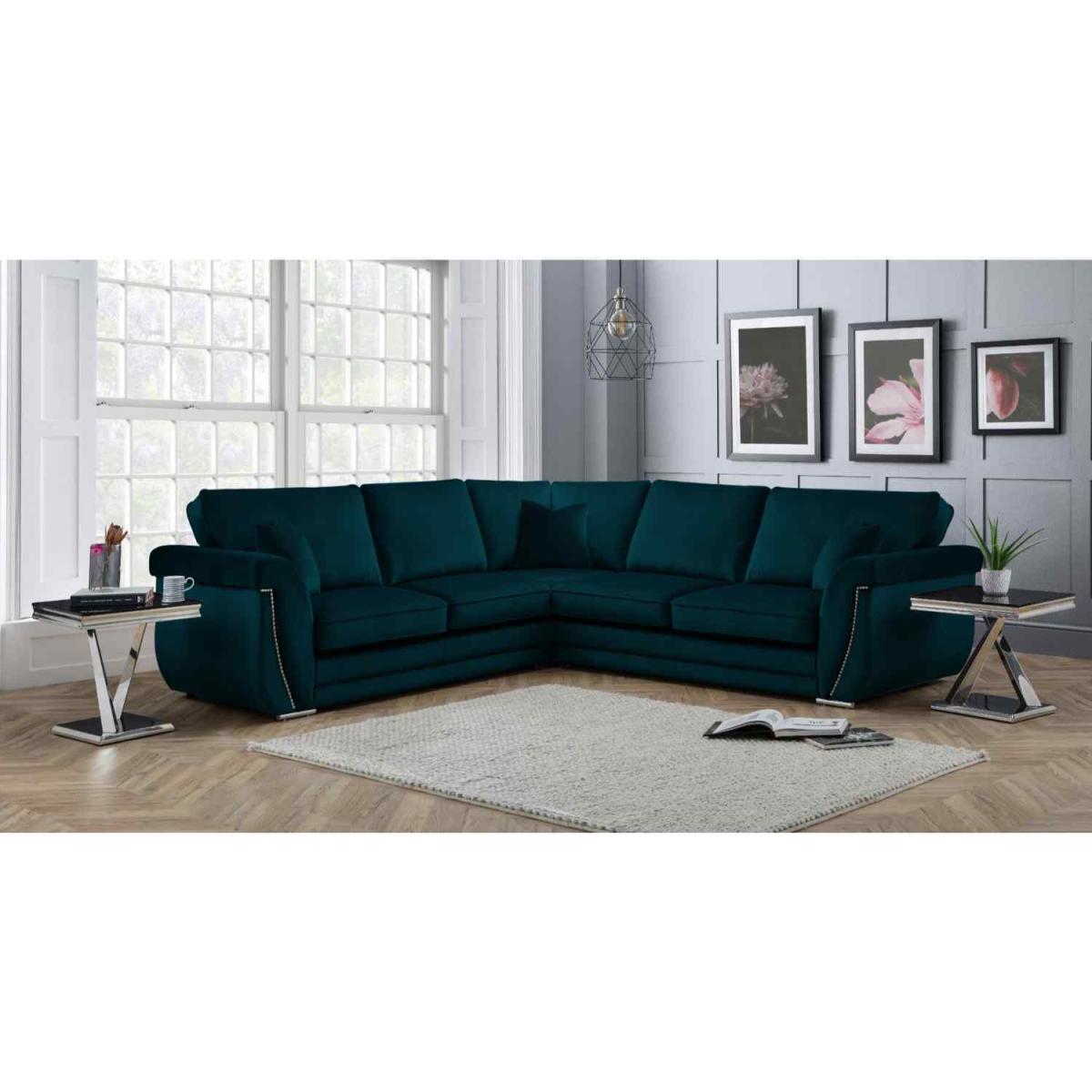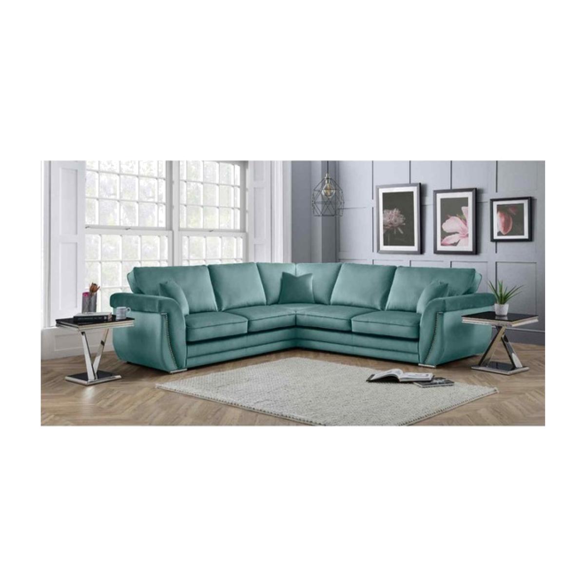 UK Made Corner Sofa, Premium plush velour fabric, this beautiful corner sofa includes a solid hardwood frame used and expert upholstery, this sofa is sure to be a crowd pleaser! 3 Scatter cushions included and finished off with stunning beading around the sofa.