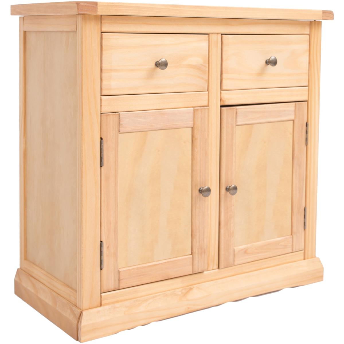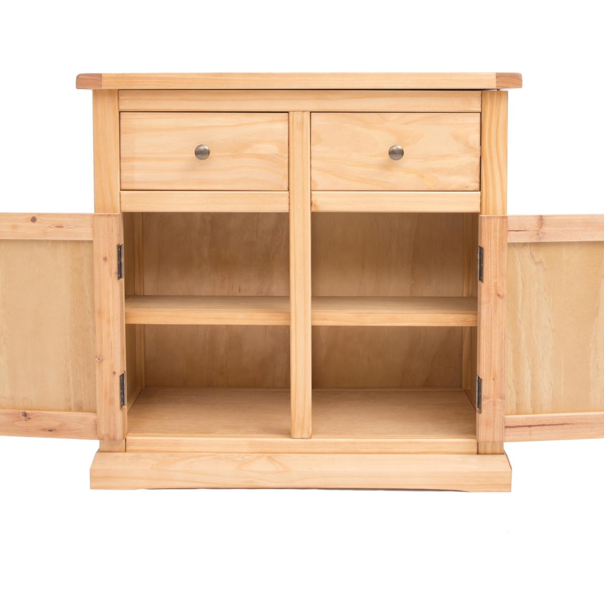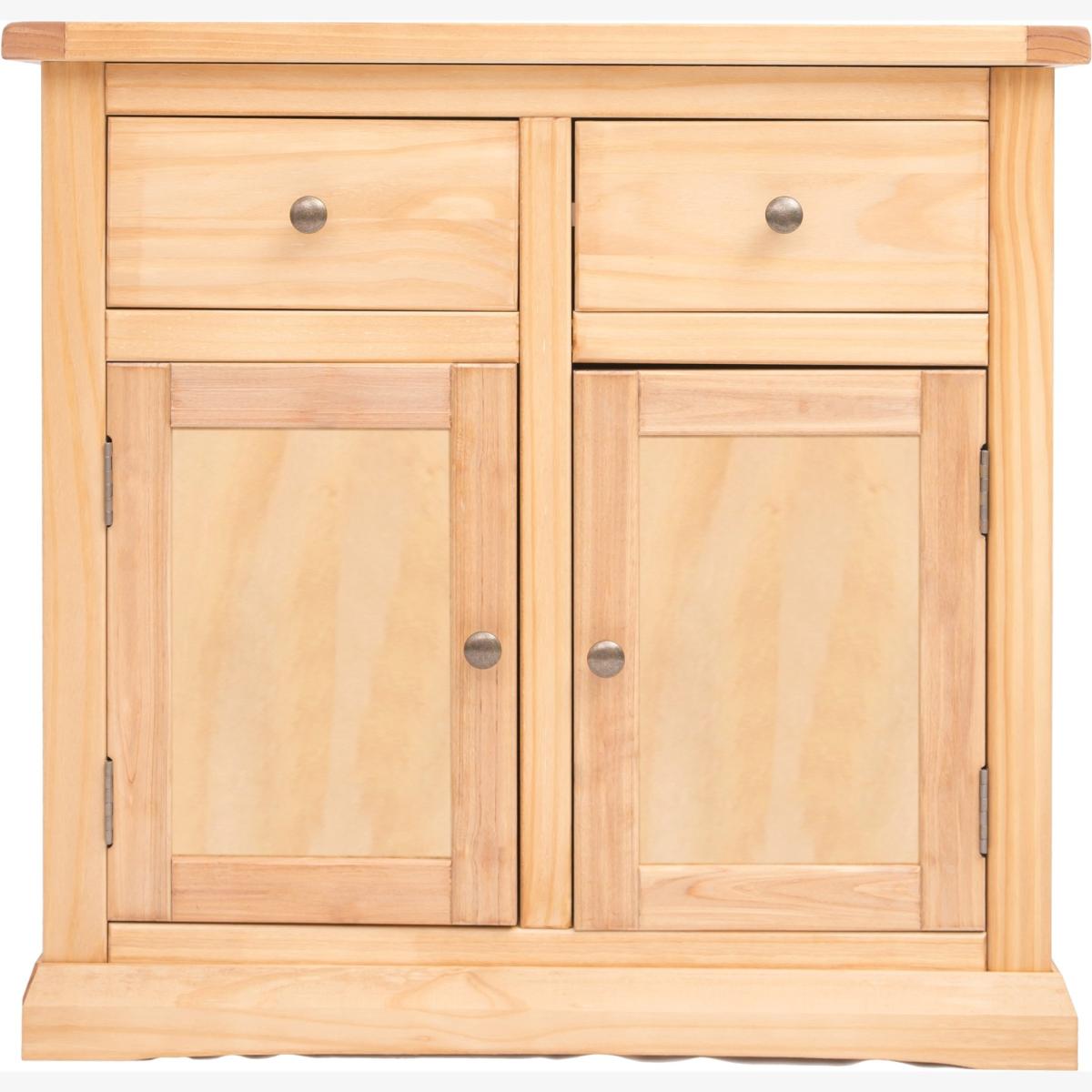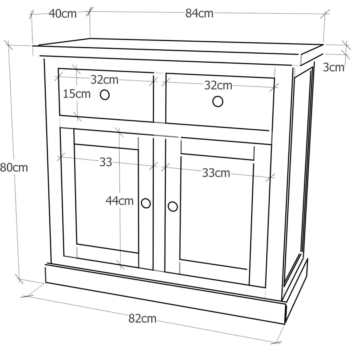 Our Lucca collection has a simple but pleasing design and is produced by our skilled craftsmen to the highest standards using responsibly sourced wood and veneers. All cabinets are made using a combination of solid pine wood and veneers and are carefully hand waxed on an antique finish giving it a great look. A compact 2 door 2 drawer sideboard ideal for your kitchen, dining room or lounge. The two doors conceal a large cupboard space for storing crockery, bottles or glassware and there is a shelf to help you organise your contents too. Above this there are two drawers for cutlery, napkins, place mats or maybe even keeping essential paperwork to hand. These attributes combined with a simple construction for easy assembly makes it a great value product to be taken home today.