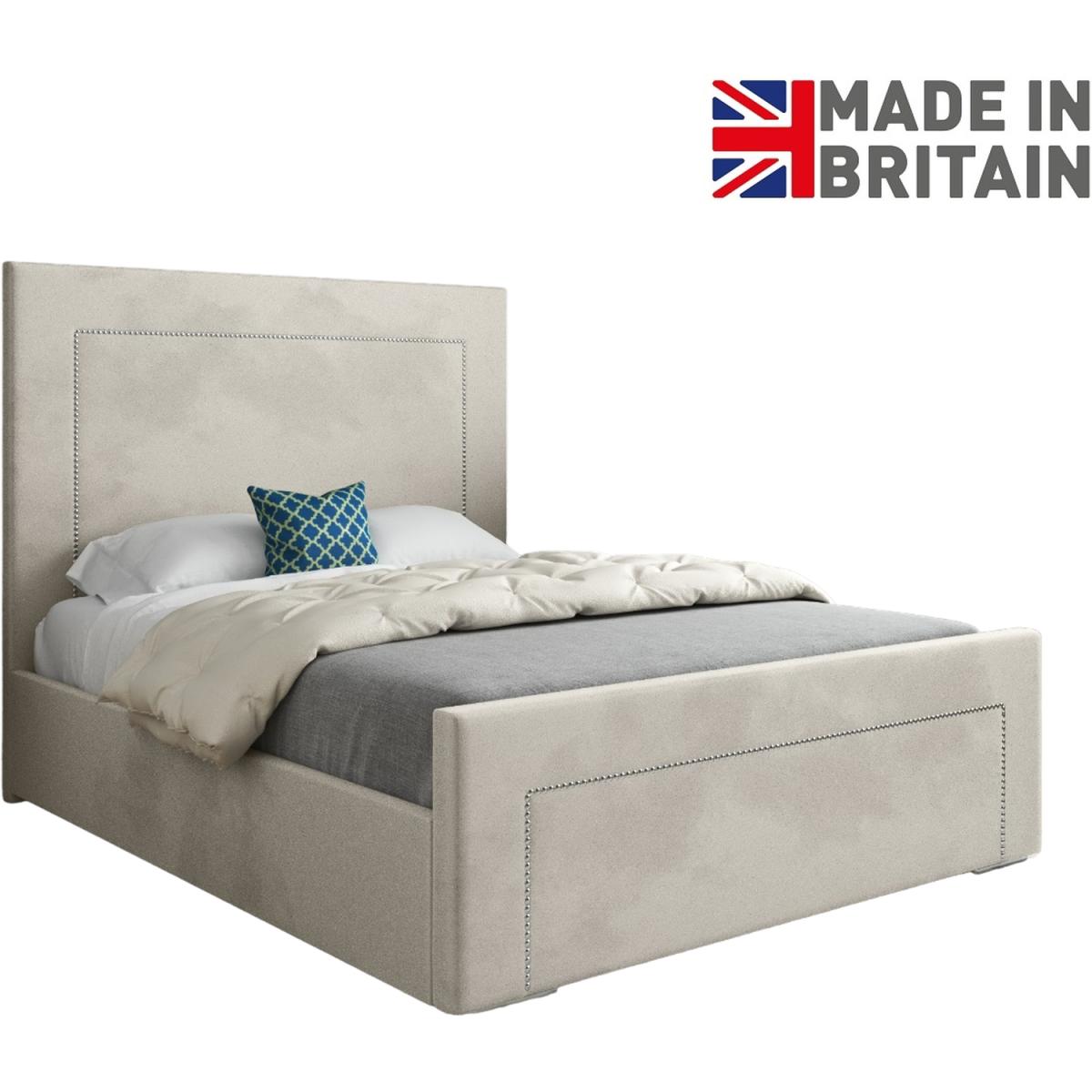 This simple yet effective design is spectacular. The bed is generously padded and upholstered in your chosen fabric. You can select the colour of your beadingstuds to subtly compliment or contrast given your interior needs. Minimalistic style choice but a clear, loud fashion statement. High headboard with a proprtionately high footboard to conceal your mattress. Compliment your beading choice with chrome pipe feet on the footboard. Solid statted base for ventilation of your mattress