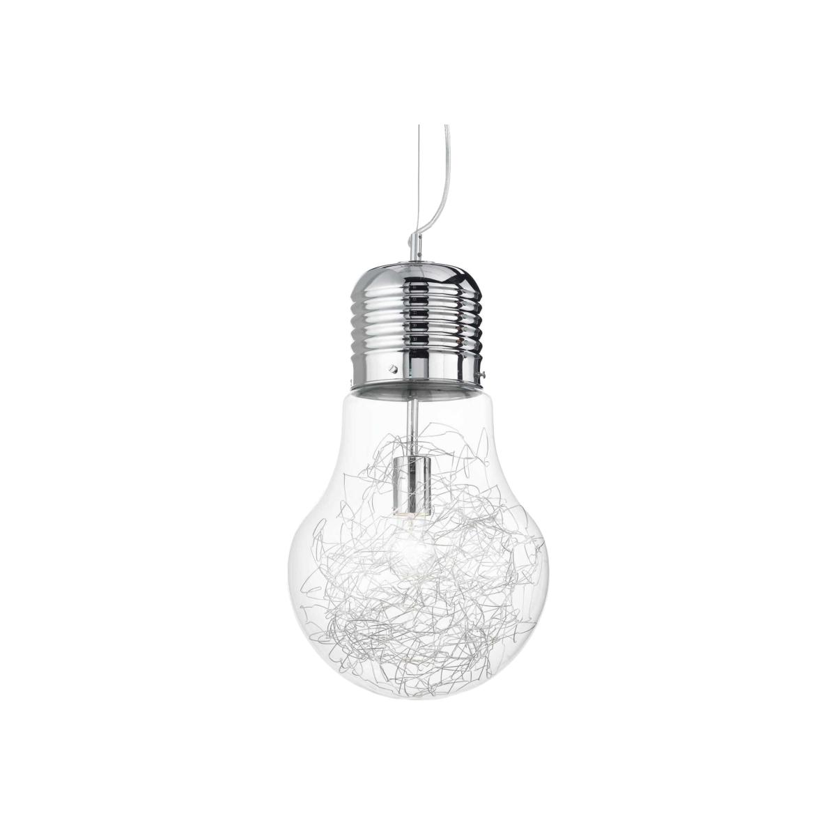 Introducing the Luce Max Light Bulb Shape Small Ceiling Pendant in chrome finish. This single light pendant features a classic bulb shape filled with fine aluminium thread. Perfect for adding a touch of elegance to any room, this pendant is also available in other sizes and styles. Compatible with E27 bulbs, this pendant is a stylish and versatile lighting option for any space.