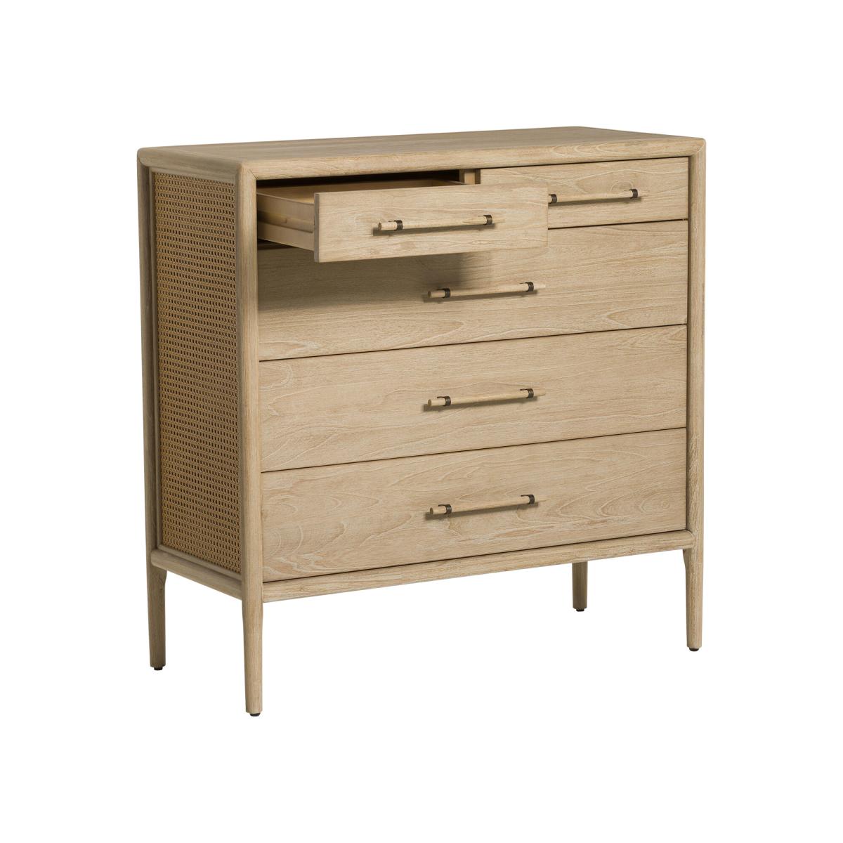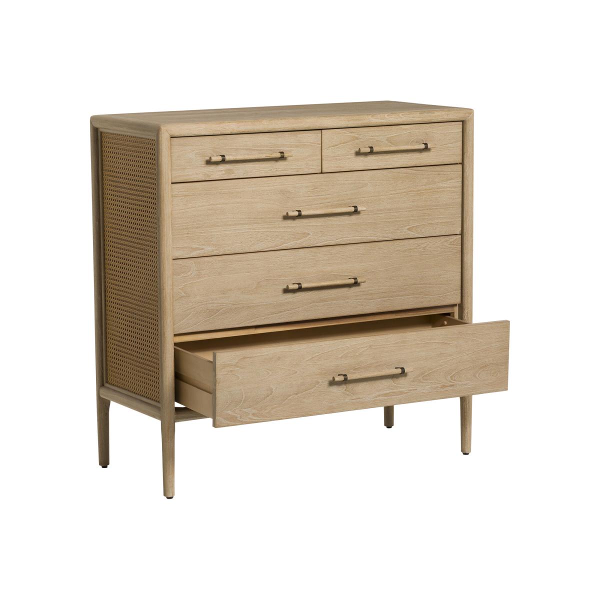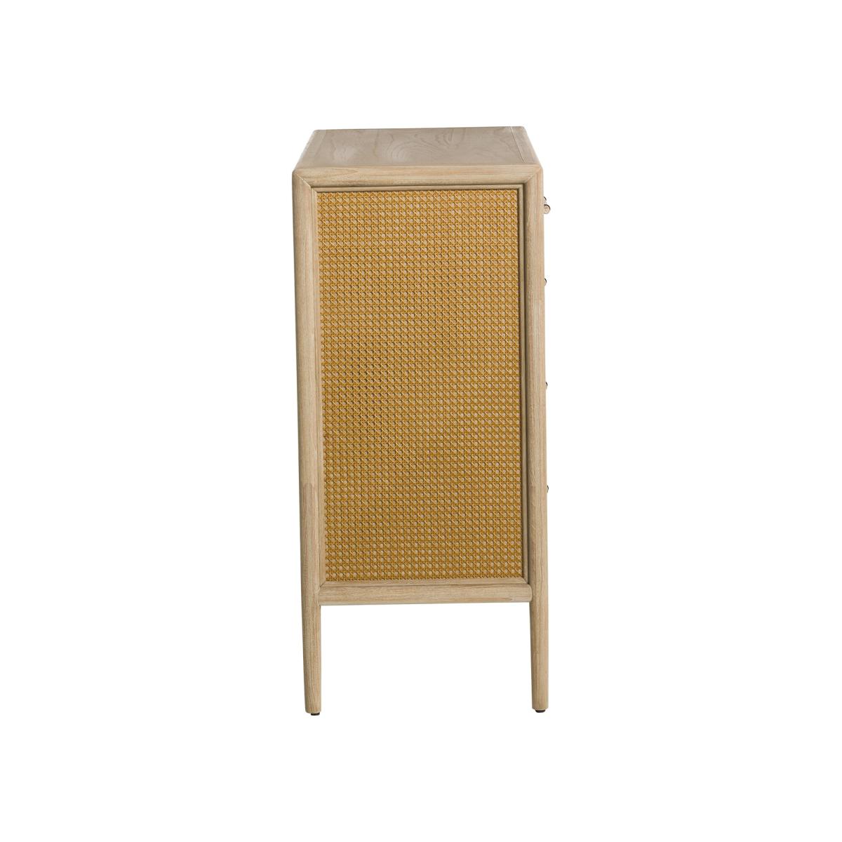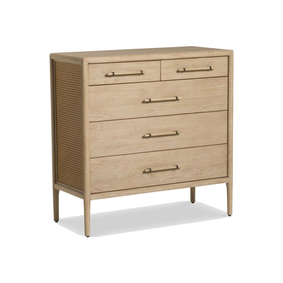 This beautiful chest of drawers blends natural warmth with classic design. Made from sturdy mindi wood and finished in a light mindi veneer, it features two smaller top drawers over three spacious main drawers—perfect for keeping everything neatly organised. The rattan side detailing adds a subtle tropical touch, bringing texture and charm to your space. Ideal for bedrooms or living areas seeking a relaxed, airy aesthetic.
