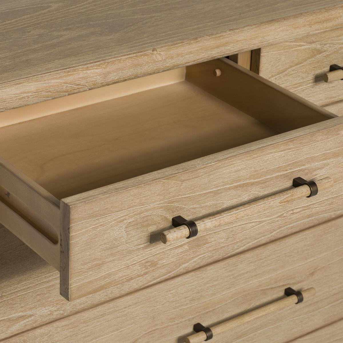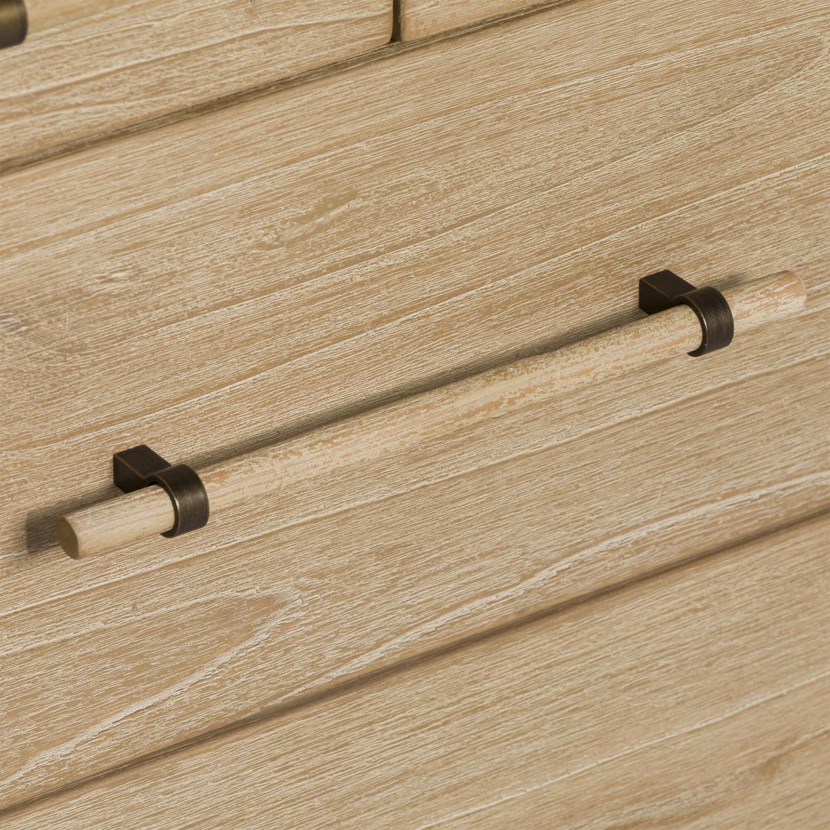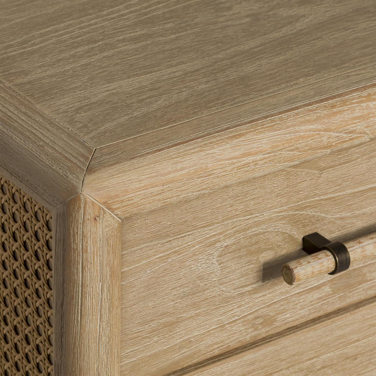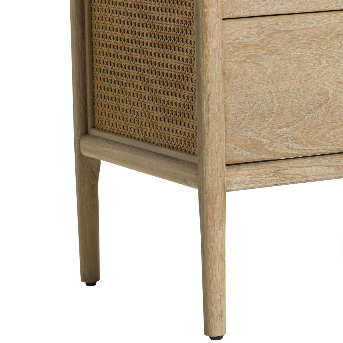 This beautiful chest of drawers blends natural warmth with classic design. Made from sturdy mindi wood and finished in a light mindi veneer, it features two smaller top drawers over three spacious main drawers—perfect for keeping everything neatly organised. The rattan side detailing adds a subtle tropical touch, bringing texture and charm to your space. Ideal for bedrooms or living areas seeking a relaxed, airy aesthetic.
