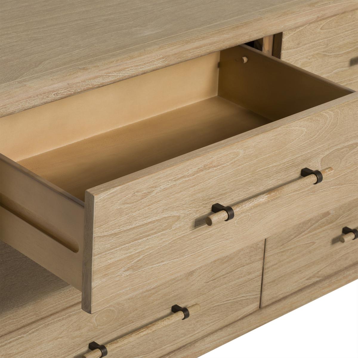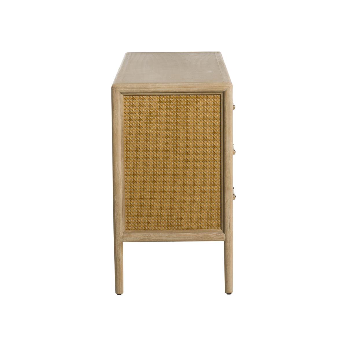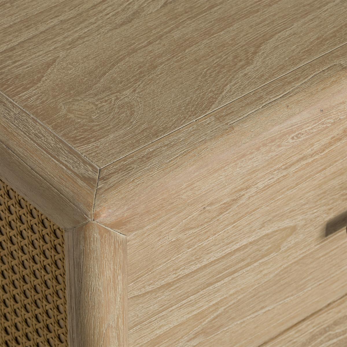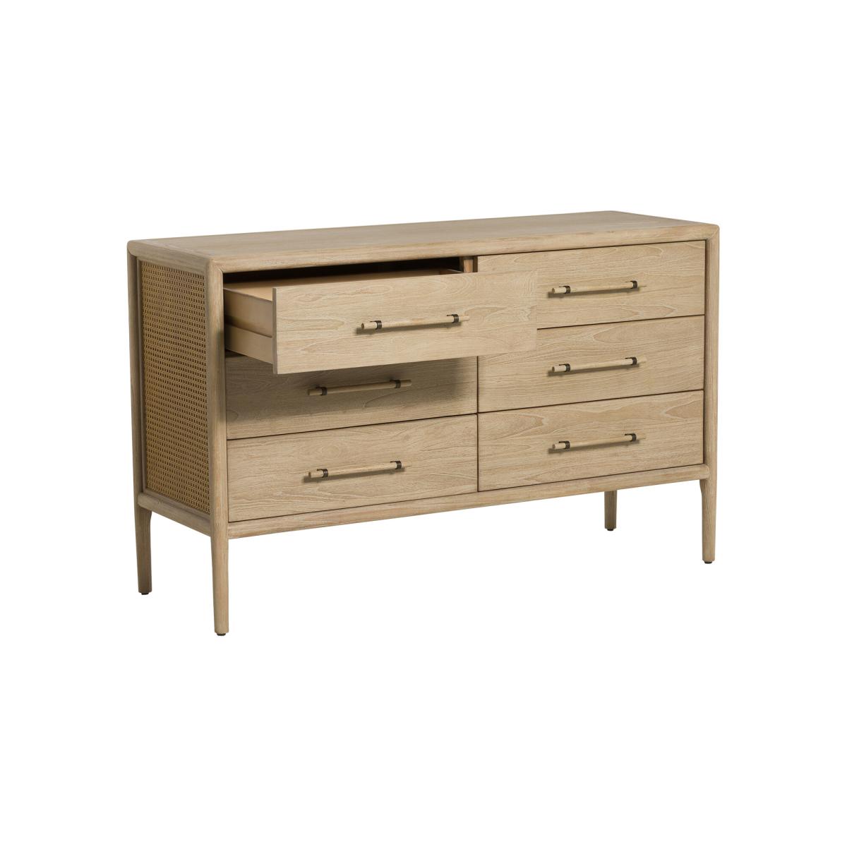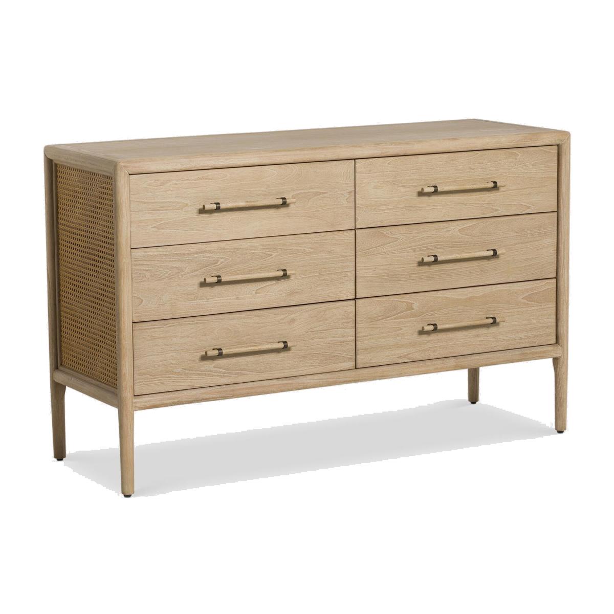 This elegant 6-drawer chest combines natural charm with timeless style. Crafted from durable mindi wood and finished in a light mindi veneer, it brings warmth and texture to any room. The rattan side detailing adds a touch of tropical flair, while the spacious drawers offer plenty of storage for clothing or household essentials. Perfect for creating a relaxed, airy feel in your bedroom or living space.