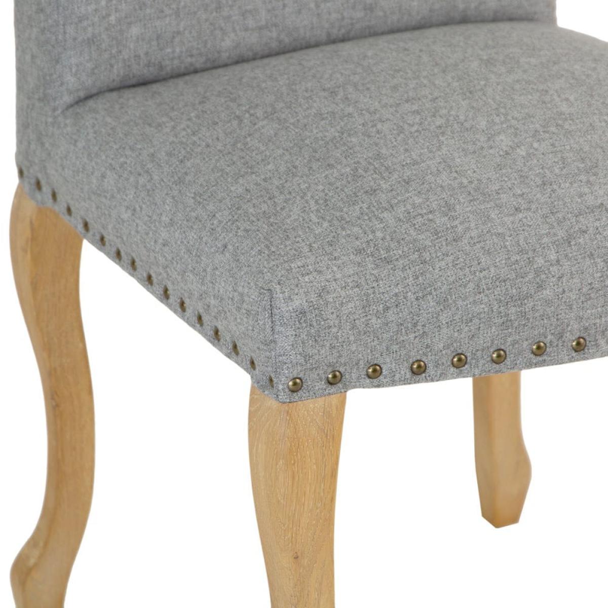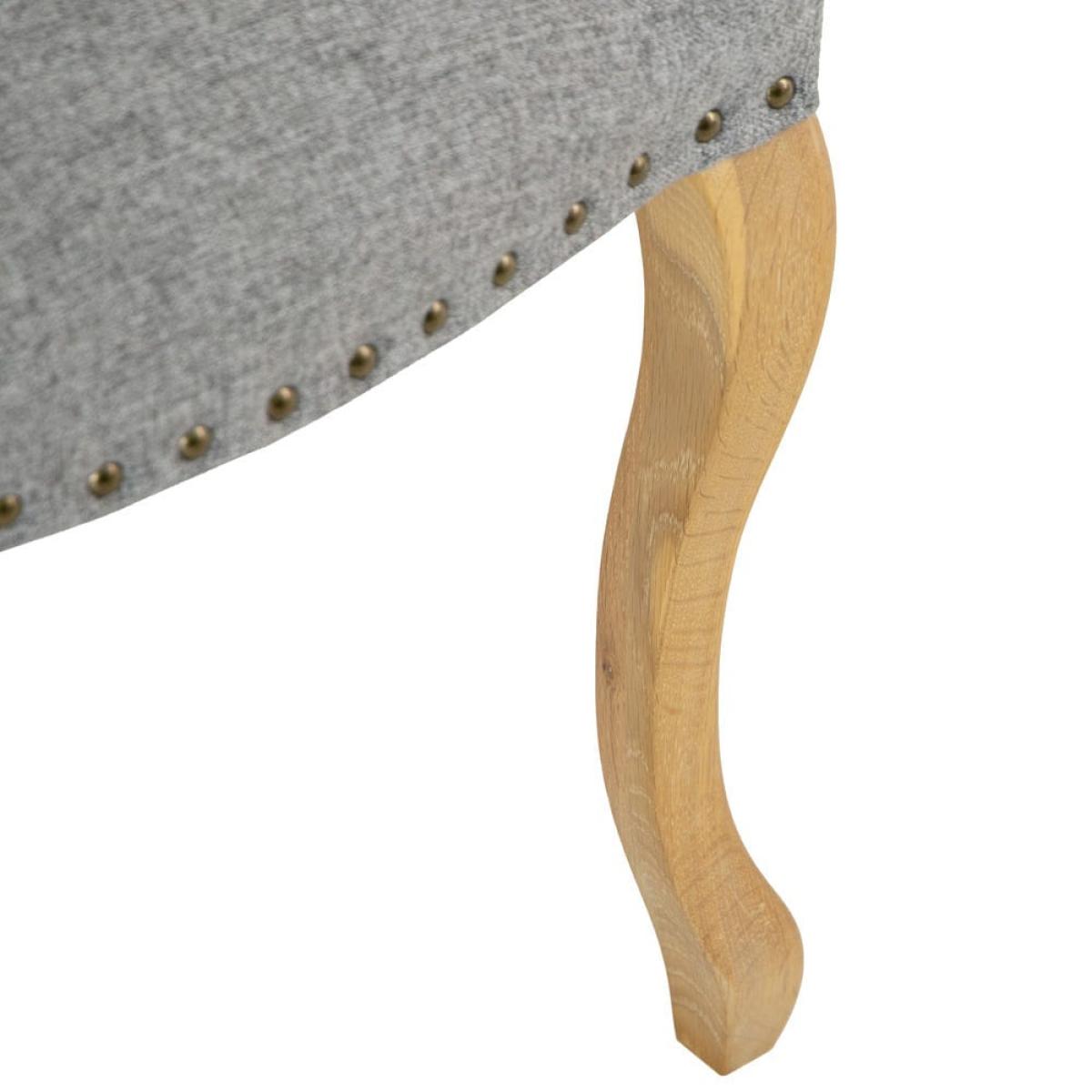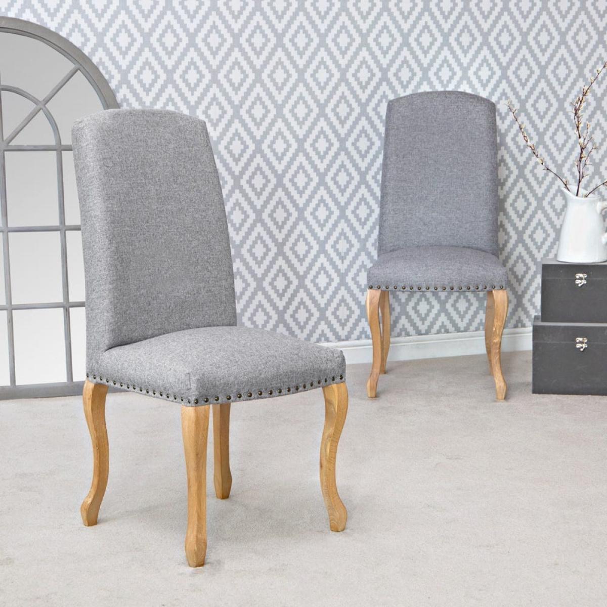 This elegant Lucerne light grey luxury dining chair with studs promises to sit pretty at your dining table. Pale upholstery fabric is paired with our solid oak legs to bring freshness and light to any style of space. Metal studding around the base of seat, along with the bow-shaped legs, add classic details to the modern dove-grey hue. This chair is generously padded to keep your dinner guests sitting comfortably, and its adaptable design complements any style of dining table. You can also use it on its own in your living room to show off its eye-catching features in full.